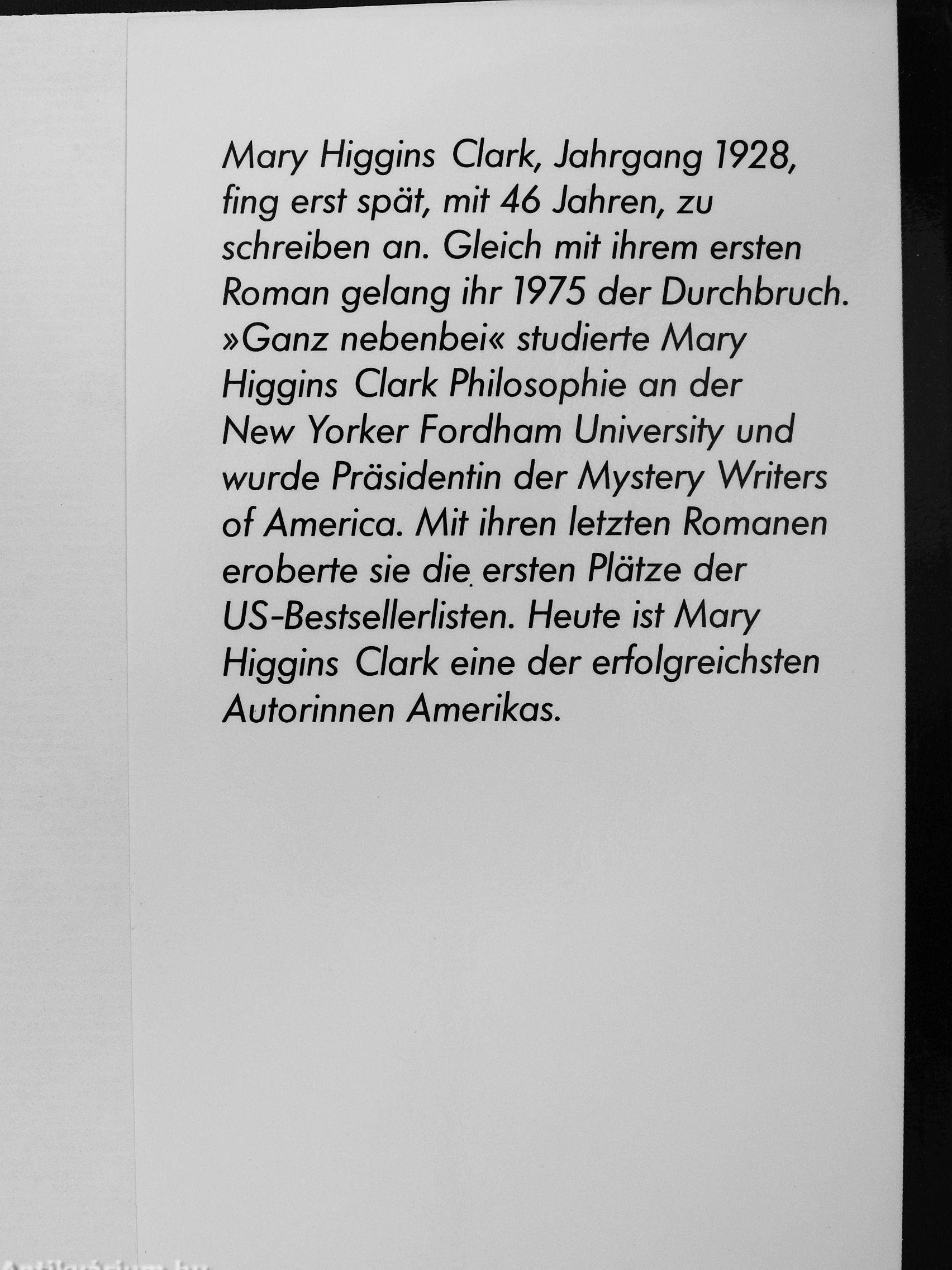 Mary Higgins Clark, Jahrgang 1928, fing erst spät, mit 46 Jahren, zu schreiben an. Gleich mit ihrem ersten Roman gelang ihr 1975 der Durchbruch. »Ganz nebenbei« studierte Mary Higgins Clark Philosophie an der New Yorker Fordham University und wurde Präsidentin der Mystery Writers of America. Mit ihren letzten Romanen eroberte sie die, ersten Plätze der US-Bestsellerlisten. Heute ist Mary Higgins Clark eine der erfolgreichsten Autorinnen Amerikas.