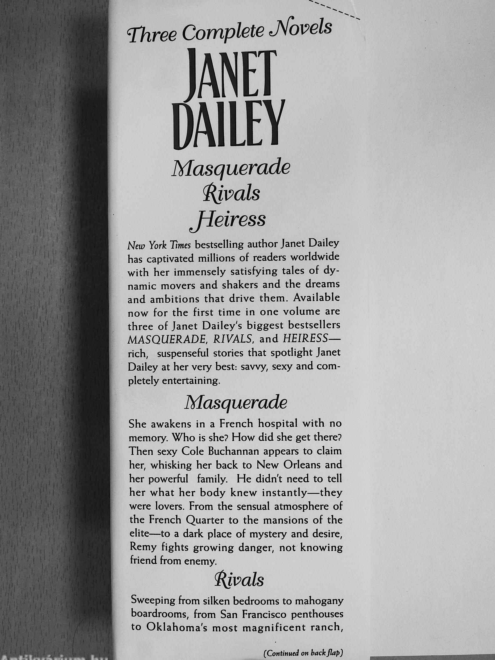 New York Times bestselling author Janet Dailey has captivated minions of readers worldwide with her immensely satisfying tales of dynamic movers and shakers and the dreams and ambitions that drive them. Available now for the first time in one volume are three of Janet Dailey's biggest bestsellers MASQUERADE. RIVALS, and HEIRESS— rich, suspenseful stories that spotlight Janet Dailey at her very best: sawy, sexy and completely entertaining.