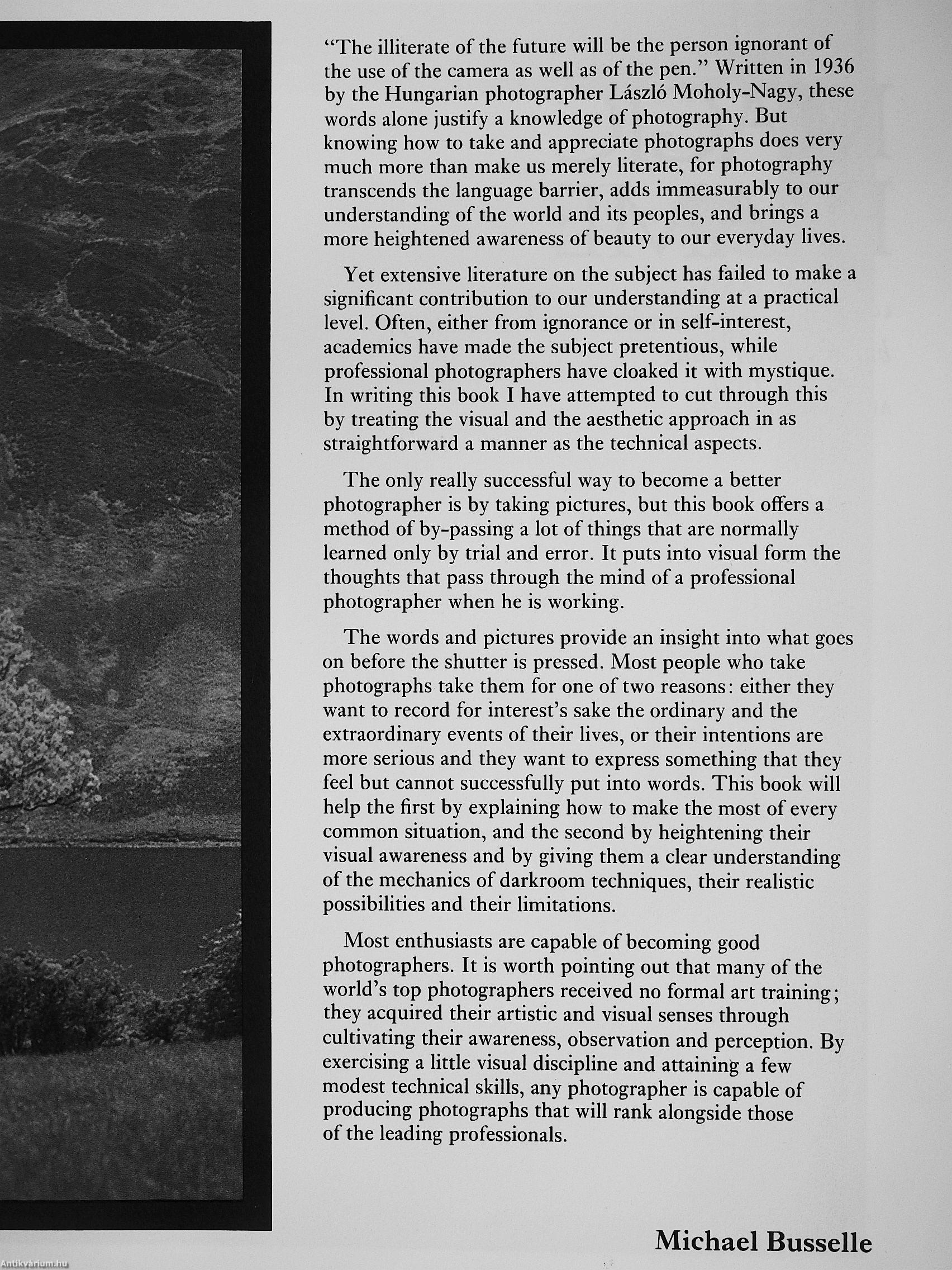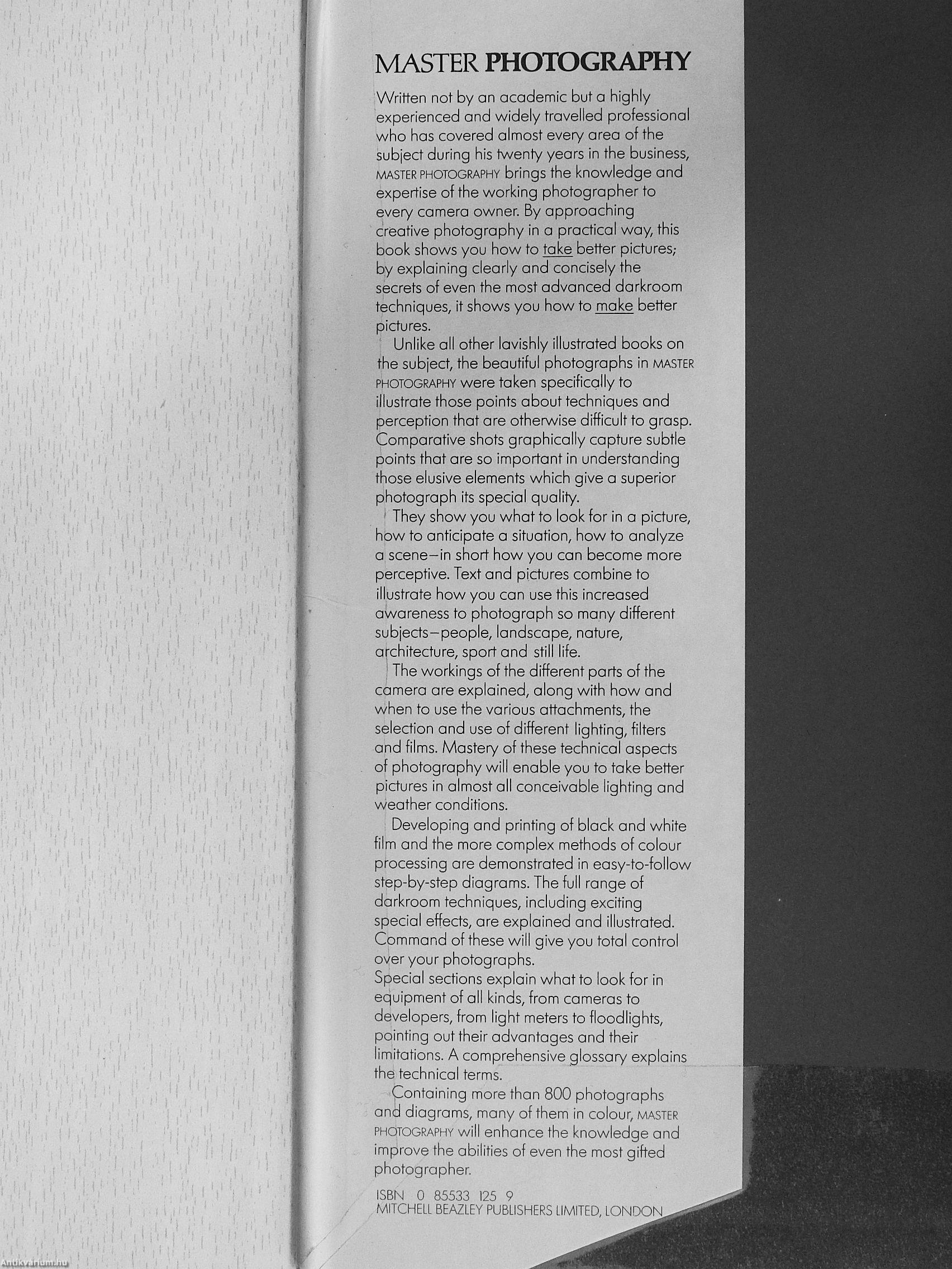 Written not by an academic but a highly experienced and widely travelled professional who has covered almost every area of the subject during his twenty years in the business, master photography brings the knowledge and expertise of the working photographer to every camera owner. By approaching creative photography in a practical way, this book shows you how to take better pictures; by explaining dearly and concisely the secrets of even the most advanced darkroom techniques, it shows you how to make better pictures.