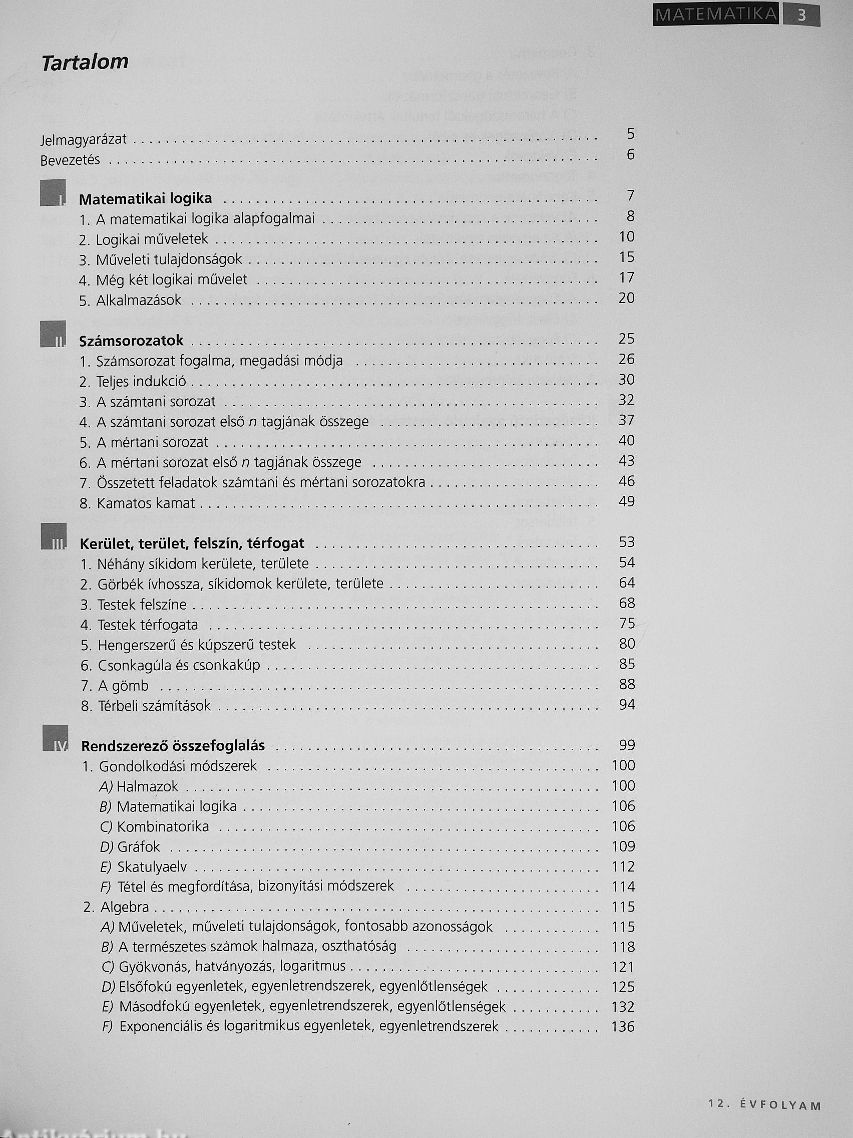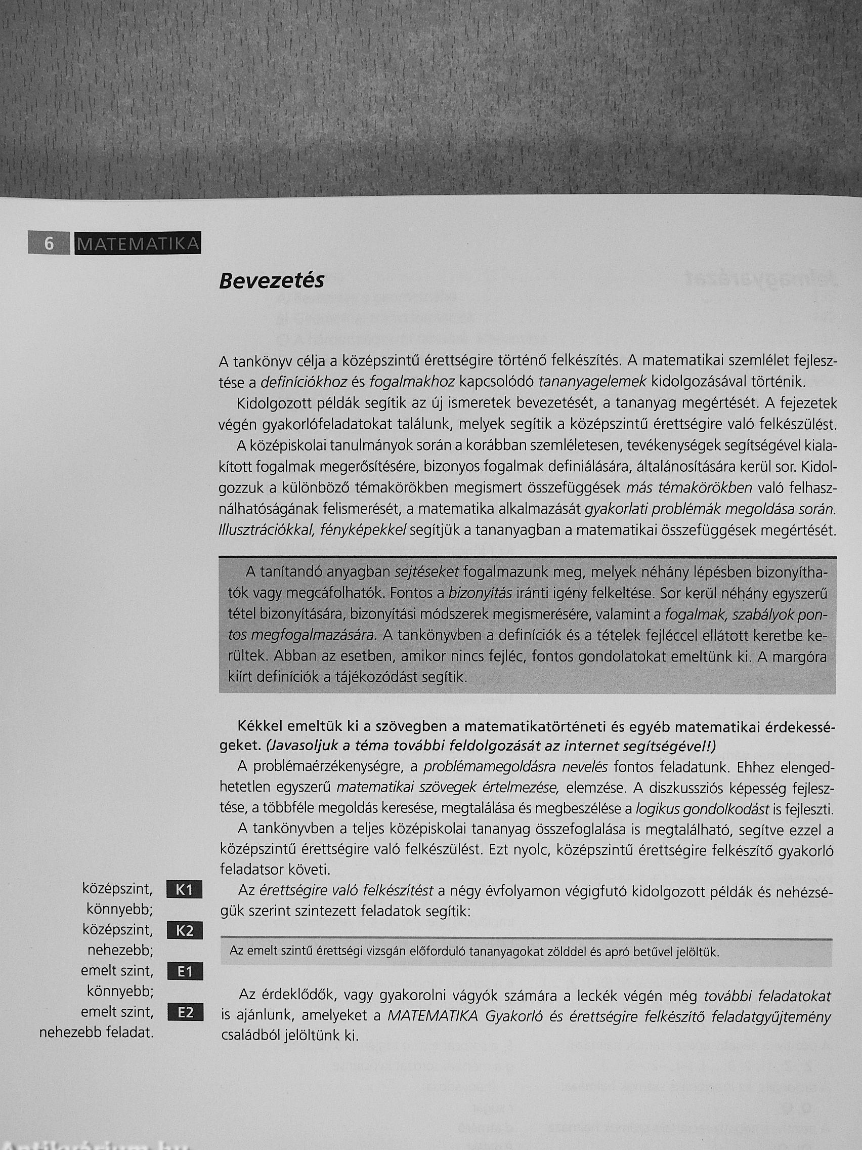 Kidolgozott példák segítik az új ismeretek bevezetését, a tananyag megértését. A fejezetek végén gyakorlófeladatokat találunk, melyek segítik a középszintű érettségire való felkészülést A középiskolai tanulmányok során a korábban szemléletesen, tevékenységek segítségével kiala kított fogalmak megerősítésére, bizonyos fogalmak definiálására, általánosítására kerül sor. Kidől gozzuk a különböző témakörökben megismert összefüggések más témakörökben való felhasz nálhatóságának felismerését, a matematika alkalmazását gyakorlati problémák megoldása során Illusztrációkkal, fényképekkel segítjük a tananyagban a matematikai összefüggések megértését
