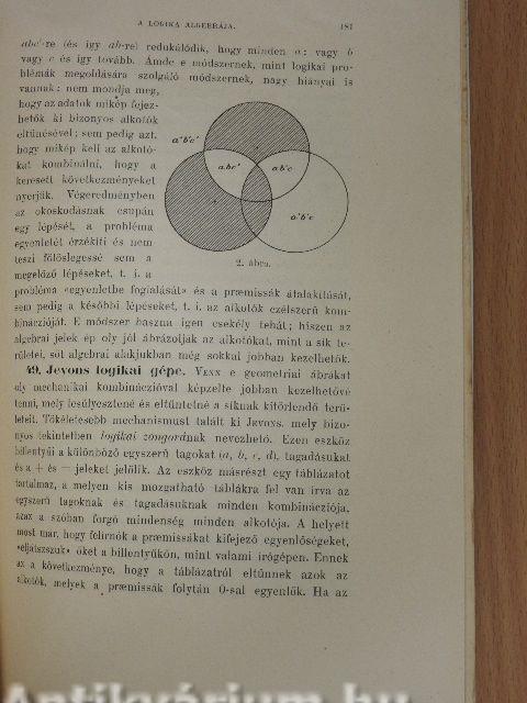 1. Bevezetés. A logika algebráját George Boole (1815-1864) alapította meg, továbbfejlesztette és tökéletesítette Ernst Schröder (1841-1902). E kalkulus alaptörvényeit az okoskodás elveinek, a "gondolkodás törvényeinek" kifejezésére alkották meg, de tisztán formális (mathematikai) álláspontból is tekinthető, mint néhány tetszőlegesen választott elven nyugvó algebra. Hogy e kalkulus megfelel-e és hogy milyen mértékben felel meg az ész tényleges műveleteinek és hogy alkalmas-e kifejezni, sőt helyettesíteni az okoskodást, az tisztán philosophiai kérdés; mi nem ezt fogjuk vizsgálni. Formális értéke és haszna a mathematikus számára teljesen független interpretácziójától és a logika problémáira való alkalmazásától. Egy szóval: nem mint logikát, hanem mint algebrát fogjuk kifejteni. Vissza