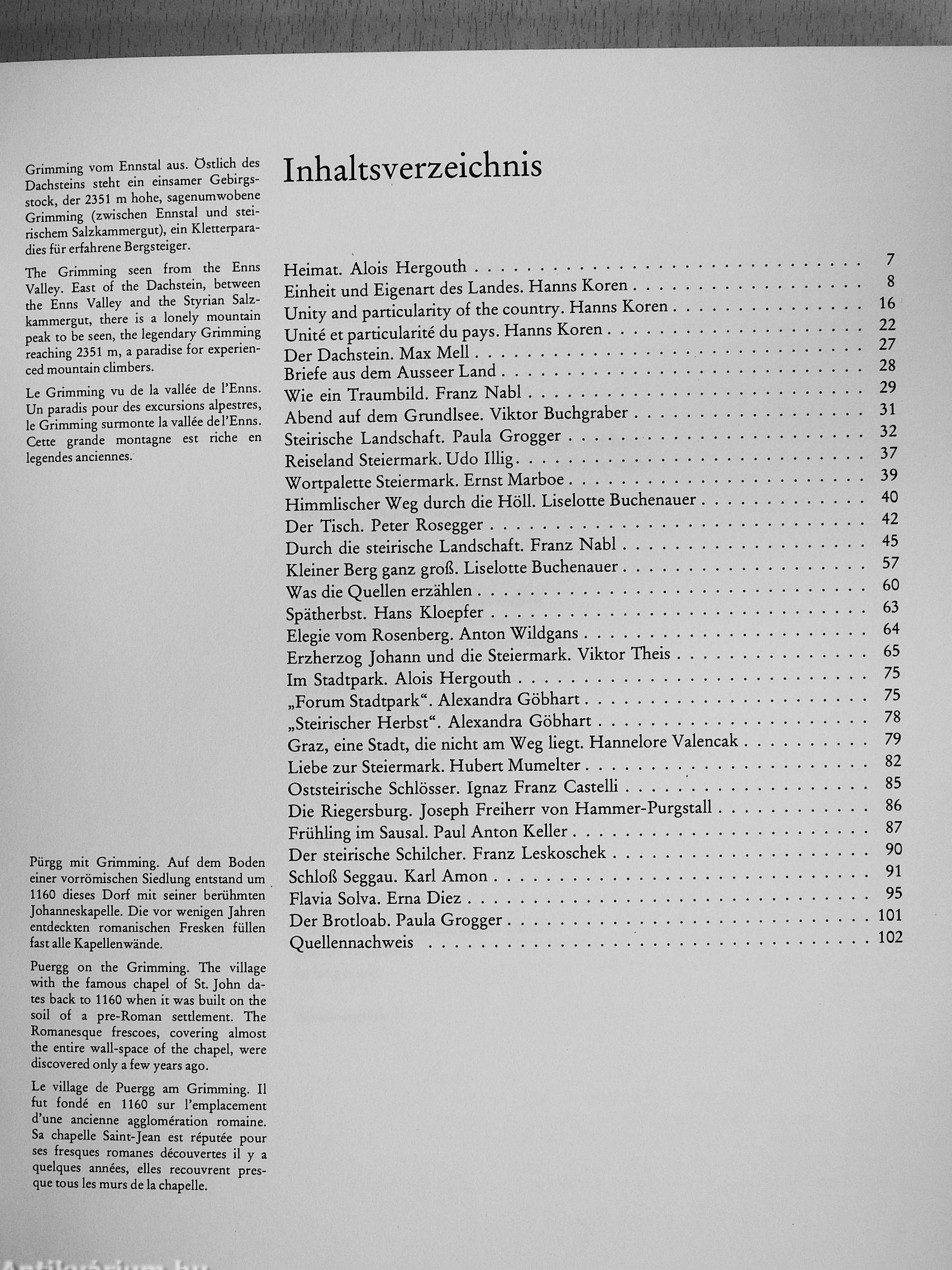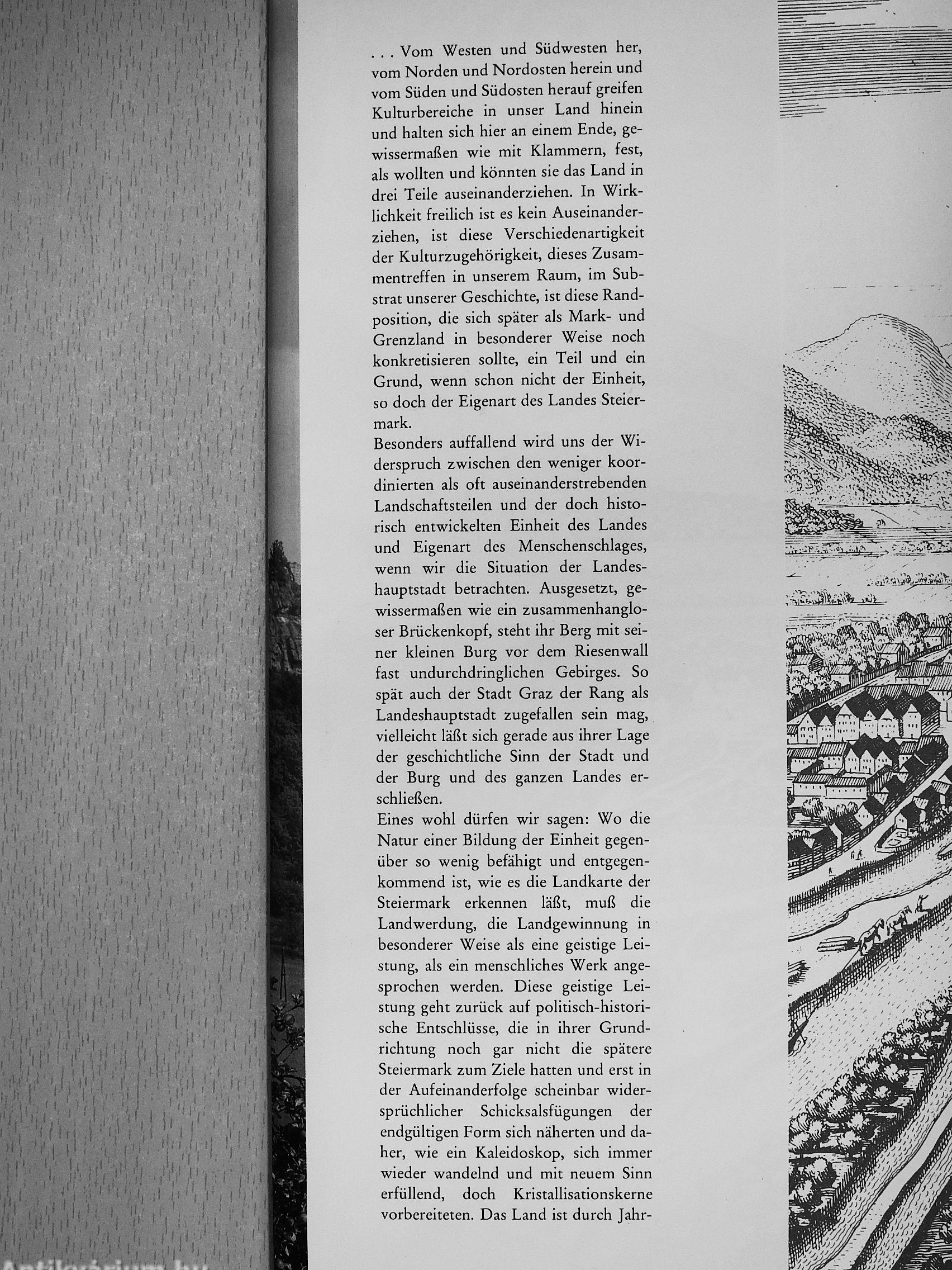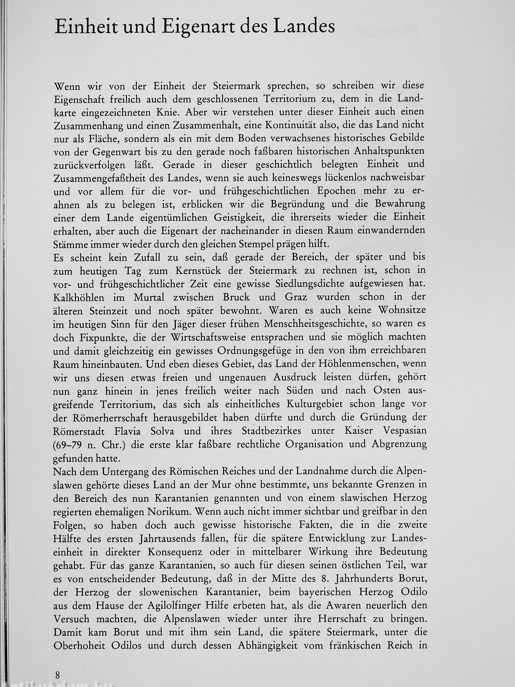 . . . Vom Westen und Südwesten her, vom Norden und Nordosten herein und vom Süden und Südosten herauf greifen Kulturbereiche in unser Land hinein und halten sich hier an einem Ende, gewissermaßen wie mit Klammern, fest, als wollten und könnten sie das Land in drei Teile auseinanderziehen. In Wirklichkeit freilich ist es kein Auseinanderziehen, ist diese Verschiedenartigkeit der Kulturzugehörigkeit, dieses Zusammentreffen in unserem Raum, im Substrat unserer Geschichte, ist diese Randposition, die sich später als Mark- und Grenzland in besonderer Weise noch konkretisieren sollte, ein Teil und ein Grund, wenn schon nicht der Einheit, so doch der Eigenart des Landes Steiermark.