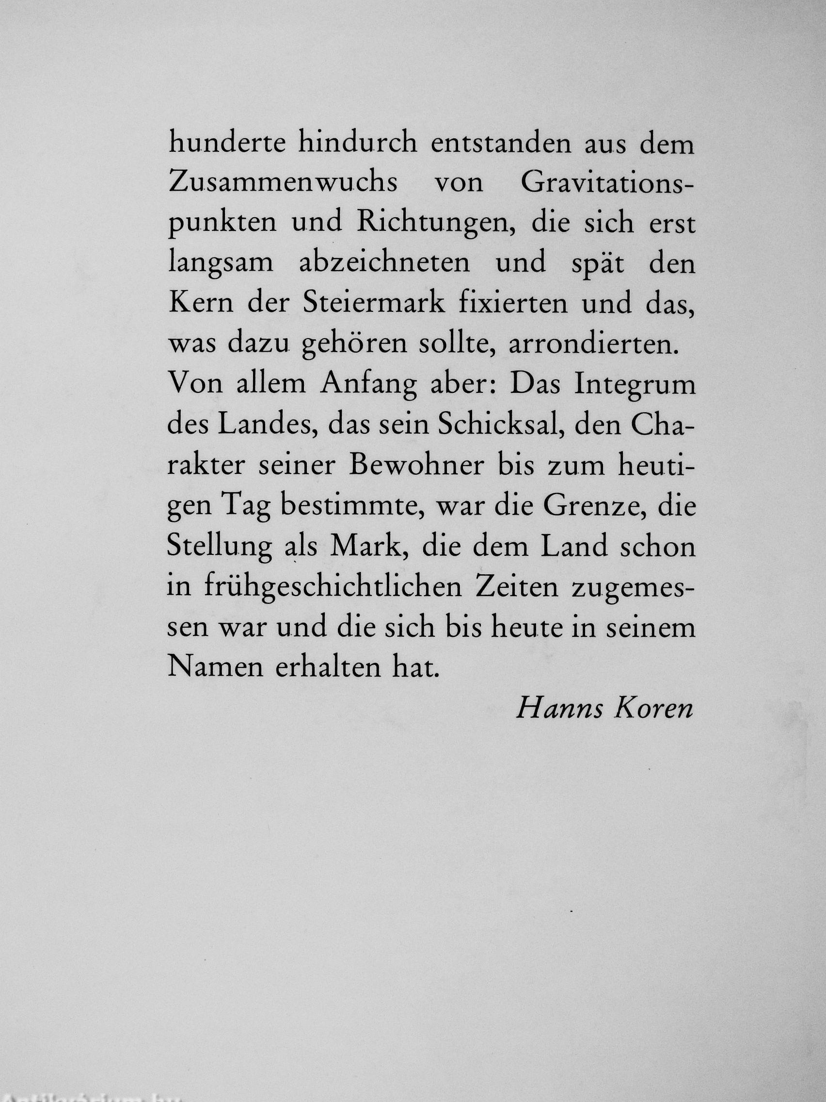 hunderte hindurch entstanden aus dem Zusammenwuchs von Gravitationspunkten und Richtungen, die sich erst langsam abzeichneten und spät den Kern der Steiermark fixierten und das, was dazu gehören sollte, arrondierten. Von allem Anfang aber: Das Integrum des Landes, das sein Schicksal, den Charakter seiner Bewohner bis zum heutigen Tag bestimmte, war die Grenze, die Stellung als Mark, die dem Land schon in frühgeschichtlichen Zeiten zugemessen war und die sich bis heute in seinem Namen erhalten hat.