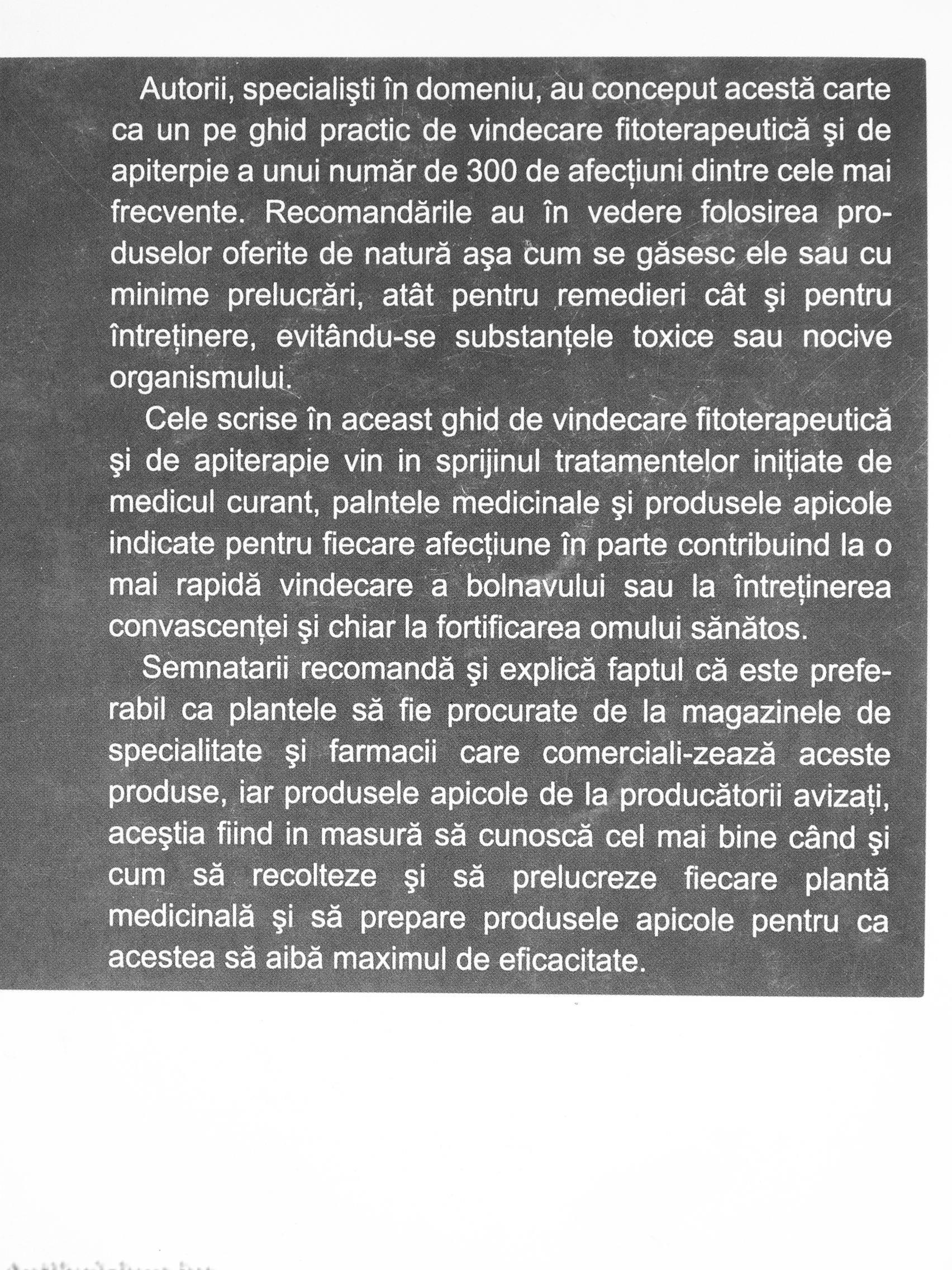 Cele scrise în aceast ghid de vindecare fitoterapeutica §i de apiterapie vin in sprijinul tratamentelor initiate de medicui curant, paintele riiedicinale §i produseie apicole indicate pentru flecare afectiune în parte contribuind la o mai rapida vindecare a boinavului sau la întretinerea convascentei §i chiar la fortiflcarea omului sanatos.