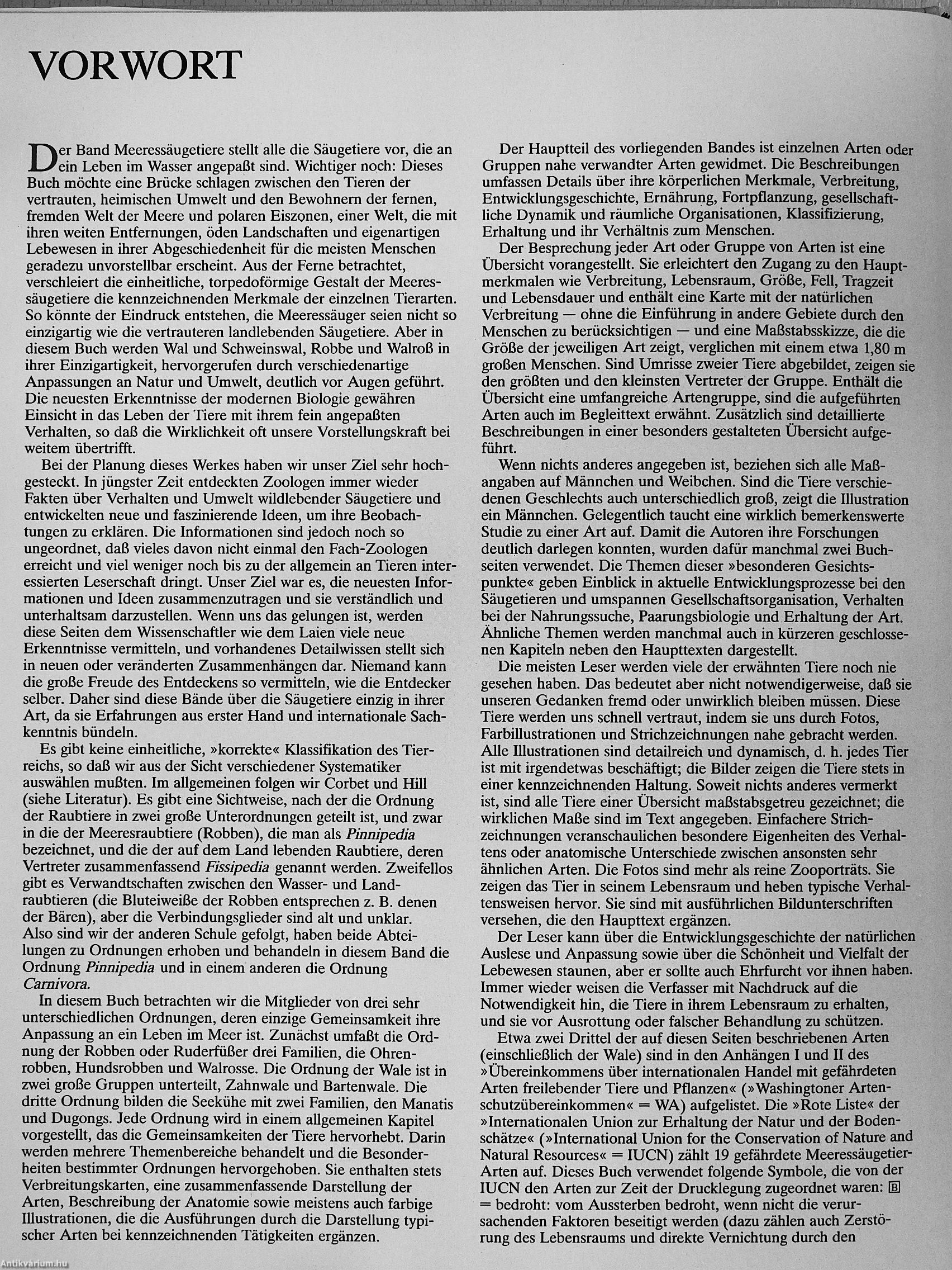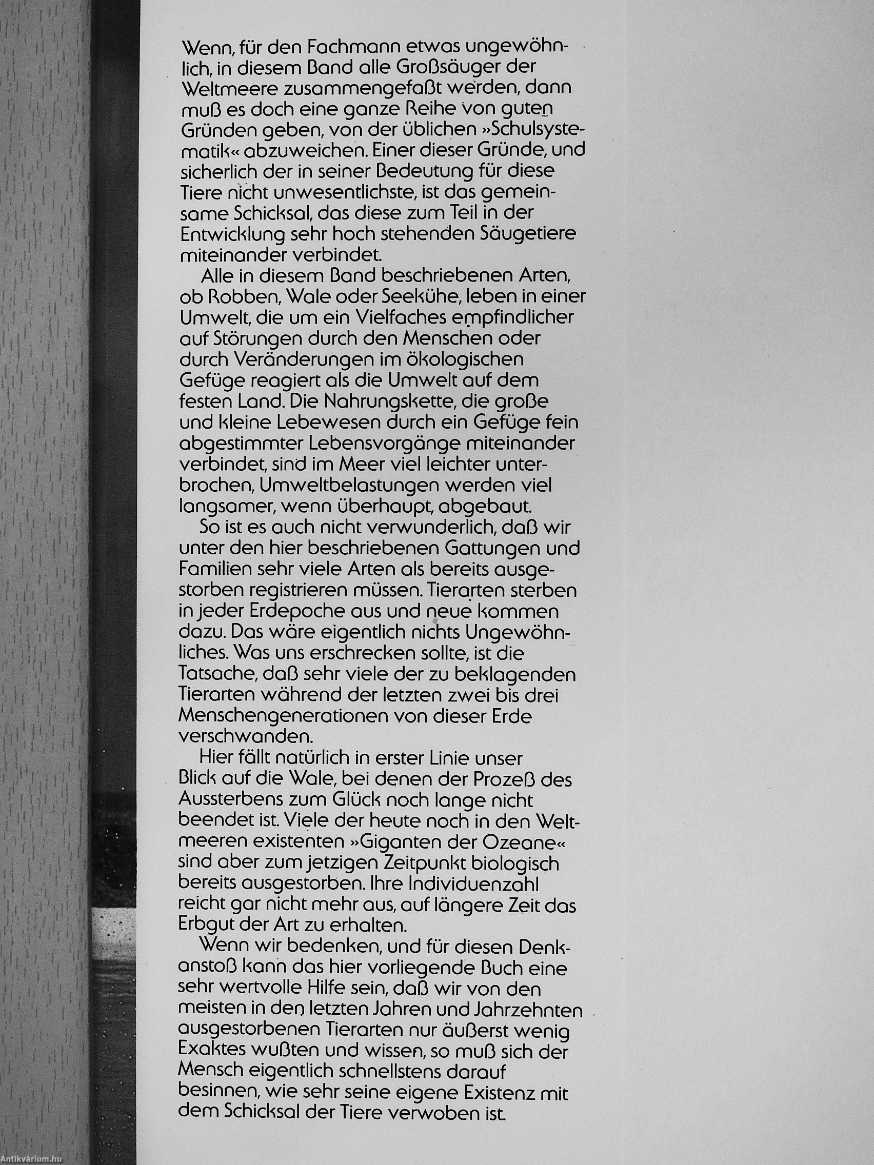 Alle in diesem Bond beschriebenen Arten, ob Robben, Wale oder Seekühe, leben in einer Umwelt, die um ein Vielfaches empfindlicher ouf Störungen durch den Menschen oder durch Veränderungen im ökologischen Gefüge reagiert als die Umwelt auf dem festen Land. Die Nahrungskette, die große und kleine Lebewesen durch ein Gefüge fein abgestimmter Lebensvorgönge miteinander verbindet, sind im Meer viel leichter unterbrochen, Umweltbelostungen werden viel langsamer, wenn überhaupt, abgebaut.