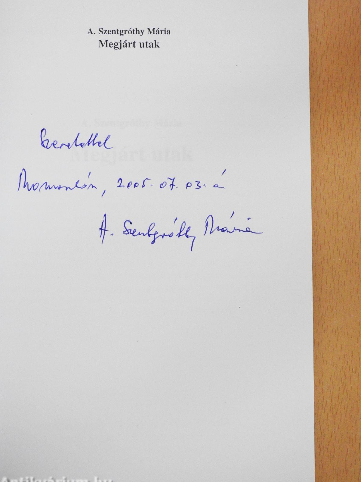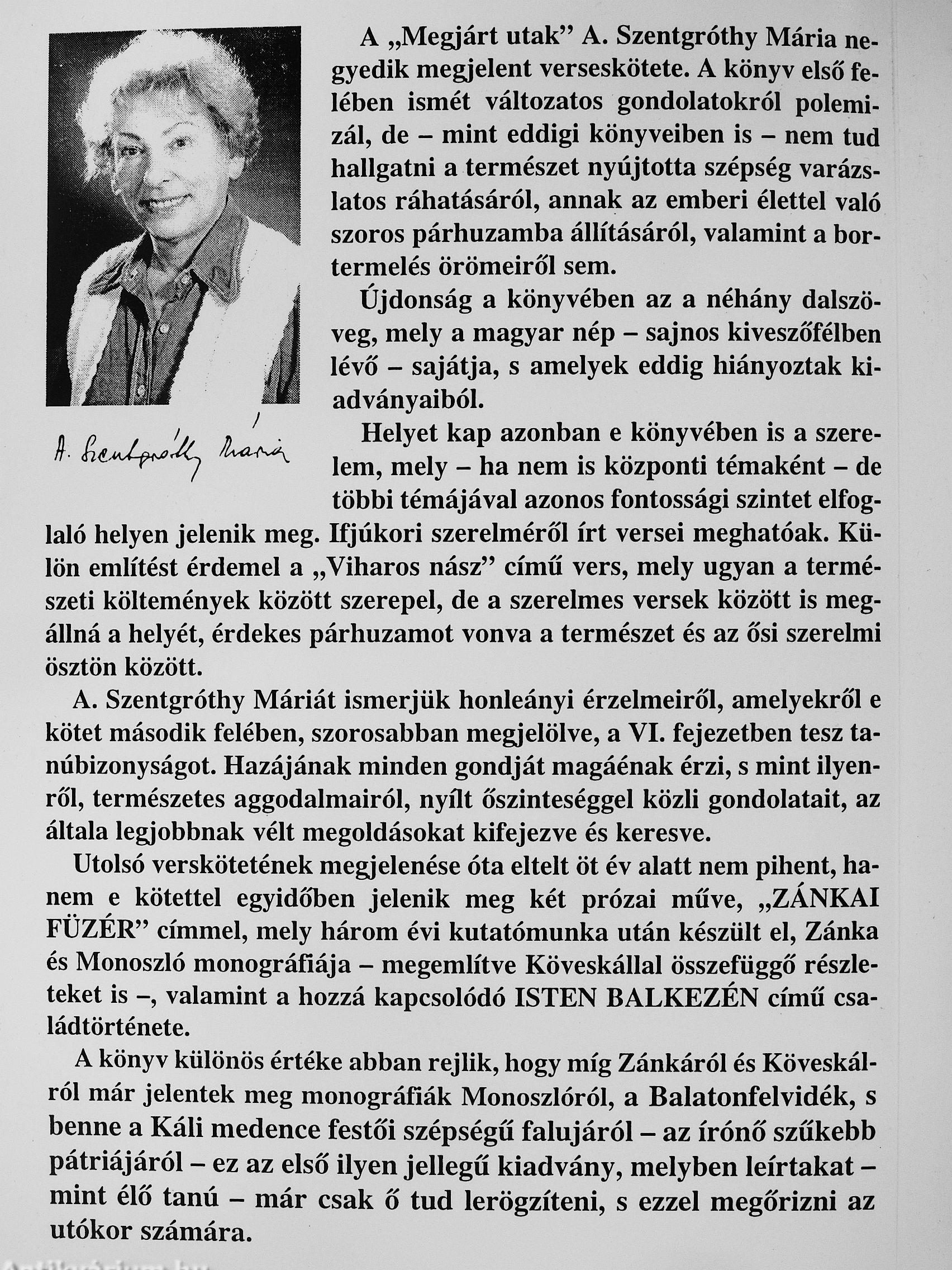 A „Megjárt utak" A. Szentgróthy Mária negyedik megjelent verseskötete. A könyv első felében ismét változatos gondolatokról polemizál, de - mint eddigi könyveiben is - nem tud hallgatni a természet nyújtotta szépség varázslatos ráhatásáról, annak az emberi élettel való szoros párhuzamba állításáról, valamint a bortermelés örömeiről sem.