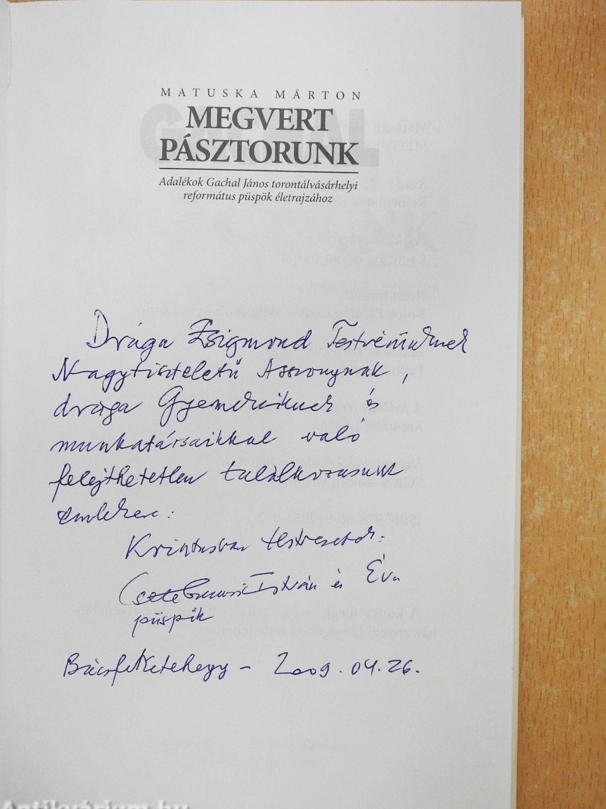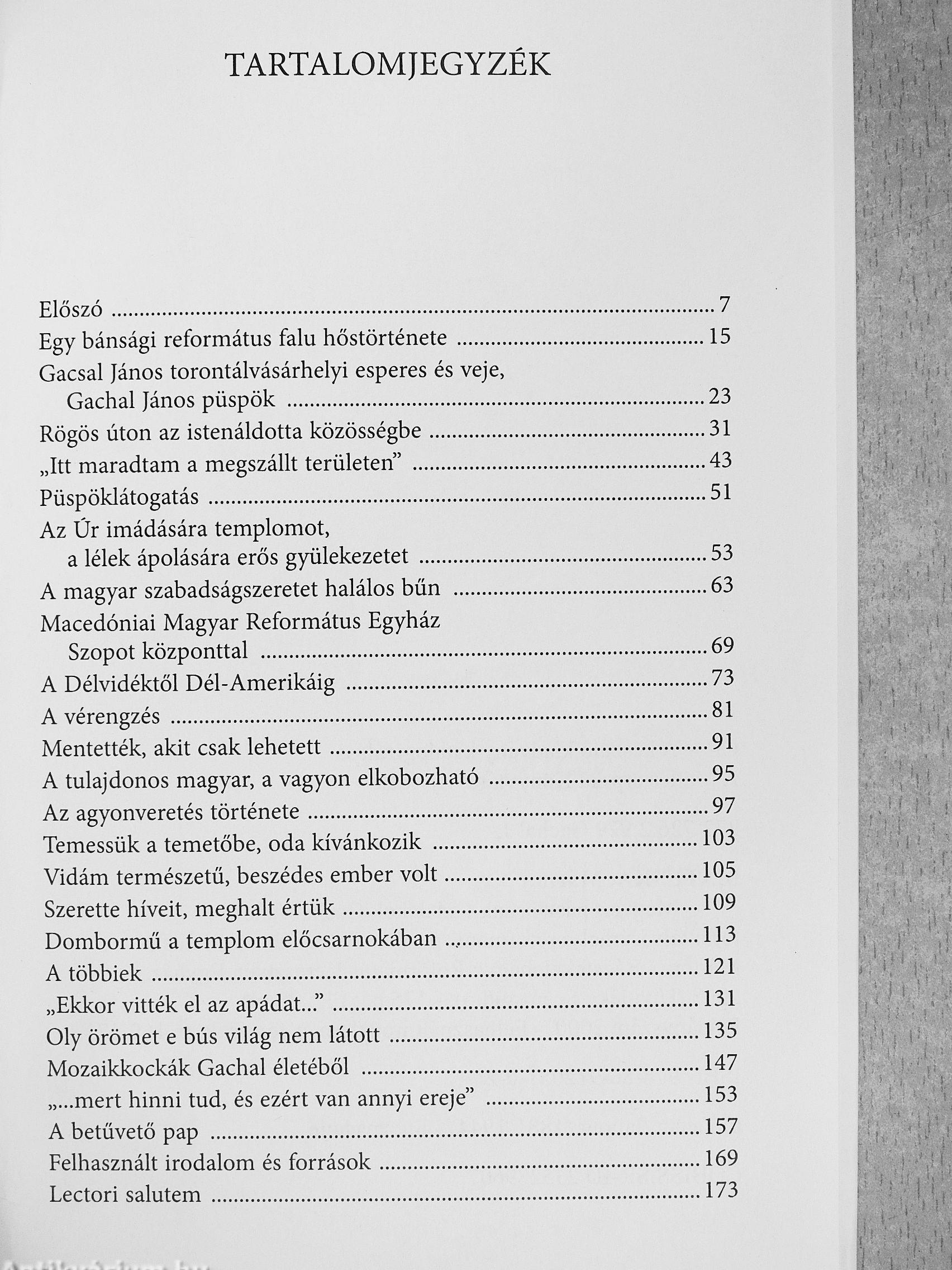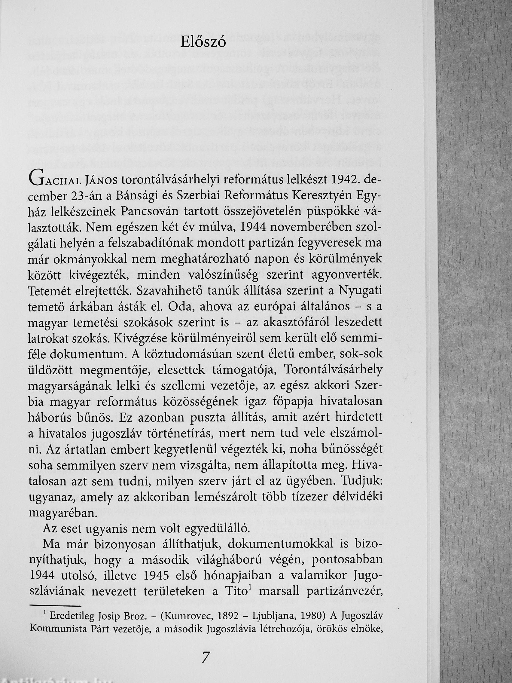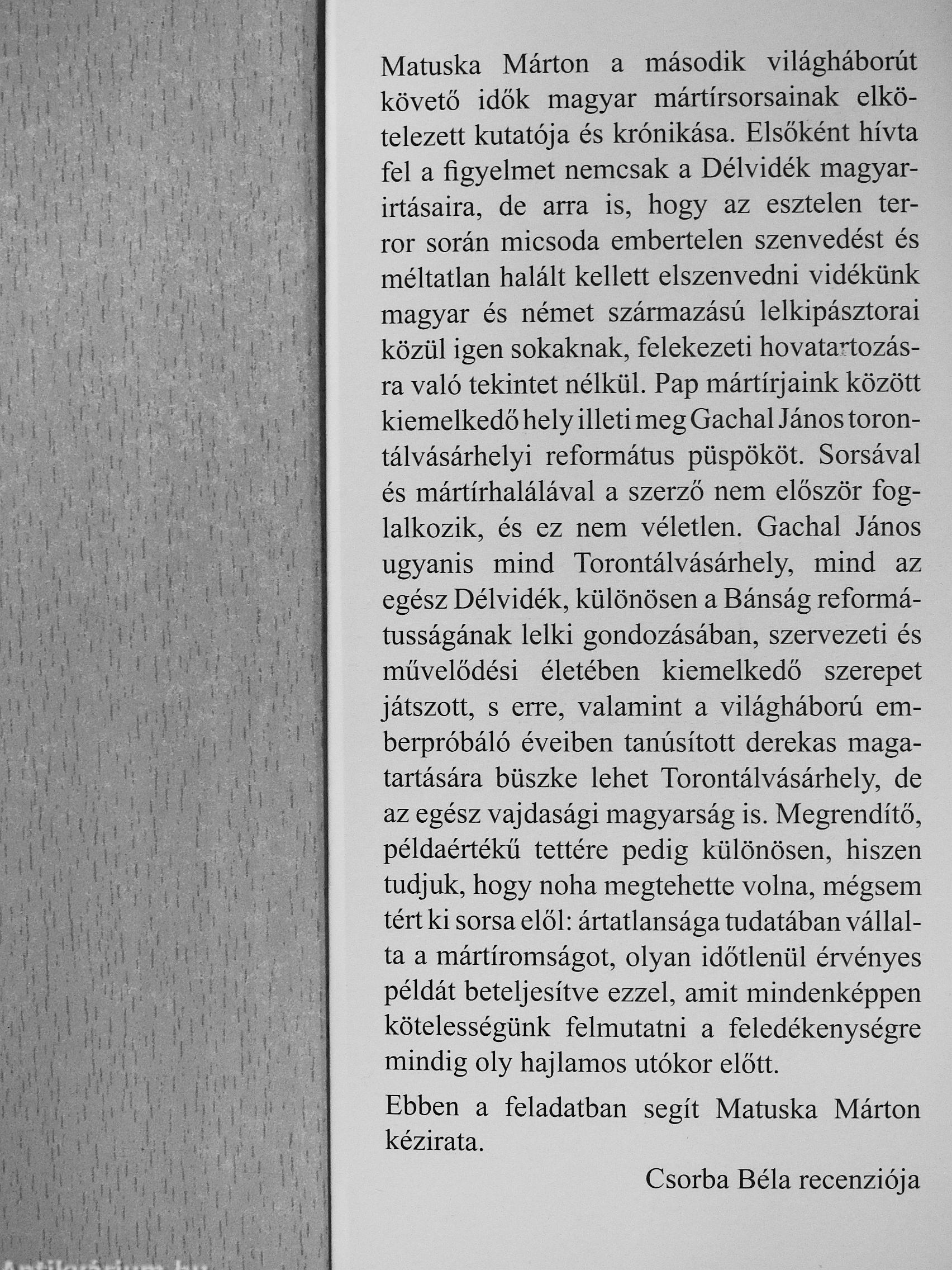 Matuska Márton a második világháborút követő idők magyar mártírsorsainak elkötelezett kutatója és krónikása. Elsőként hívta fel a figyelmet nemcsak a Délvidék magyarirtásaira, de arra is, hogy az esztelen terror során micsoda embertelen szenvedést és méltatlan halált kellett elszenvedni vidékünk magyar és német származású lelkipásztorai közül igen sokaknak, felekezeti hovatartozásra való tekintet nélkül. Pap mártírjaink között kiemelkedő hely illeti meg Gachal János torontálvásárhelyi református püspököt. Sorsával és mártírhalálával a szerző nem először foglalkozik, és ez nem véletlen. Gachal János ugyanis mind Torontálvásárhely, mind az egész Délvidék, különösen a Bánság reformá-tusságának lelki gondozásában, szervezeti és művelődési életében kiemelkedő szerepet játszott, s erre, valamint a világháború emberpróbáló éveiben tanúsított derekas magatartására büszke lehet Torontálvásárhely, de az egész vajdasági magyarság is. Megrendítő, példaértékű tettére pedig különösen, hiszen tudjuk, hogy noha megtehette volna, mégsem tért ki sorsa elől: ártatlansága tudatában vállalta a mártíromságot, olyan időtlenül érvényes példát beteljesítve ezzel, amit mindenképpen kötelességünk felmutatni a feledékenységre mindig oly hajlamos utókor előtt.