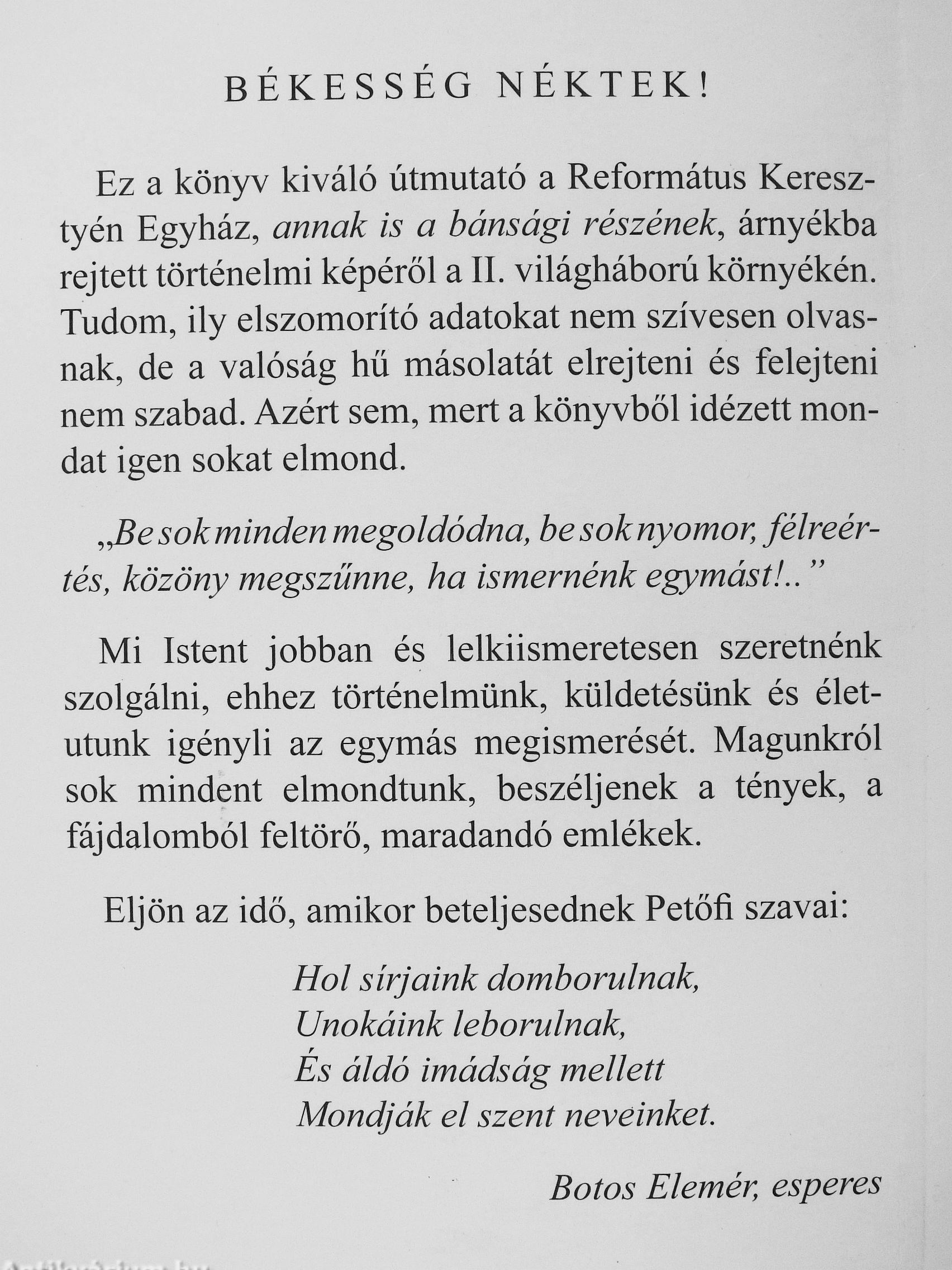 Ez a könyv kiváló útmutató a Református Keresztyén Egyház, annak is a bánsági részének, árnyékba rejtett történelmi képéről a 11. világháború környékén. Tudom, ily elszomorító adatokat nem szívesen olvasnak, de a valóság hü másolatát elrejteni és felejteni nem szabad. Azért sem, mert a könyvből idézett mondat igen sokat elmond.