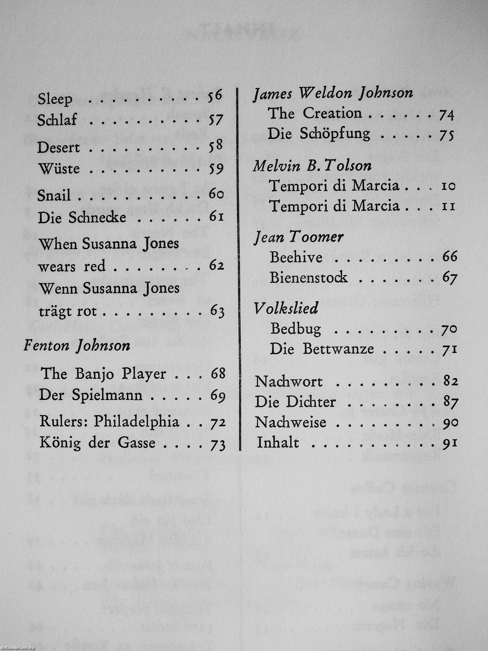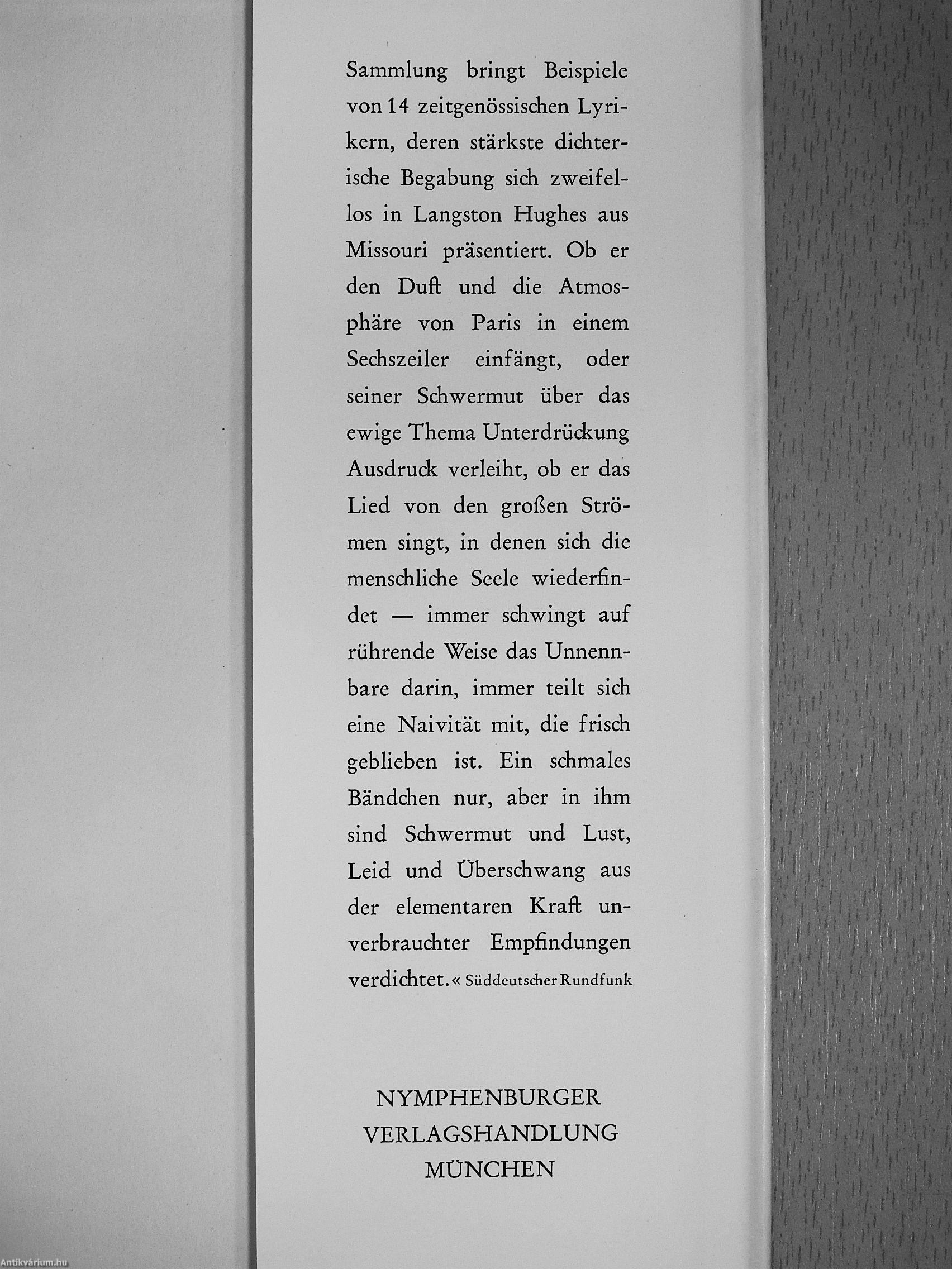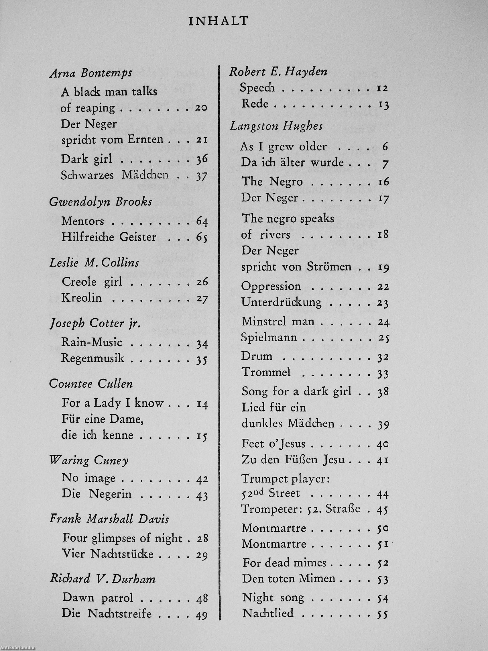 Sammlung bringt Beispiele von 14 zeitgenössischen Lyrikern, deren stärkste dichterische Begabung sich zweifellos in Langston Hughes aus Missouri präsentiert. Ob er den Duft und die Atmosphäre von Paris in einem Sechszeiler einfängt, oder seiner Schwermut über das ewige Thema Unterdrückung Ausdruck verleiht, ob er das Lied von den großen Strömen singt, in denen sidi die menschliche Seele wiederfindet — immer schwingt auf rührende Weise das Unnennbare darin, immer teilt sich eine Naivität mit, die frisch geblieben ist. Ein schmales Bändchen nur, aber in ihm sind Schwermut und Lust, Leid und Überschwang aus der elementaren Kraft unverbrauchter Empfindungen verdichtet.« Süddeutscher Rundfunk