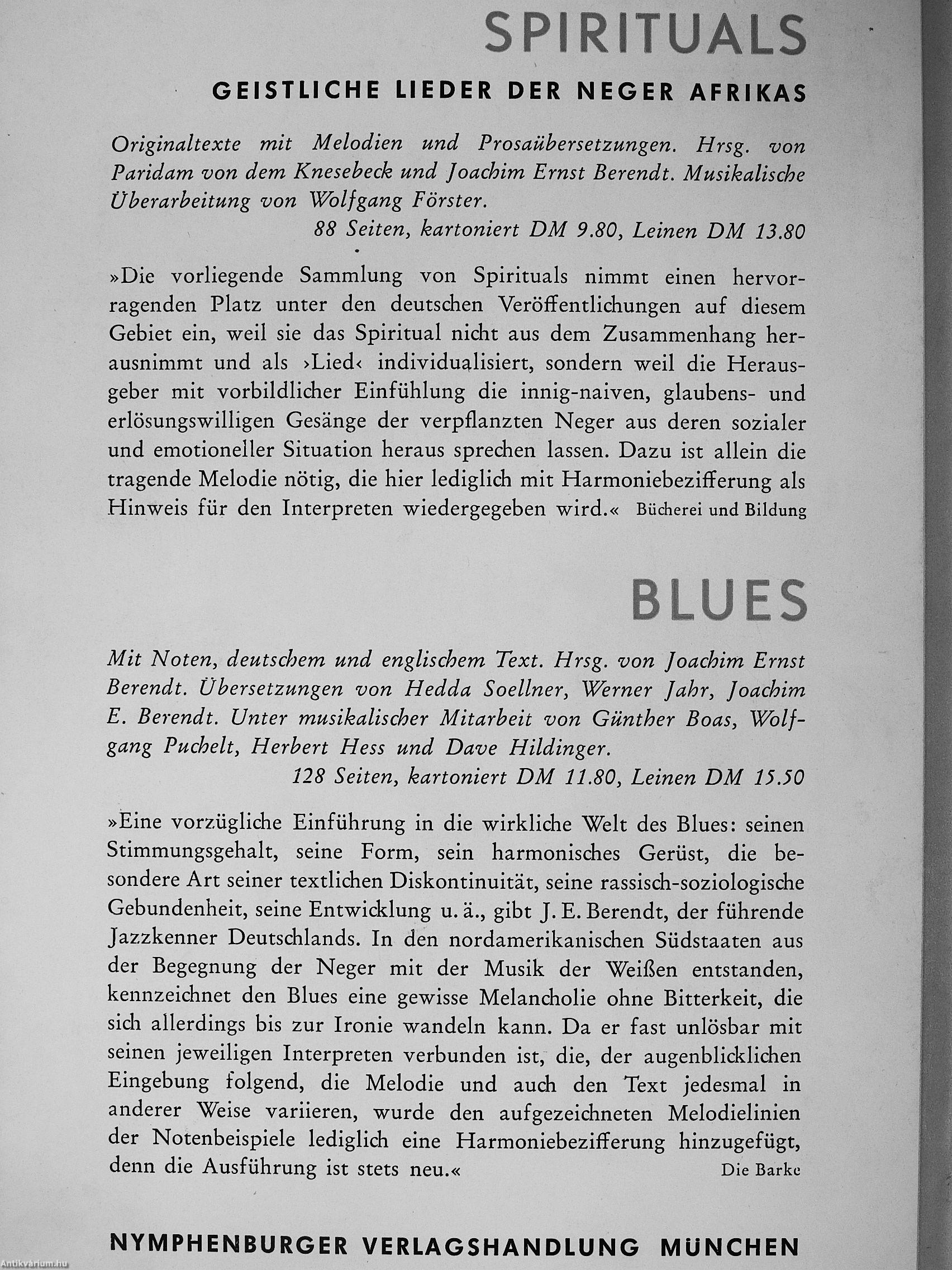 Mit Noten, deutschem und englischem Text. Hrsg. von Joachim Ernst Berendt. Übersetzungen von Hedda Soellner, Werner Jahr, Joachim E. Berendt. Unter musikalischer Mitarbeit von Günther Boas, Wolfgang Puchelt, Herbert Hess und Dave Hildinger.
