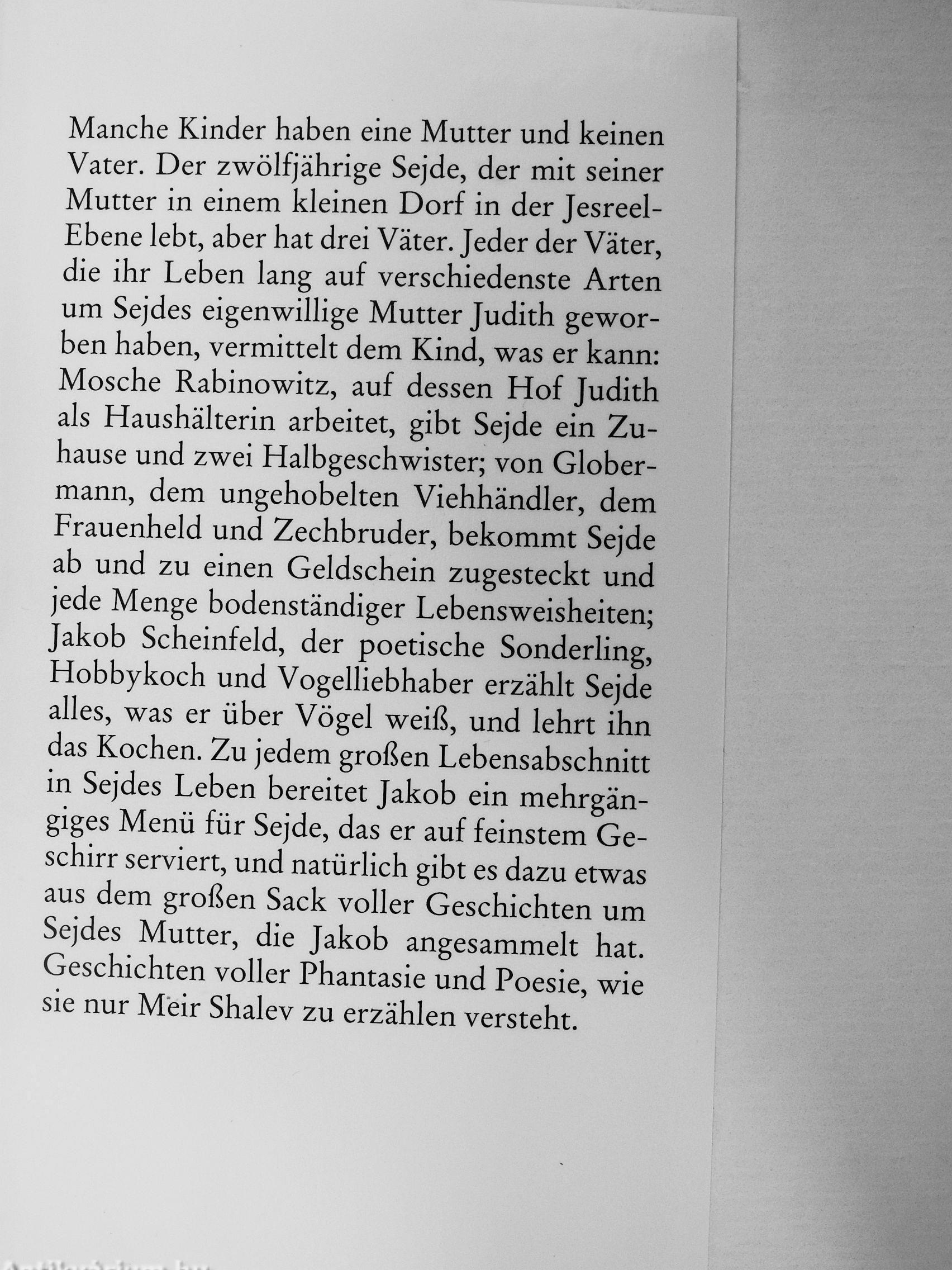 Manche Kinder haben eine Mutter und keinen Vater. Der zwölfjährige Sejde, der mit seiner Mutter in einem kleinen Dorf in der Jesreel-Ebene lebt, aber hat drei Väter. Jeder der Väter, die ihr Leben lang auf verschiedenste Arten um Sejdes eigenwillige Mutter Judith geworben haben, vermittelt dem Kind, was er kann: Mosche Rabinowitz, auf dessen Hof Judith als Haushälterin arbeitet, gibt Sejde ein Zuhause und zwei Halbgeschwister; von Glober-mann, dem ungehobelten Viehhändler, dem Frauenheld und Zechbruder, bekommt Sejde ab und zu einen Geldschein zugesteckt und jede Menge bodenständiger Lebensweisheiten; Jakob Scheinfeld, der poetische SonderHng, Hobbykoch und Vogelliebhaber erzählt Sejde alles, was er über Vögel weiß, und lehrt ihn das Kochen. Zu jedem großen Lebensabschnitt in Sejdes Leben bereitet Jakob ein mehrgängiges Menü für Sejde, das er auf feinstem Geschirr serviert, und natürlich gibt es dazu etwas aus dem großen Sack voller Geschichten um Sejdes Mutter, die Jakob angesammelt hat. Geschichten voller Phantasie und Poesie, wie sie nur M'eir Shalev zu erzählen versteht.