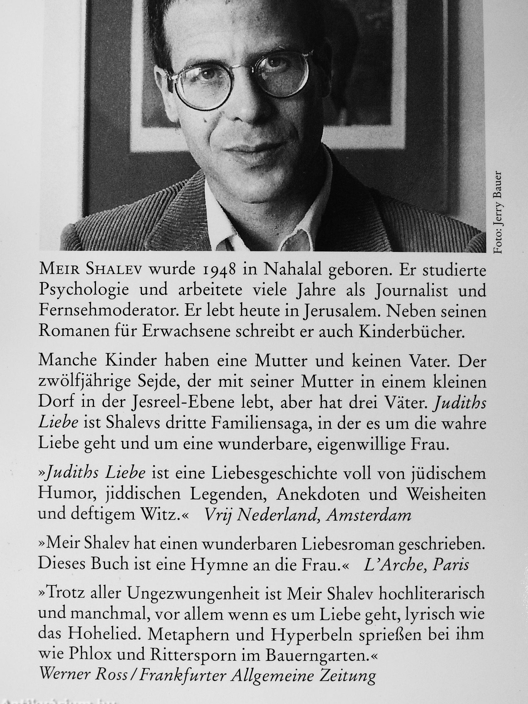 Manche Kinder haben eine Mutter und keinen Vater. Der zwölfjährige Sejde, der mit seiner Mutter in einem kleinen Dorf in der Jesreel-Ebene lebt, aber hat drei Väter. Judiths Liebe ist Shalevs dritte Familiensaga, in der es um die wahre Liebe geht und um eine wunderbare, eigenwillige Frau.
