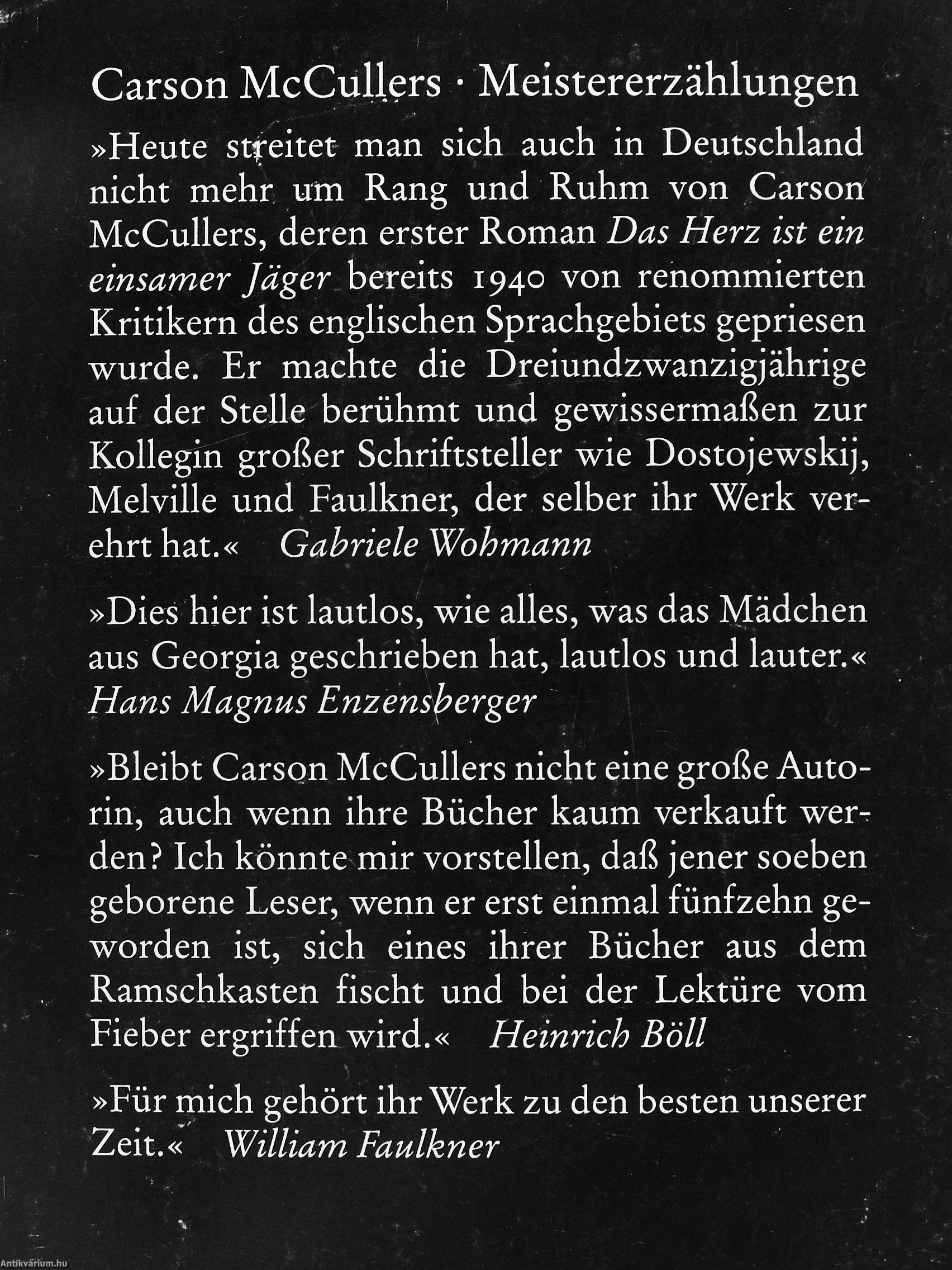 »Heute streitet man sich auch in Deutschland nicht mehr um Rang und Ruhm von Carson McCullers, deren erster Roman Das Herz ist ein einsamer Jäger bereits 1940 von renommierten Kritikern des englischen Sprachgebiets gepriesen wurde. Er machte die Dreiundzwanzigjährige auf der Stelle berühmt und gewissermaßen zur Kollegin großer Schriftsteller wie Dostojewski), Melville und Faulkner, der selber ihr Werk verehrt hat.« Gabriele Wohmann