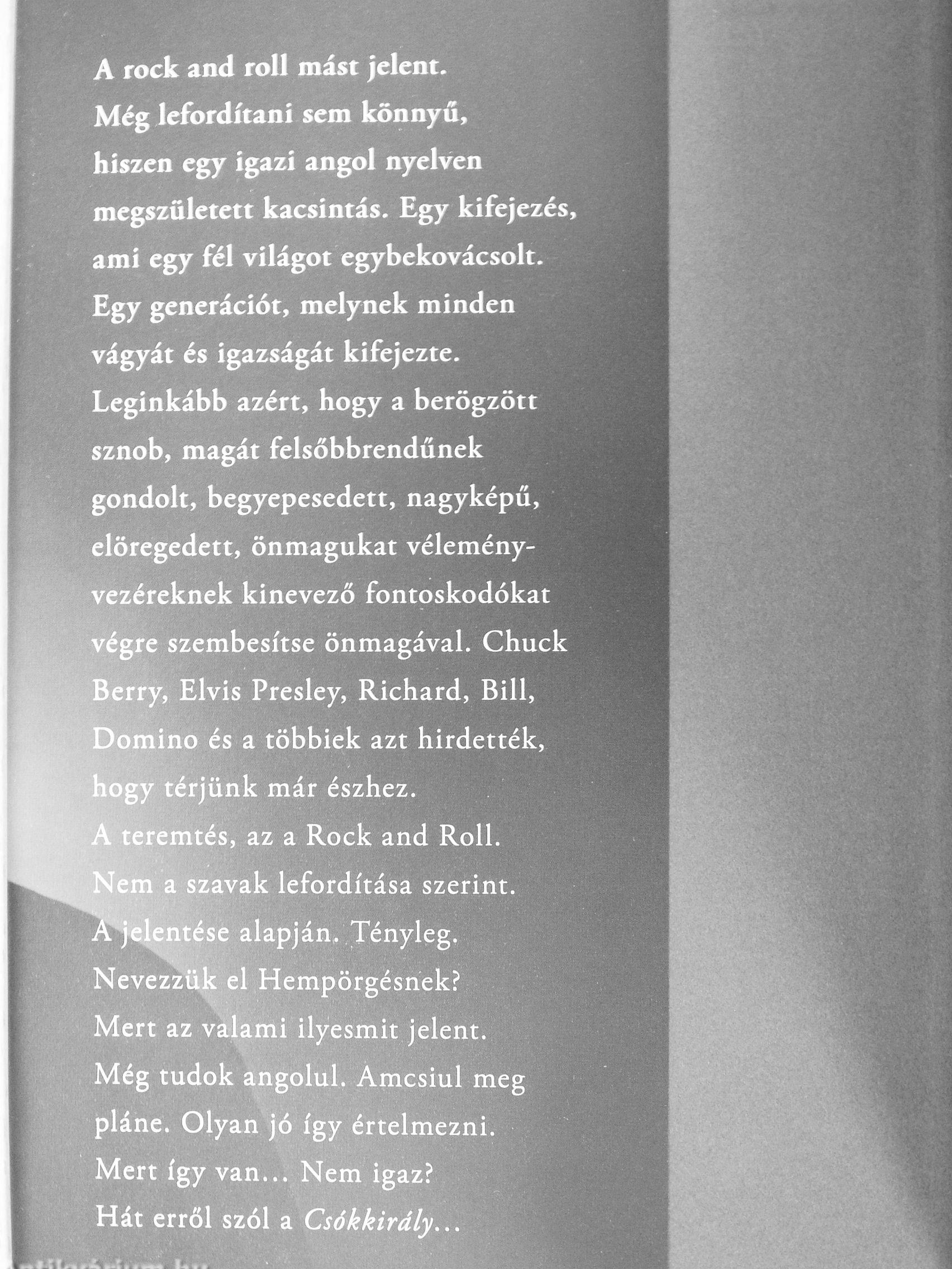 A rock and roll mást jelent. Még lefordítani sem könnyű, hiszen egy igazi angol nyelven megszületett kacsintás. Egy kifejezés, ami egy fél világot egybekovácsolt. Egy generációt, melynek minden vágyát és igazságát kifejezte. Leginkább azért, hogy a berögzött sznob, magát felsőbbrendűnek gondolt, begyepesedett, nagyképű, elöregedett, önmagukat véleményvezéreknek kinevező fontoskodókat végre szembesítse önmagával. Chuck Berry, Elvis Presley, Richárd, Bili, Domine és a többiek azt hirdették, hogy térjünk már észhez. A teremtés, az a Rock and Roll. Nem a szavak lefordítása szerint. A jelentése alapján. Tényleg. Nevezzük el Hempörgésnek? Mert az valami ilyesmit jelent. Még tudok angolul. Amcsiul meg pláne. Olyan jó így értelmezni. Mert így van Nem igaz? Hát erről szól a Csókkirály