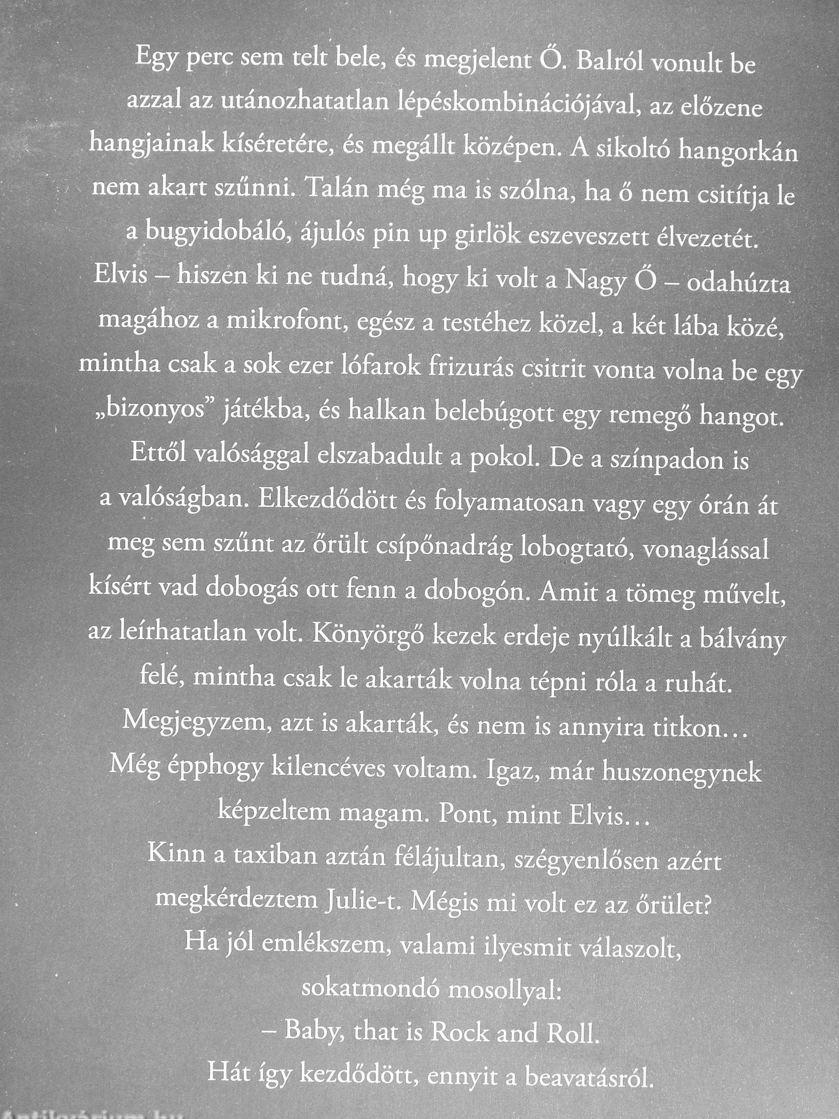 a bugyidobáló, ájulós pin up girlök eszeveszett élvezetét. Elvis - hiszen ki ne tudná, hogy ki volt a Nagy Ő - odahúzta magához a mikrofont, egész a testéhez közel, a két lába közé, mintha csak a sok ezer lófarok frizurás Csitrit vonta volna be egy „bizonyos" játékba, és halkan belebúgott egy remegő hangot.
