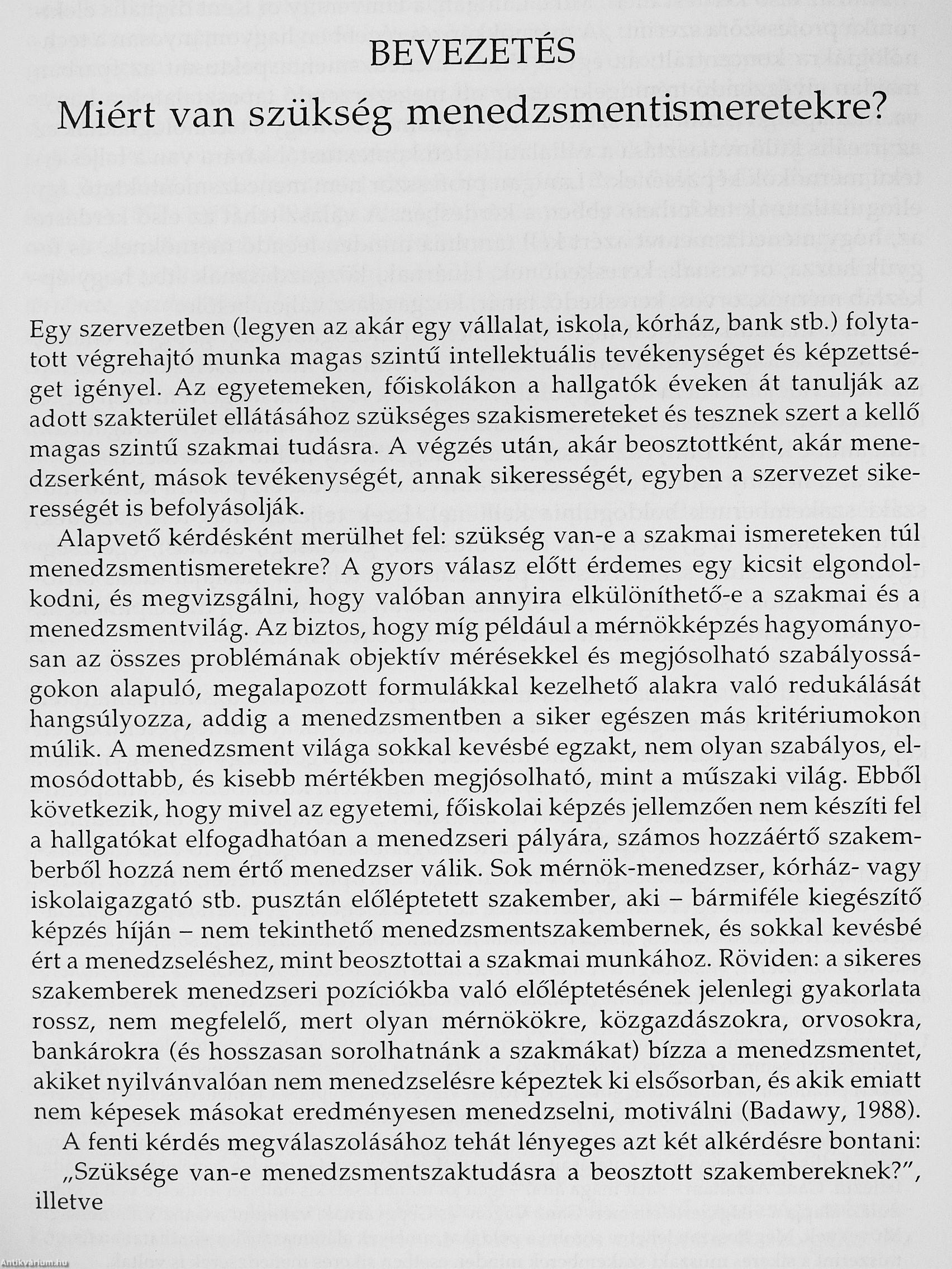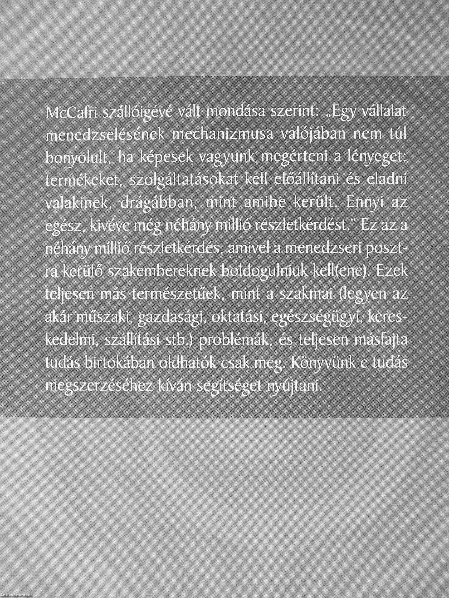 McCafri szállóigévé vált mondása szerint: „Egy vállalat menedzselésének mechanizmusa valójában nem túl bonyolult, ha képesek vagyunk megérteni a lényeget: termékeket, szolgáltatásokat kell előállítani és eladni valakinek, drágábban, mint amibe került. Ennyi az egész, kivéve még néhány millió részletkérdést." Ez az a néhány millió részletkérdés, amivel a menedzseri posztra kerülő szakembereknek boldogulniuk kell(ene). Ezek tel|esen más természetűek, mint a szakmai (legyen az akár műszaki, gazdásági, oktatási, egészségügyi, kereskedelmi, szállítási stb.) problémák, és teljesen másfajta tudás birtokában oldhatók csak meg. Könyvünk e tudás megszerzéséhez kíván segítséget nyújtani.