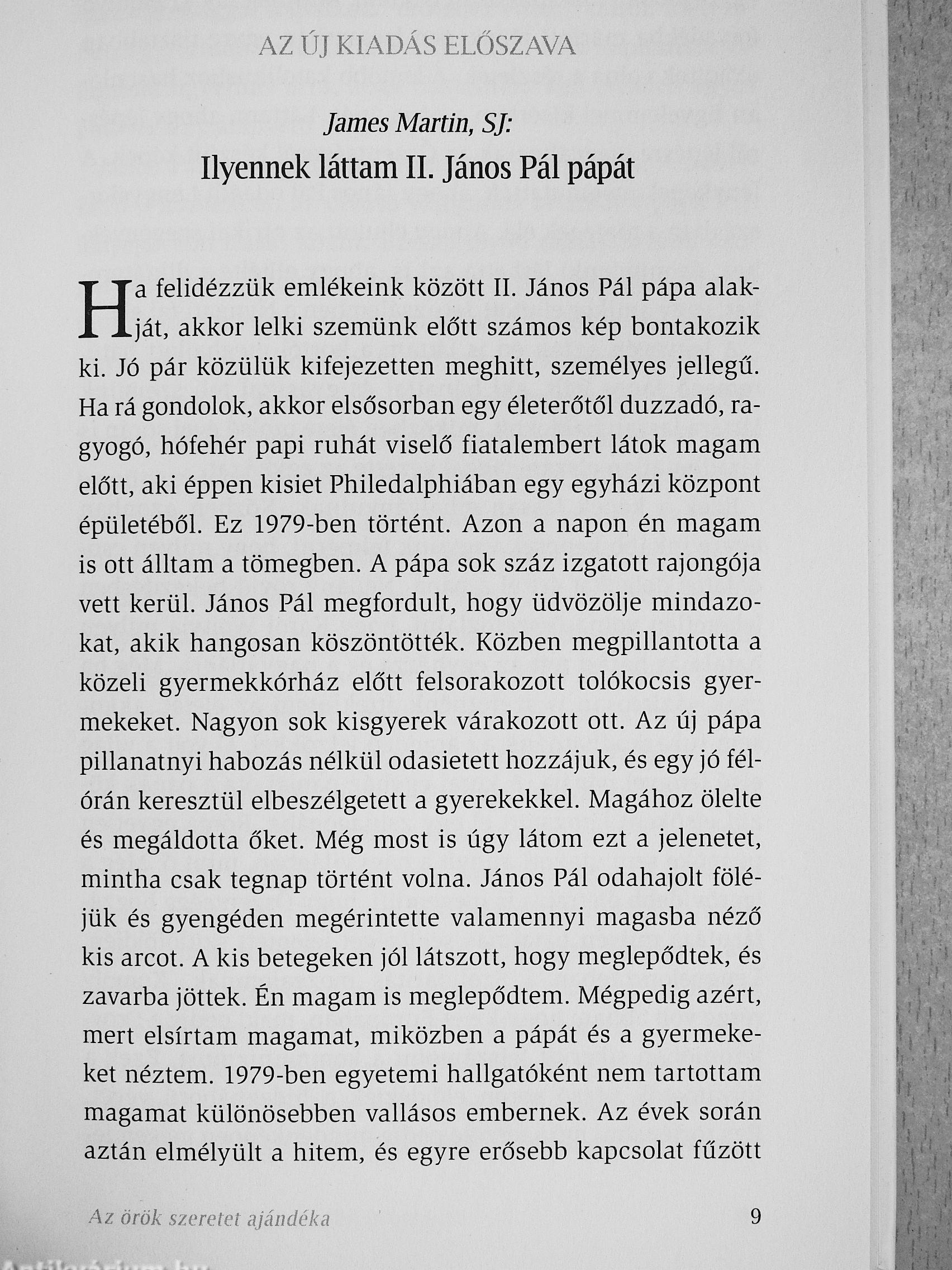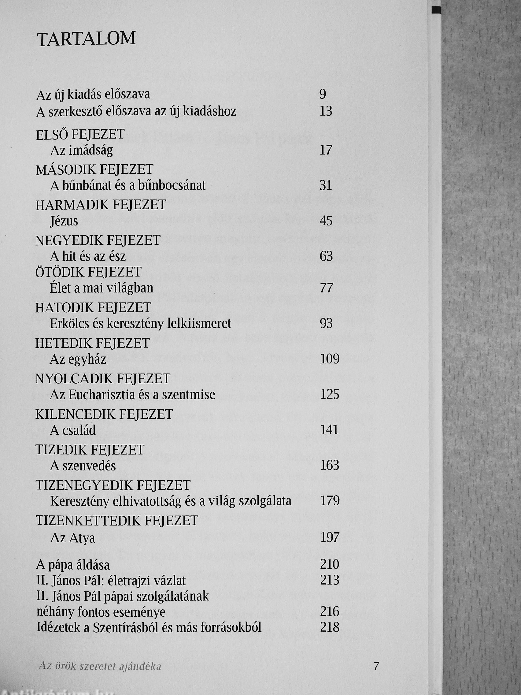 A könyv soralt olvasva úgy érezhetjük, mintha lelki vezetőként maga a pápa állna mellettünk, mintha egy magánbeszélgetésen fogadott volna minket. A XX. század egyik legfontosabb vallási személyének, lelki vezetőjének, tanítójának, II. János Pál pápának legszemélyesebb gondolatait, írásainak átdolgozott, kibővített gyűjteményét, több mint 25 évnyi pápai munkájának kivonatát vehetjük kézbe.