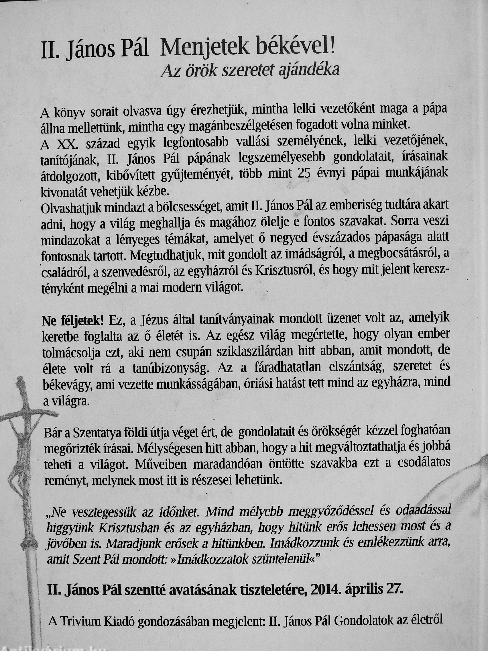 Bár a Szentatya földi útja véget ért, de gondolatait és örökségét kézzel foghatóan megőrizték írásai. Mélységesen hitt abban, hogy a hit megváltoztathatja és jobbá teheti a vüágot. Műveiben maradandóan öntötte szavakba ezt a csodálatos reményt, melynek most itt is részesei lehetünk.