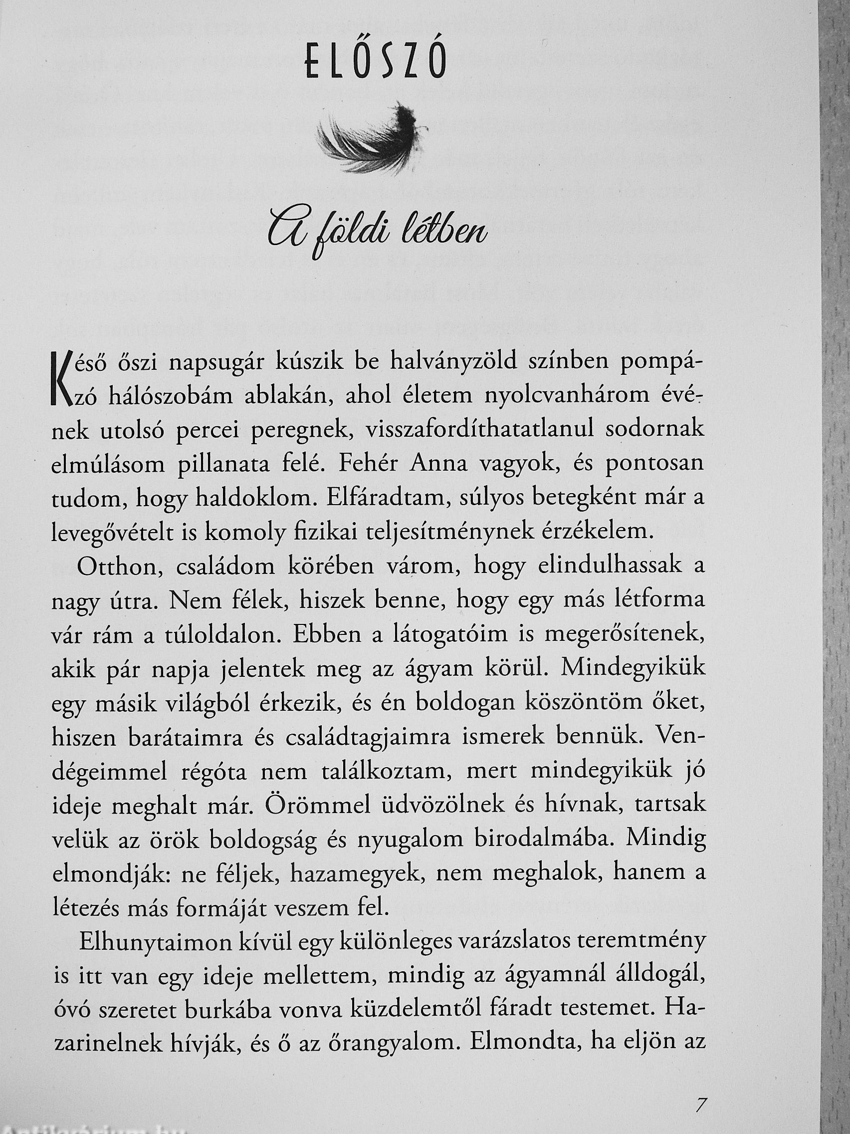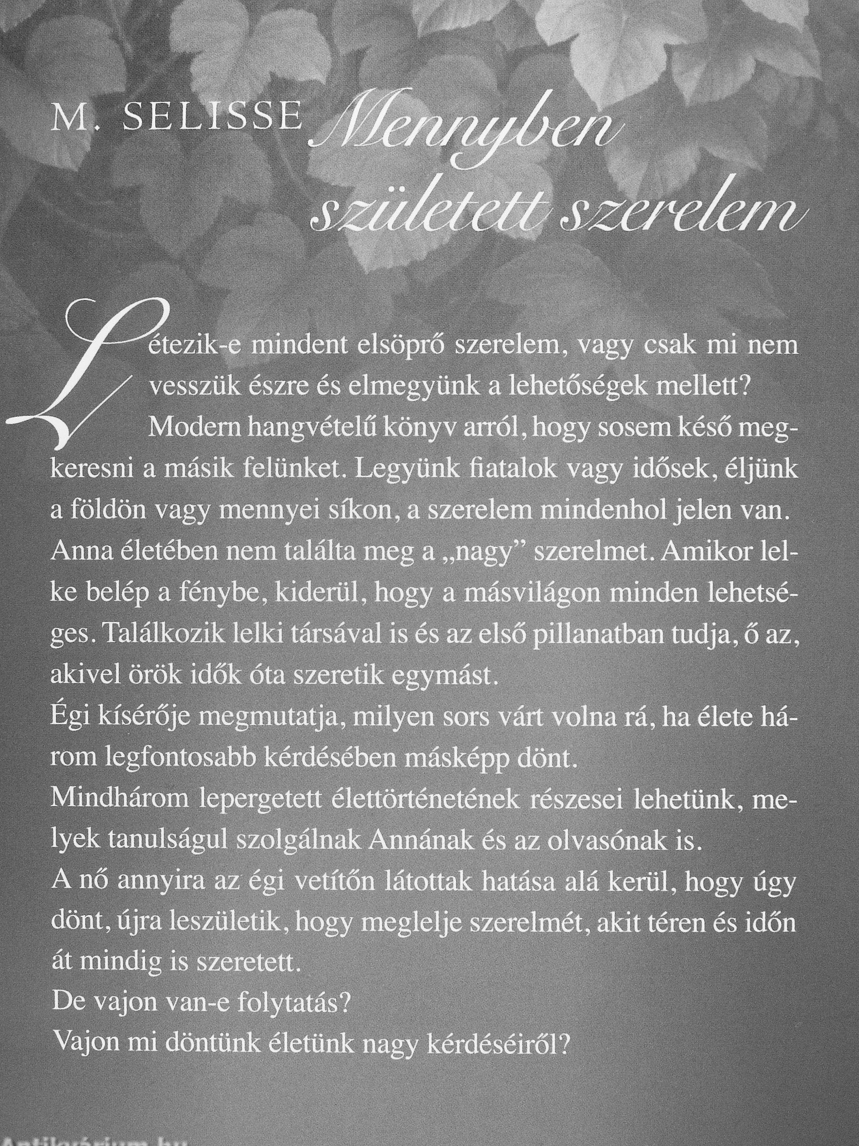 S^-^tezik-e mindent elsöprő szerelem, vagy csak mi nem / / vesszük észre és elmegyünk a lehetőségek mellett? A/ Modem hangvételű könyv arról, hogy sosem késő megkeresni a másik felünket. Legyünk fiatalok vagy idősek, éljünk a földön vagy mennyei síkon, a szerelem mindenhol jelen van. Anna életében nem találta meg a „nagy" szerelmet. Amikor lelke belép a fénybe, kiderül, hogy a másvilágon minden lehetséges. Találkozik lelki társával is és az első pillanatban tudja, ő az, akivel örök idők óta szeretik egymást.