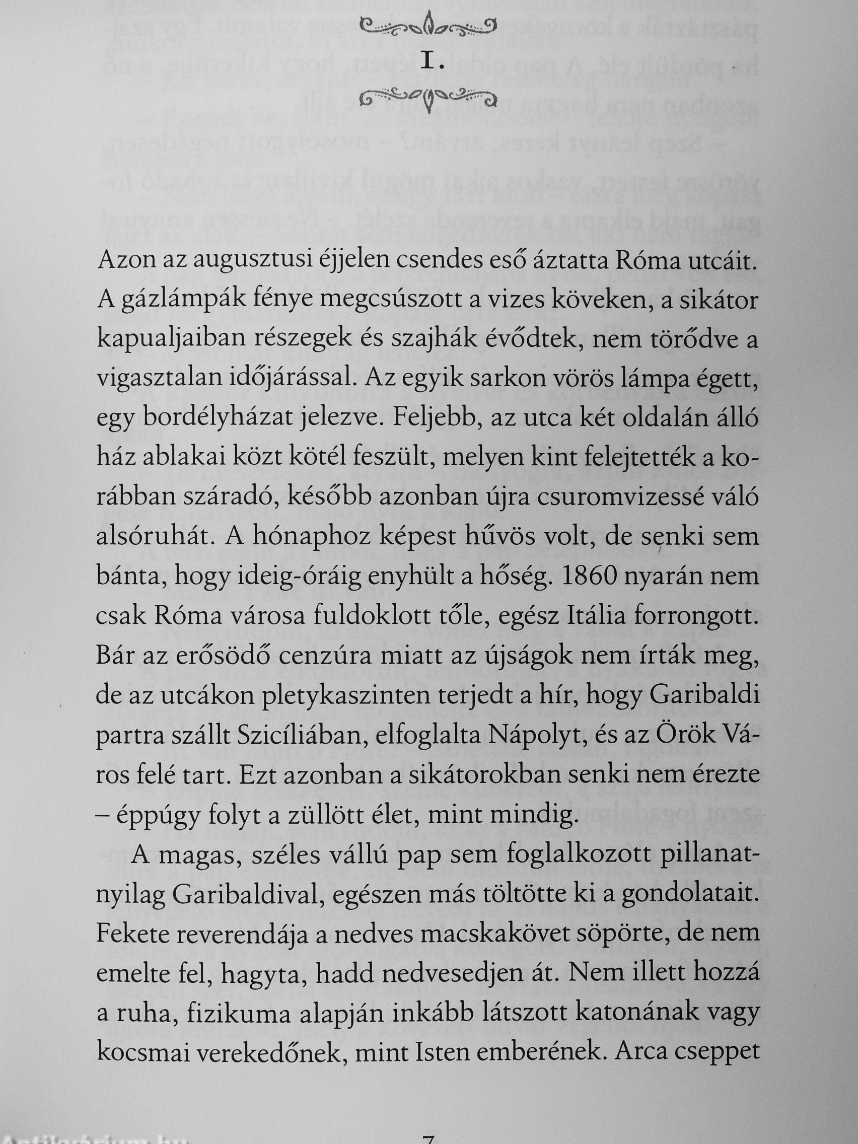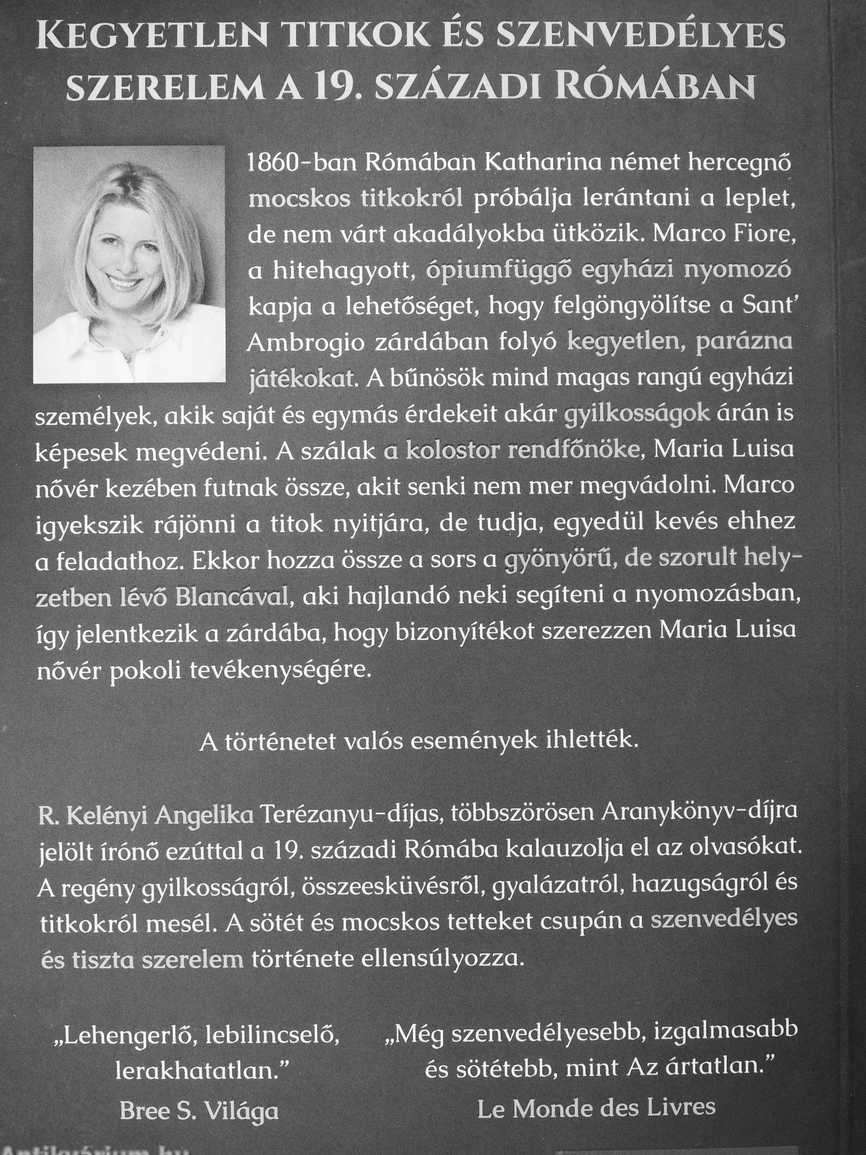 R. Kelényi Angelika Terézanyu-díjas, többszörösen Aranykönyv-díjra jelölt írónő ezúttal a 19. századi Rómába kalauzolja el az olvasókat. A regény gyilkosságról, összeesküvésről, gyalázatról, hazugságról és titkokról mesél. A sötét és mocskos tetteket csupán a szenvedélyes és tiszta szerelem története ellensúlyozza.