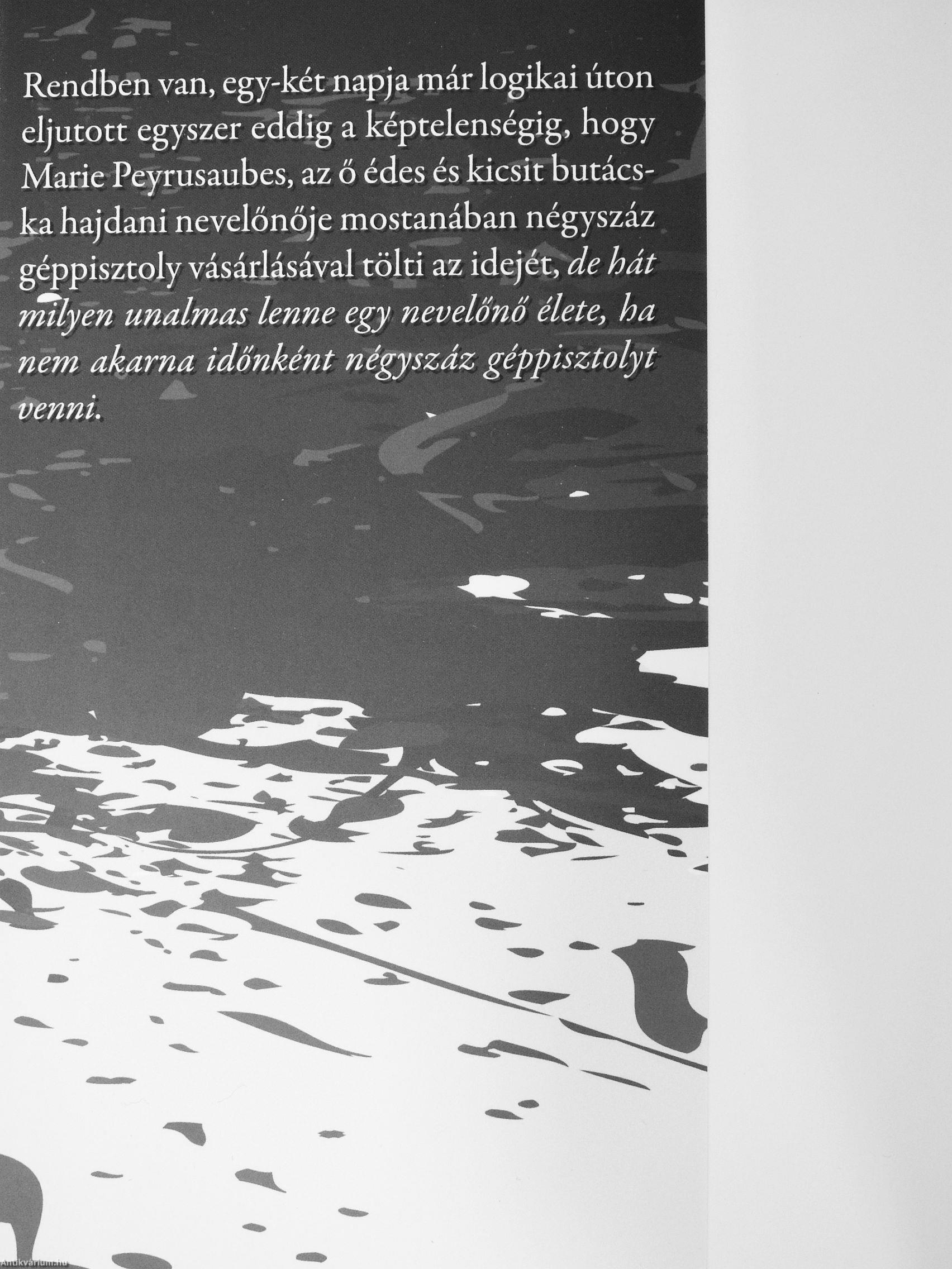 Rendben van, egy-két napja már logikai úton eljutott egyszer eddig a képtelenségig, hogy Marié Peyrusaubes, az ő édes és kicsit butácska hajdani nevelőnője mostanában négyszáz géppisztoly vásárlásával tölti az idejét,Wf hát milyen unalmas lenne egy nevelőnő élete, ha nem alyzrna időnként négyszáz géppisztolyt