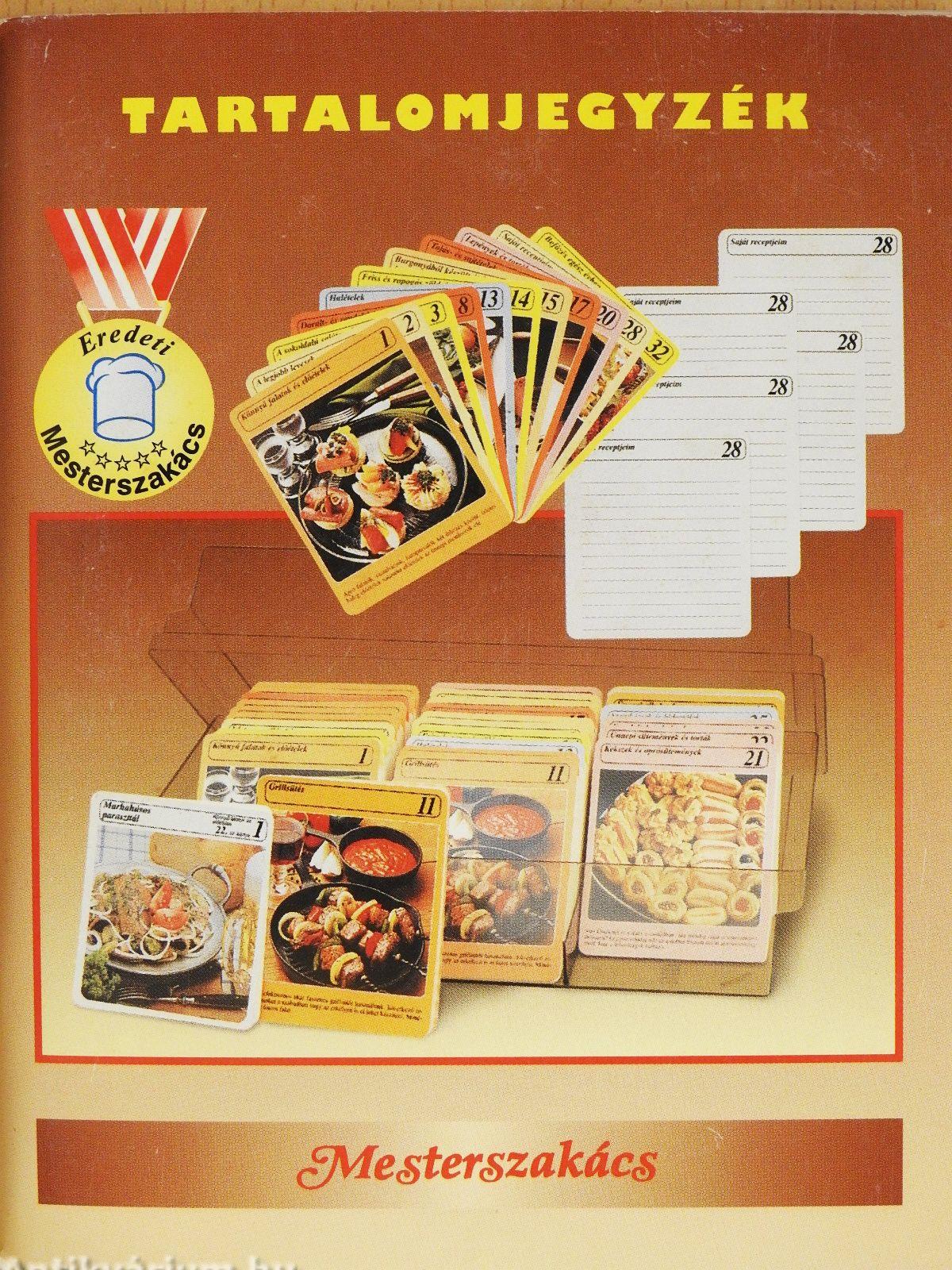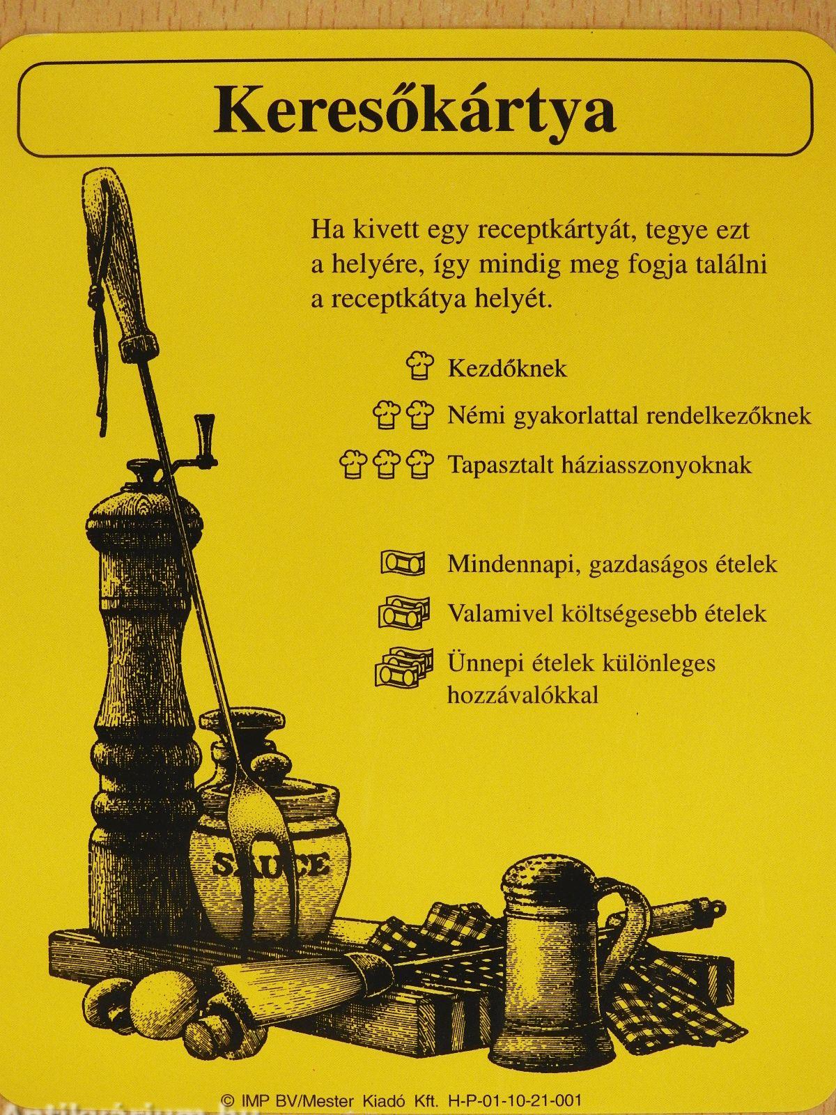 | Megjegyzés: | 2189 db kétoldalas receptkártya 32 kategóriában, elválasztó lapokkal. 4 db Keresőkártya és tűzött kötésű tartalomjegyzék melléklettel. Színes fotókkal illusztrálva. |