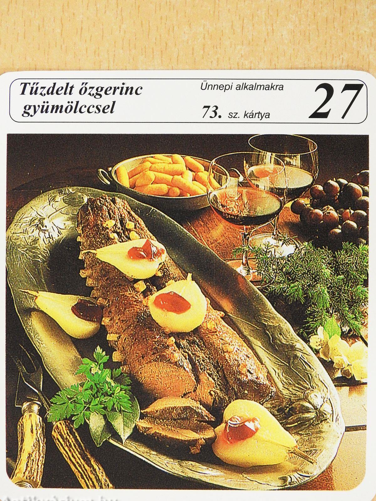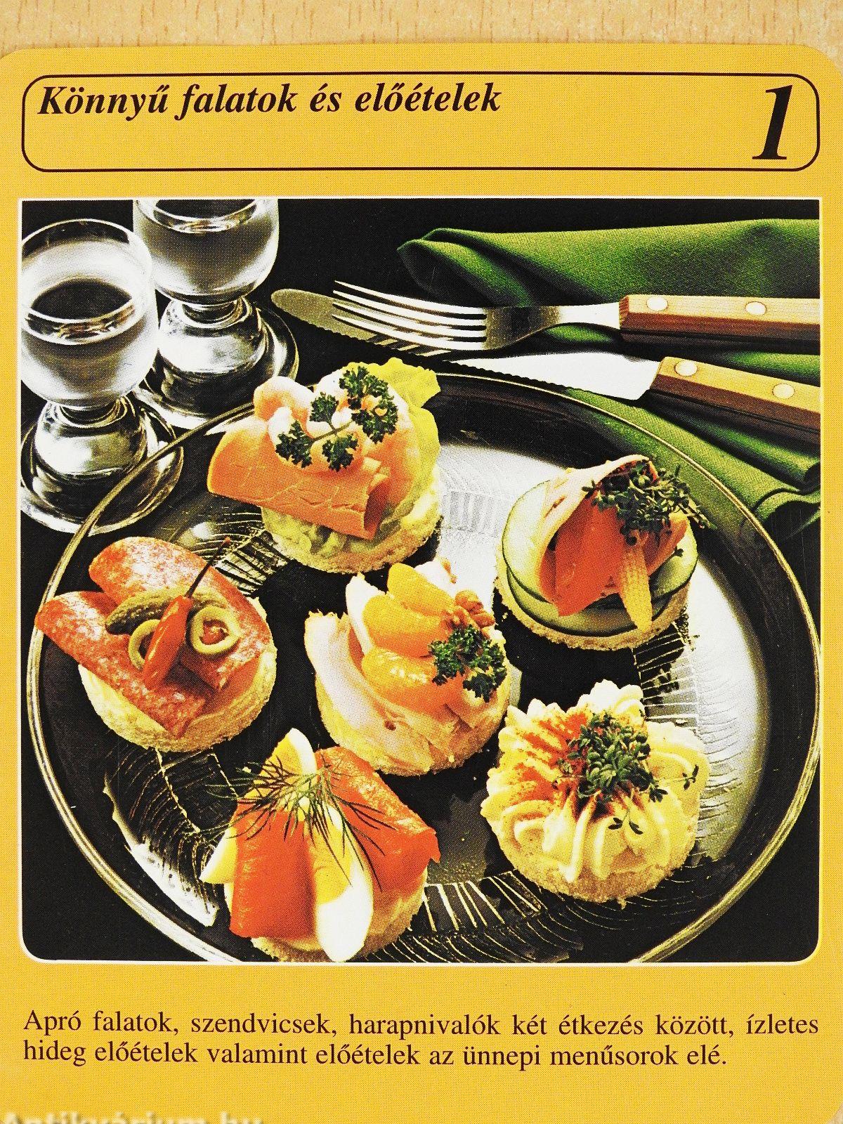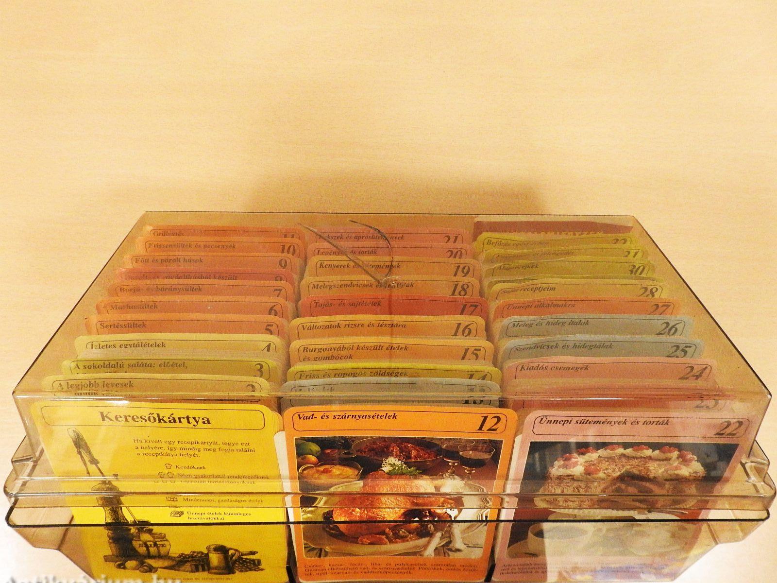 | Megjegyzés: | 2161 db kétoldalas receptkártya 32 kategóriában, elválasztó lapokkal. 4 db Keresőkártya és tűzött kötésű tartalomjegyzék melléklettel. Színes fotókkal illusztrálva. Műanyag védődobozban. |