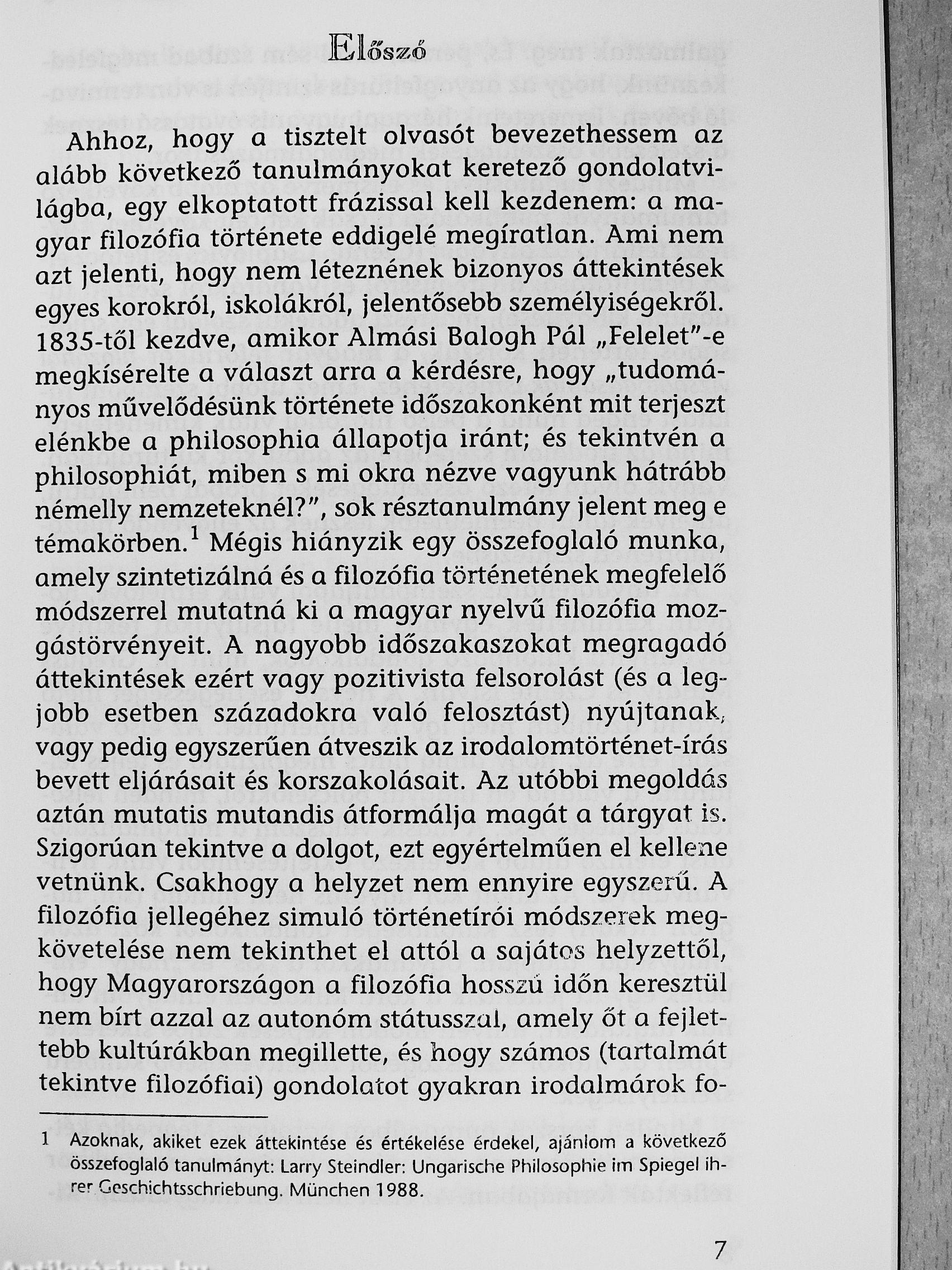 „Létezik bizonyos párhuzam a relormkor cs napjaink között. Ha ebből csak a történelmi lemaradás enyhítésére h'ányuló törekvéseket és a »nemzeti« es/méje-nek újraéledését emelem ki (mint egy átlögó társadalmi mozgás két pólusát), akkor Is megragadható közös vonásuk: a lürelmellenség. És Itt le kell szögeznem, hogy a türelmetlenséget nem etikai vagy viselkedésbeli értelmében, hanem társadalomontológiai jelentésében veszem. Ez pedig azt jelenti, hogy a türelmetlenség az Időszűkében levő társadalom szociális jellemzője. Egyszerűen nincs idő kivárni bizonyos változások természetes lefolyását, ezért beszűkül a tűréshatár. A történések egyirányúakká válnak. Az Ilyen időszakok azokat az eszméket Igazolják vissza, amelyek egyértelműen a felvett Irányt támogatják-erősítik. Ahogyan a reformkornak sem volt ideje elgondolkozni sem Greguss (vagy Csató, Csaplovics, Vandrák) Ideáin (amelyek pedig párhuzamosak voltak a kor irányvételével, csak éppen szélesebbek voltak annál), sem Petőcz (az aktualitás szemszögéből steril) filozófiai spekulációin, sem pedig Czente egyértelműen retrográd-konzervatív (de a valóságban jelenlevő és ható erőkkel kapcsolatos) figyelmeztetésein. A türelmetlenség okozta e szerzők marginalizálódását. Ugyanez a türelmetlenség dobta felszínre azt a „társasági" filozófiát, amely ugyan az adott korban önmagát Igazolta, de csakhamar mint a legsekélyebb spekuláció bukott meg. „Szolgáló" filozófiák, mint ideológlapótlekok mindig lesznek, de ugyanúgy létezni fog a „sub specie acternltatis"-szem-lélet Is, amely egy türelmetlen korban tűnhet anakronizmusnak vagy felesleges luxusnak Is, de kizárásával, ellehetetlenítcsevel végeredményben mégis maga az adott kor válik vesztessé."