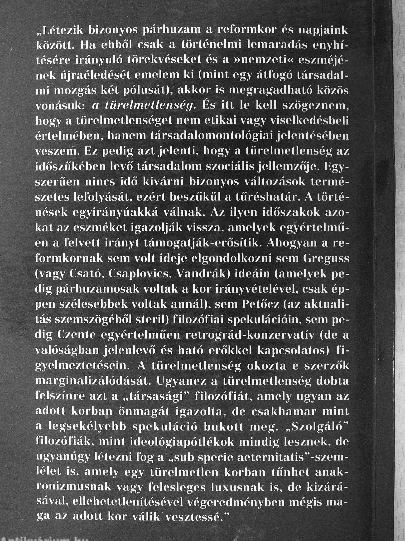 „Létezik bizonyos párhuzam a relormkor cs napjaink között. Ha ebből csak a történelmi lemaradás enyhítésére h'ányuló törekvéseket és a »nemzeti« es/méje-nek újraéledését emelem ki (mint egy átlögó társadalmi mozgás két pólusát), akkor Is megragadható közös vonásuk: a lürelmellenség. És Itt le kell szögeznem, hogy a türelmetlenséget nem etikai vagy viselkedésbeli értelmében, hanem társadalomontológiai jelentésében veszem. Ez pedig azt jelenti, hogy a türelmetlenség az Időszűkében levő társadalom szociális jellemzője. Egyszerűen nincs idő kivárni bizonyos változások természetes lefolyását, ezért beszűkül a tűréshatár. A történések egyirányúakká válnak. Az Ilyen időszakok azokat az eszméket Igazolják vissza, amelyek egyértelműen a felvett Irányt támogatják-erősítik. Ahogyan a reformkornak sem volt ideje elgondolkozni sem Greguss (vagy Csató, Csaplovics, Vandrák) Ideáin (amelyek pedig párhuzamosak voltak a kor irányvételével, csak éppen szélesebbek voltak annál), sem Petőcz (az...