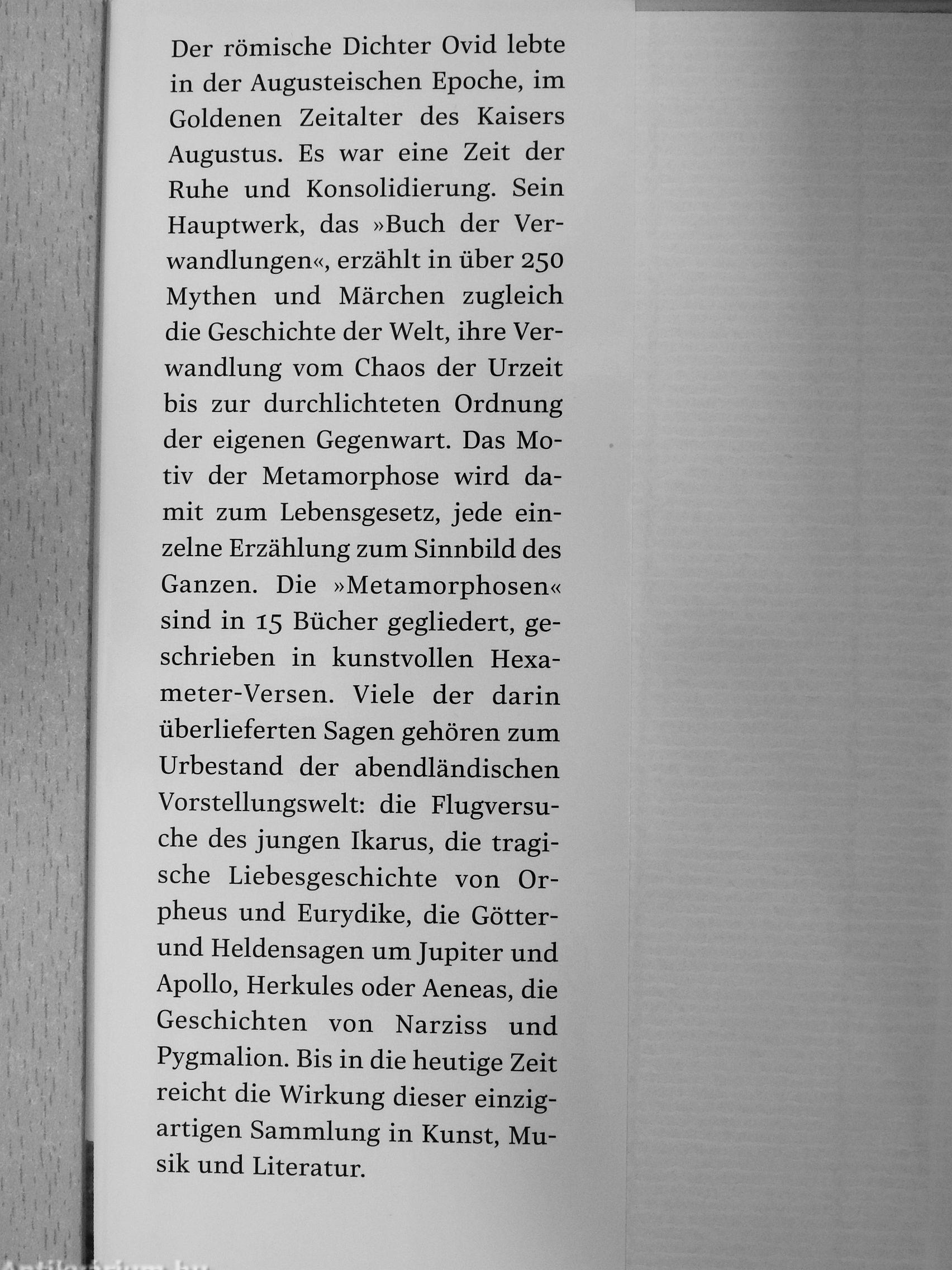 Der römische Dichter Ovid lebte in der Augusteischen Epoche, im Goldenen Zeitalter des Kaisers Augustus. Es war eine Zeit der Ruhe und Konsolidierung. Sein Hauptwerk, das »Buch der Verwandlungen«, erzählt in über 250 Mythen und Märchen zugleich die Geschichte der Welt, ihre Verwandlung vom Chaos der Urzeit bis zur durchlichteten Ordnung der eigenen Gegenwart. Das Motiv der Metamorphose wird damit zum Lebensgesetz, jede einzelne Erzählung zum Sinnbild des Ganzen. Die »Metamorphosen« sind in 15 Bücher gegliedert, geschrieben in kunstvollen Hexameter-Versen. Viele der darin überlieferten Sagen gehören zum Urbestand der abendländischen Vorstellungswelt: die Flugversuche des jungen Ikarus, die tragische Liebesgeschichte von Orpheus und Eurydike, die Götter-und Heldensagen um Jupiter und Apollo, Herkules oder Aeneas, die Geschichten von Narziss und Pygmalion. Bis in die heutige Zeit reicht die Wirkung dieser einzigartigen Sammlung in Kunst, Musik und Literatur.
