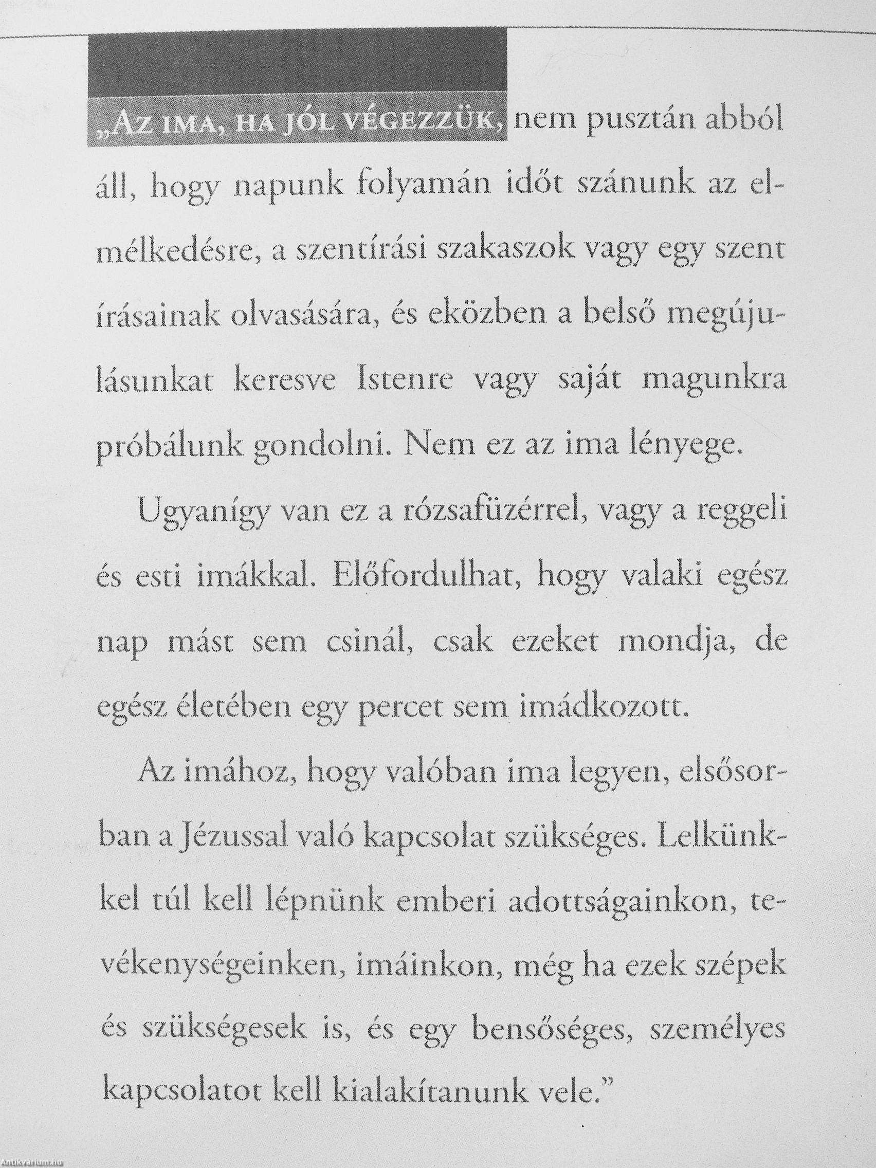 áil, hogy iiapLiiik folyamán klőt szánunk az elmélkedésre, a szentírási szakaszok vagy egy szent írásainak olvasására, és eközben a belső megújulásunkat keresve Istenre vagy saját magunkra príSbáliuik gondolni. Nem ez az ima lényege.