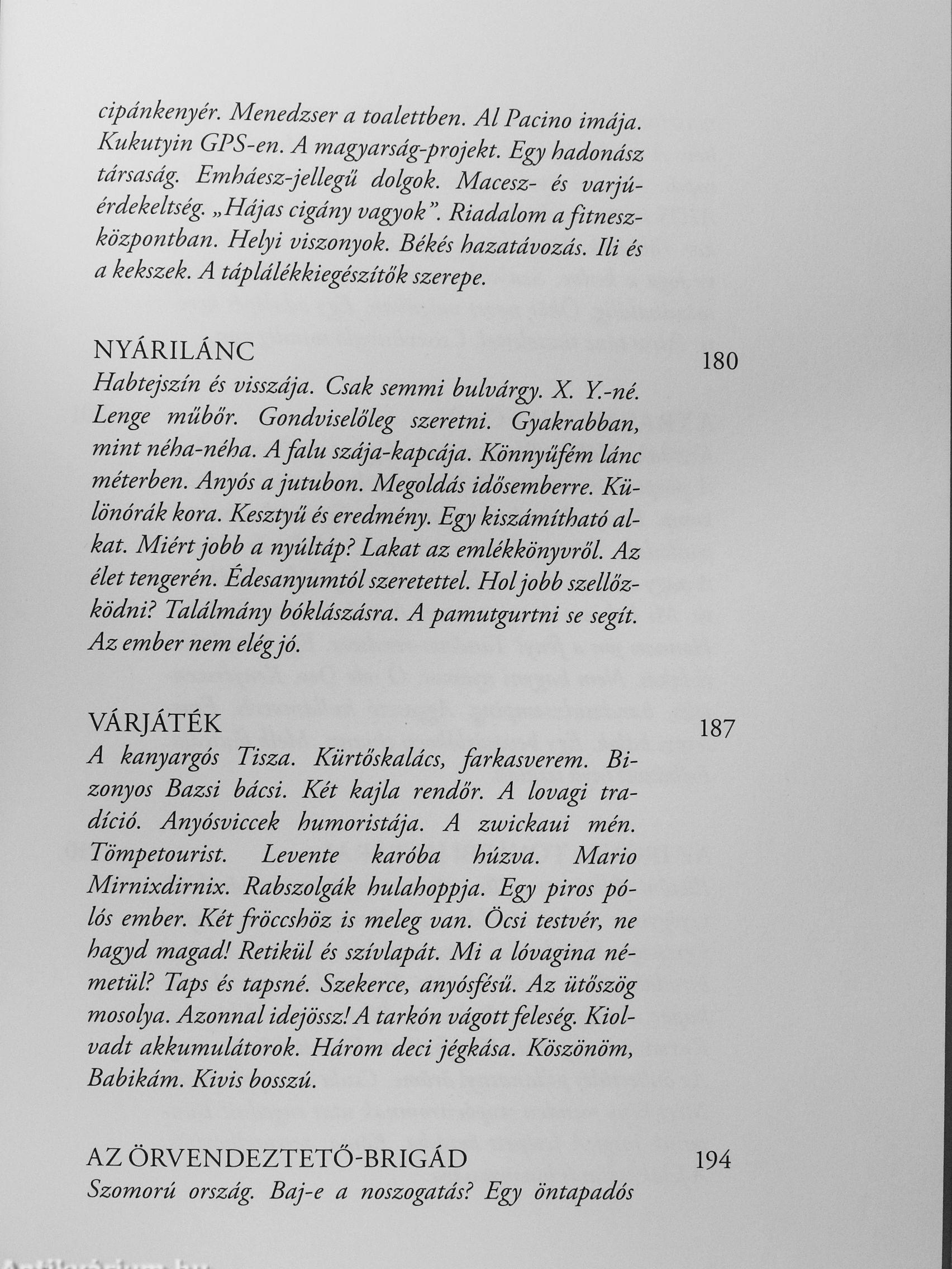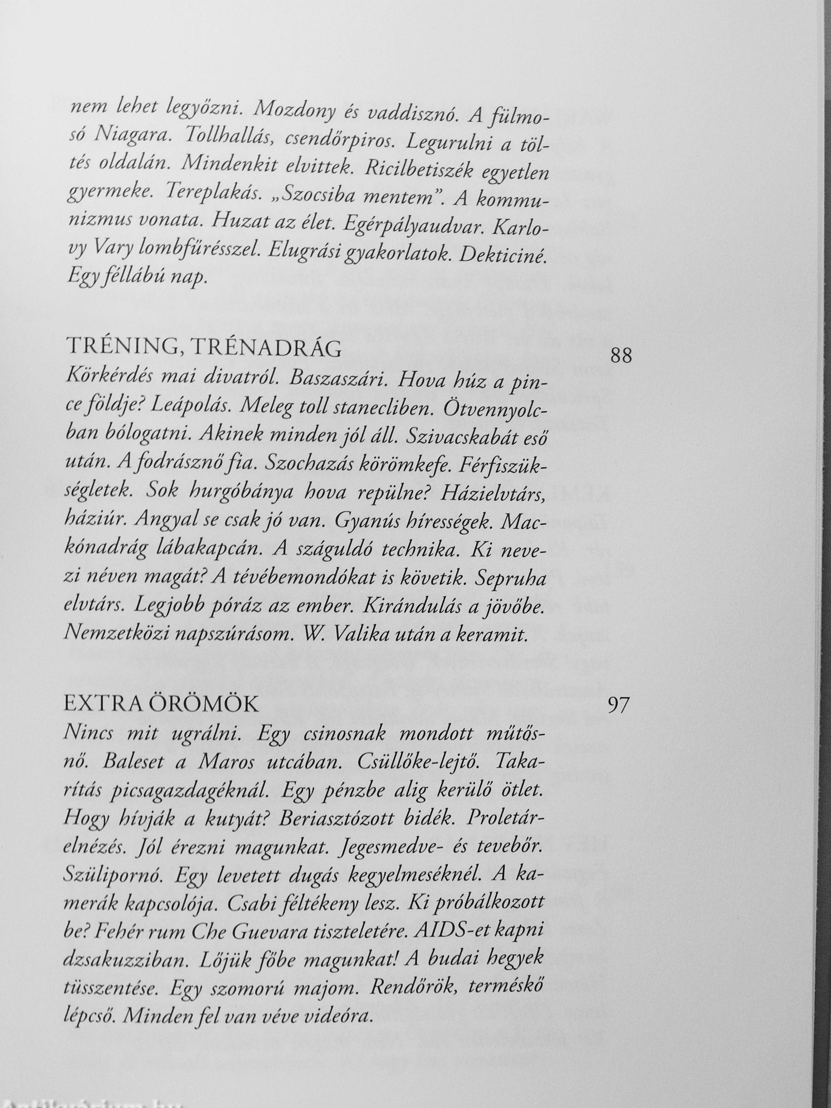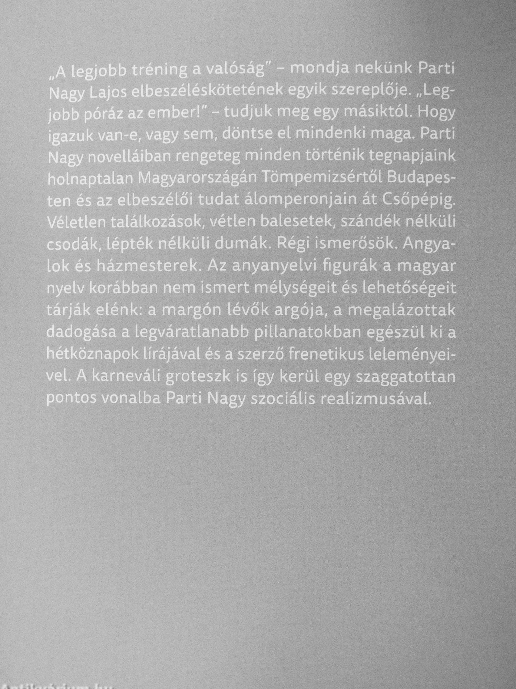 „A legjobb tréning a valóság" - mondja nekünk Parti Nagy Lajos elbeszéléskötetének egyik szereplője. „Legjobb póráz az ember!" - tudjuk meg egy másiktóL Hogy igazuk van-e, vagy sem, döntse el mindenki maga. Parti Nagy novelláiban rengeteg minden történik tegnapjaink holnaptalan Magyarországán Tömpemizsértől Budapesten és az elbeszélői tudat álomperonjain át Csőpépig. Véletlen találkozások, vétlen balesetek, szándék nélküli csodák, lépték nélküli dumák. Régi ismerősök. Angyalok és házmesterek. Az anyanyelvi figurák a magyar nyelv korábban nem ismert mélységeit és lehetőségeit tárják elénk: a margón lévők argója, a megalázottak dadogása a legváratlanabb pillanatokban egészül ki a hétköznapok lírájával és a szerző frenetikus leleményeivel. A karneváli groteszk is így kerül egy szaggatottan pontos vonalba Parti Nagy szociális realizmusávaL