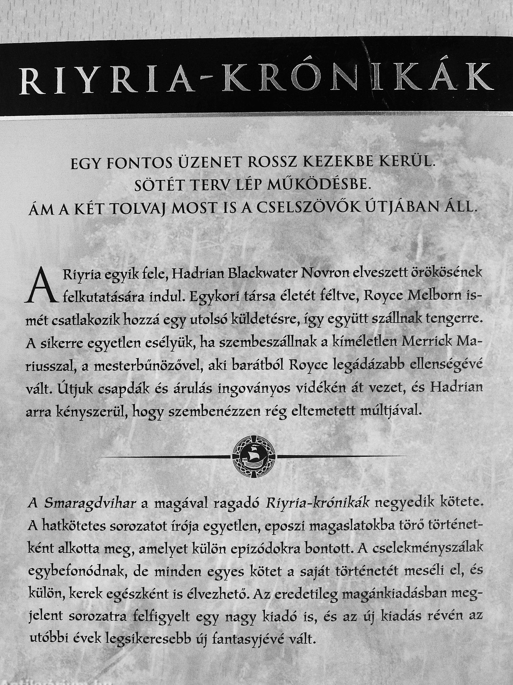 A Smaragdvíhar a magával ragadó Riyrm-krómkák negyedik kötete. A hatkötetes sorozatot írója egyetlen, eposzi magaslatokba törő történetként alkotta meg, amelyet külön epizódokra bontott. A cselekményszálak egybefonódnak, de minden egyes kötet a saját történetét meséli el, és külön, kerek egészként is élvezhető. Az eredetileg magánkiadásban megjelent sorozatra felfigyelt egy nagy kiadó is, és az új kiadás révén az utóbbi évek legsikeresebb új fantasyjévé vált.