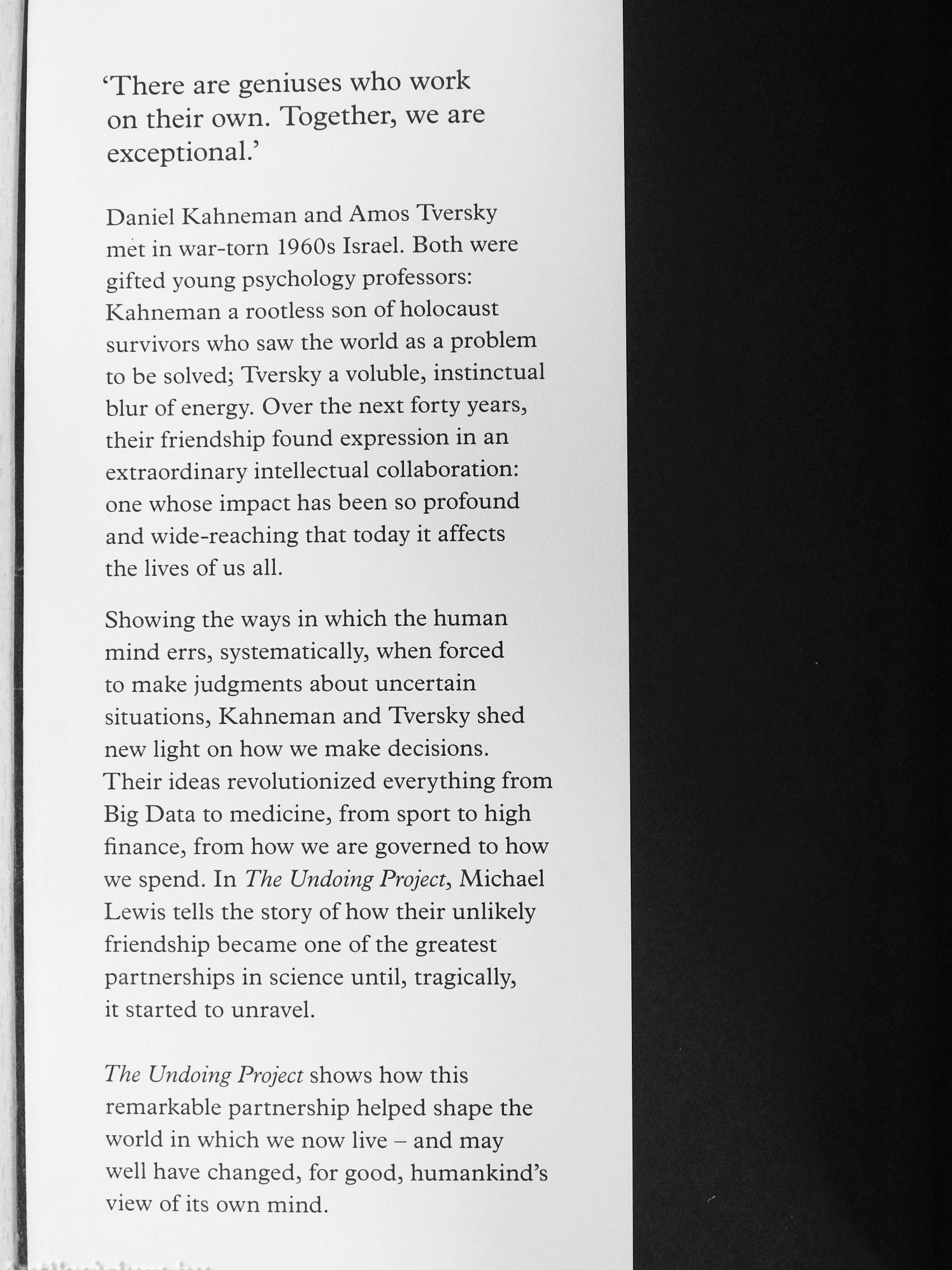 Daniel Kahneman and Amos Tversky met in war-torn 1960s Israel. Both were gifted young psychology professors: Kahneman a rootless son of holocaust survivors who saw the world as a problem to be solved; Tversky a voluble, instinctual blur of energy. Over the next forty years, their friendship found expression in an extraordinary intellectual collaboration: one whose impact has been so profound and wide-reaching that today it affects the lives of us all.