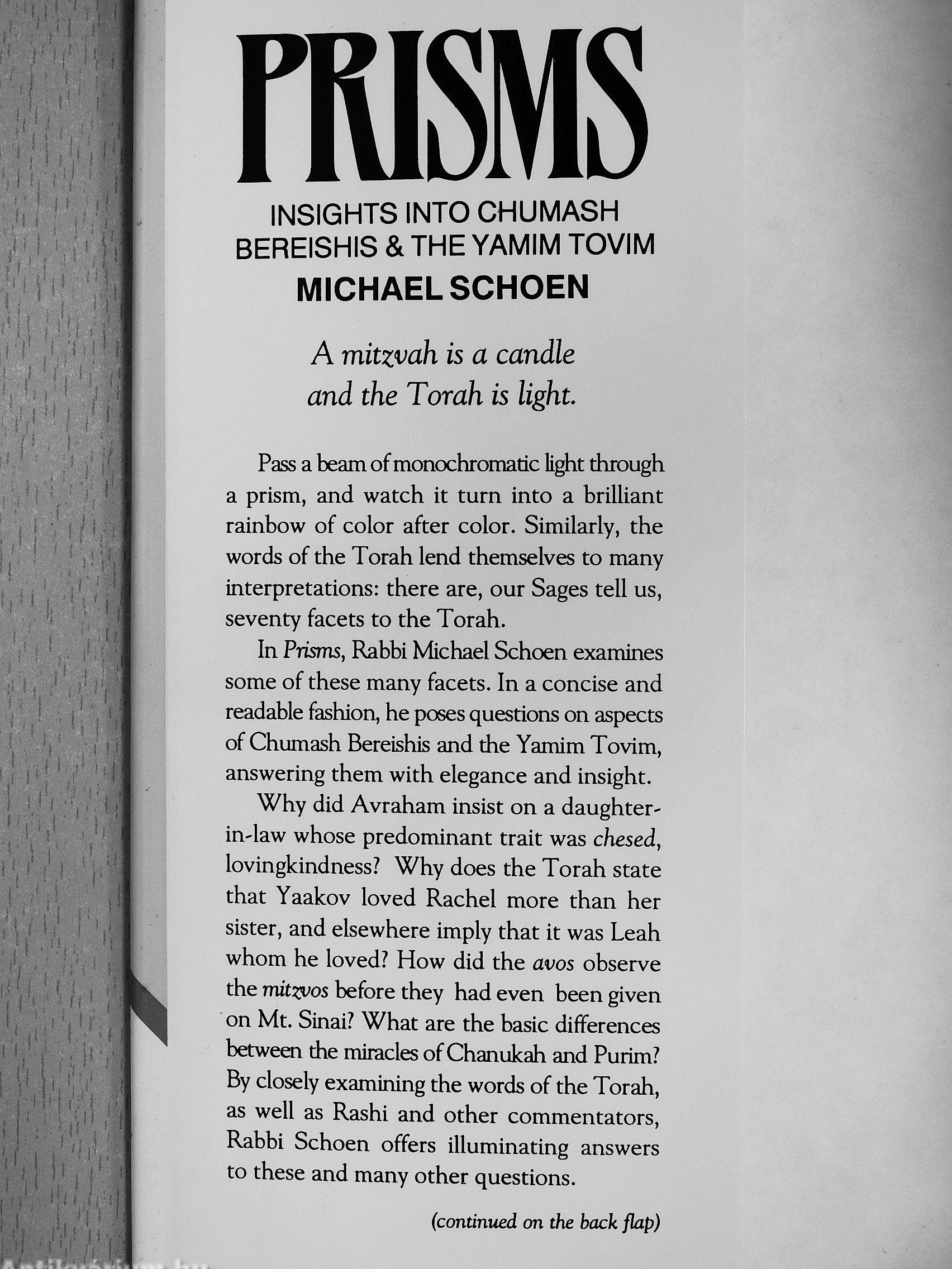 In Prisms, Rabbi Michael Schoen examines some of these many facets. In a concise and readable fashion, he poses questions on aspects of Chumash Bereishis and the Yamim Tovim, answering them with elegance and insight.