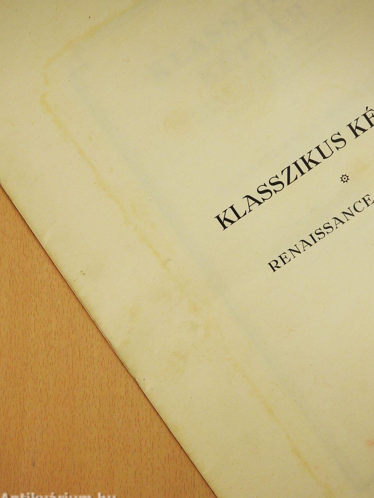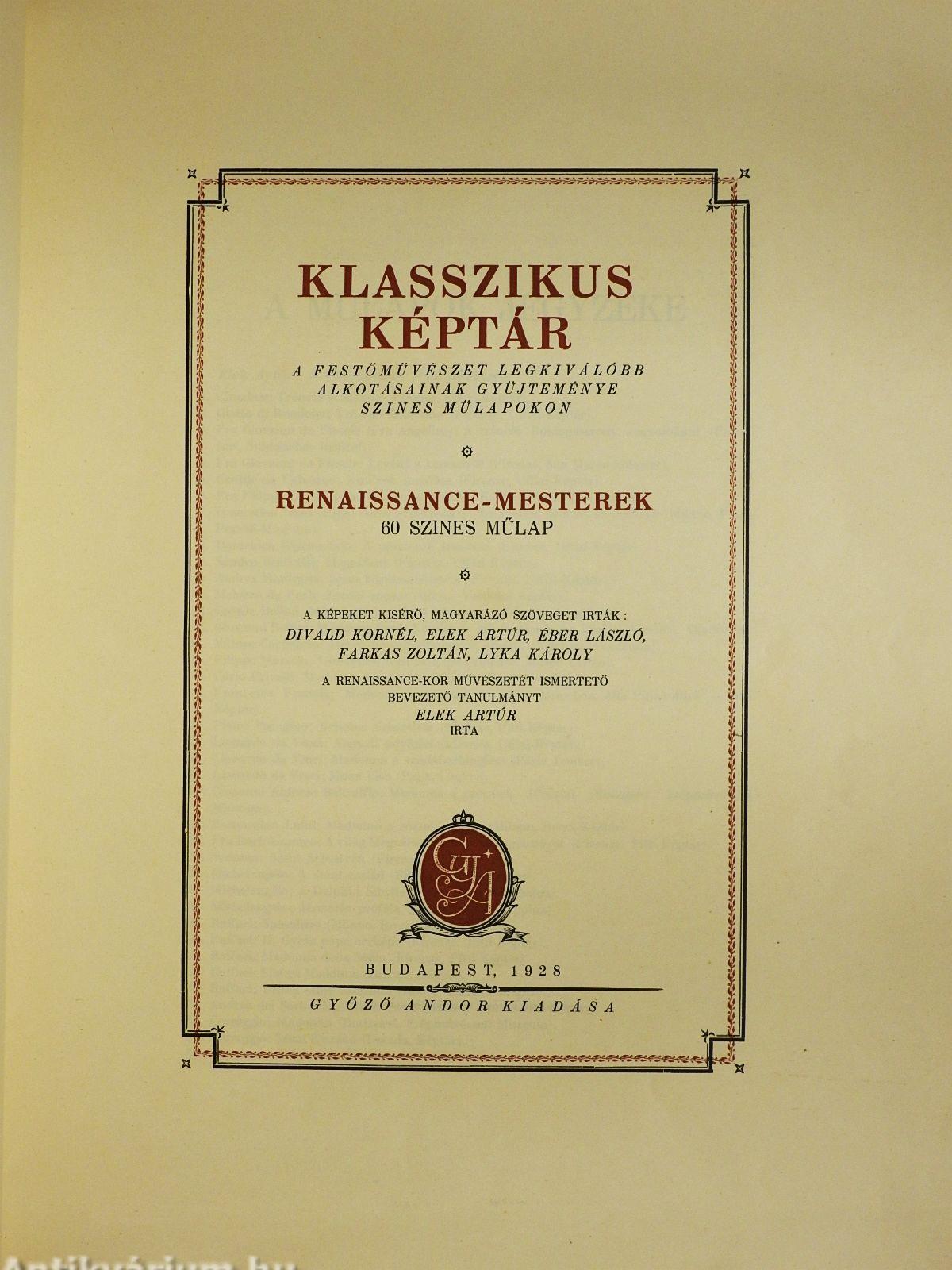 | Megjegyzés: | Nem teljes gyűjtemény. A díszmappa 59 színes, kartonra ragasztott különálló reprodukciót tartalmaz, mindegyik képhez szövegmagyarázat tartozik. A képeket kisérő, magyarázó szövegeket írták: Divald Kornél, Elek Artúr, Éber László, Farkas Zoltán, Lyka Károly. A Renaissance-kor művészetét ismertető bevezető tanulmányt Elek Artúr irta. Nyomtatta Hungária Hirlapnyomda Részvénytársaság, Budapest. További grafikusok a tartalomjegyzékben. |
