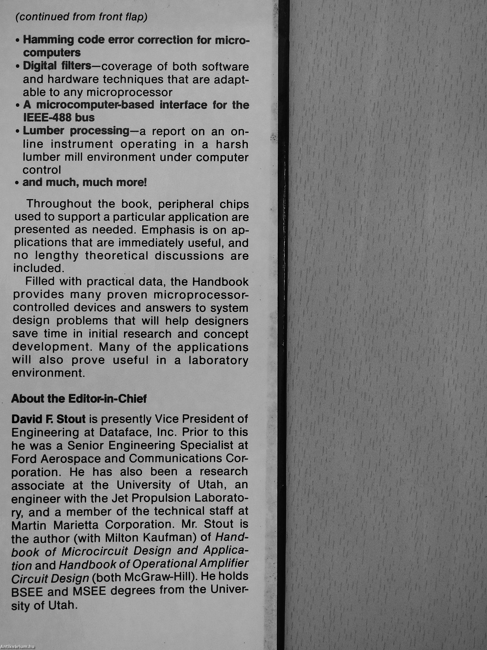 David F. Stout is presently Vice President of Engineering at Dataface, Inc. Prior to this he was a Senior Engineering Specialist at Ford Aerospace and Communications Corporation. He has also been a research associate at the University of Utah, an engineer with the Jet Propulsion Laboratory, and a member of the technical staff at Martin Marietta Corporation. Mr Stout is the author (with Milton Kaufman) of Handbook of Microcircuit Design and Application and Handbook of Operational Amplifier Circuit Design (both McGraw-Hill). He holds BSEE and MSEE degrees from the University of Utah.