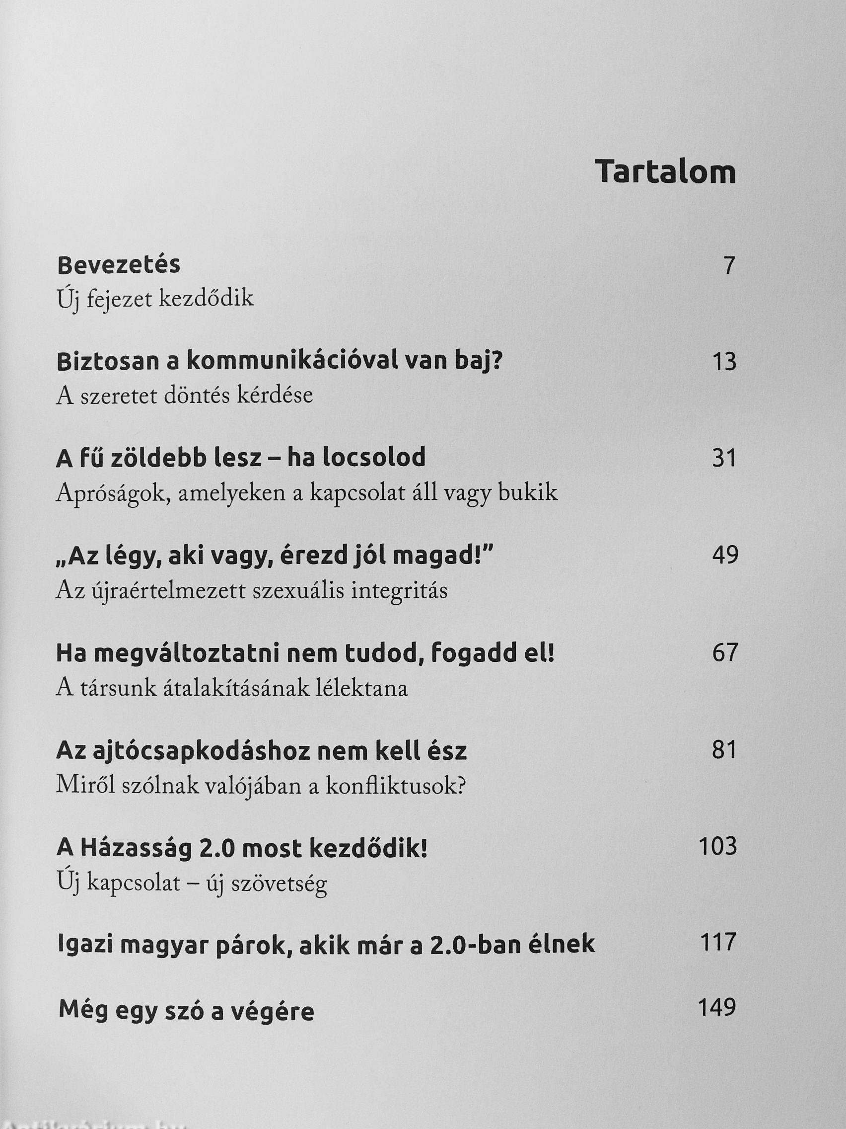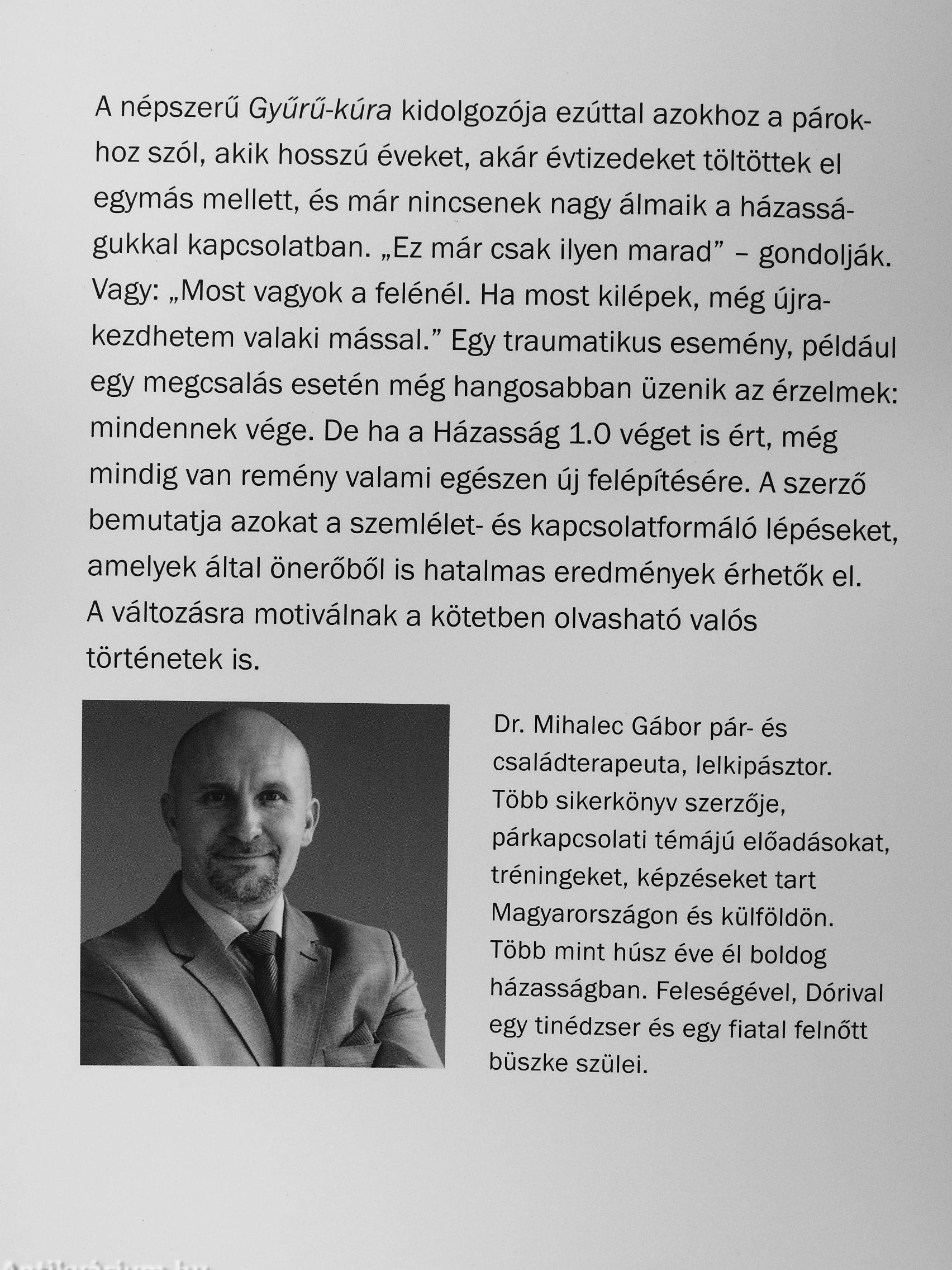 A népszerű Gyűrű-kúra kidolgozója ezúttal azokhoz a párokhoz szól, akik hosszú éveket, akár évtizedeket töltöttek el egymás mellett, és már nincsenek nagy álmaik a házasságukkal kapcsolatban. „Ez már csak ilyen marad" - gondolják. Vagy: „Most vagyok a felénél. Ha most kilépek, még újrakezdhetem valaki mással." Egy traumatikus esemény, például egy megcsalás esetén még hangosabban üzenik az érzelmek: mindennek vége. De ha a Házasság 1.0 véget is ért, még mindig van remény valami egészen új felépítésére. A szerző bemutatja azokat a szemlélet- és kapcsolatformáló lépéseket, amelyek által önerőből is hatalmas eredmények érhetők el. A változásra motiválnak a kötetben olvasható valós történetek is.