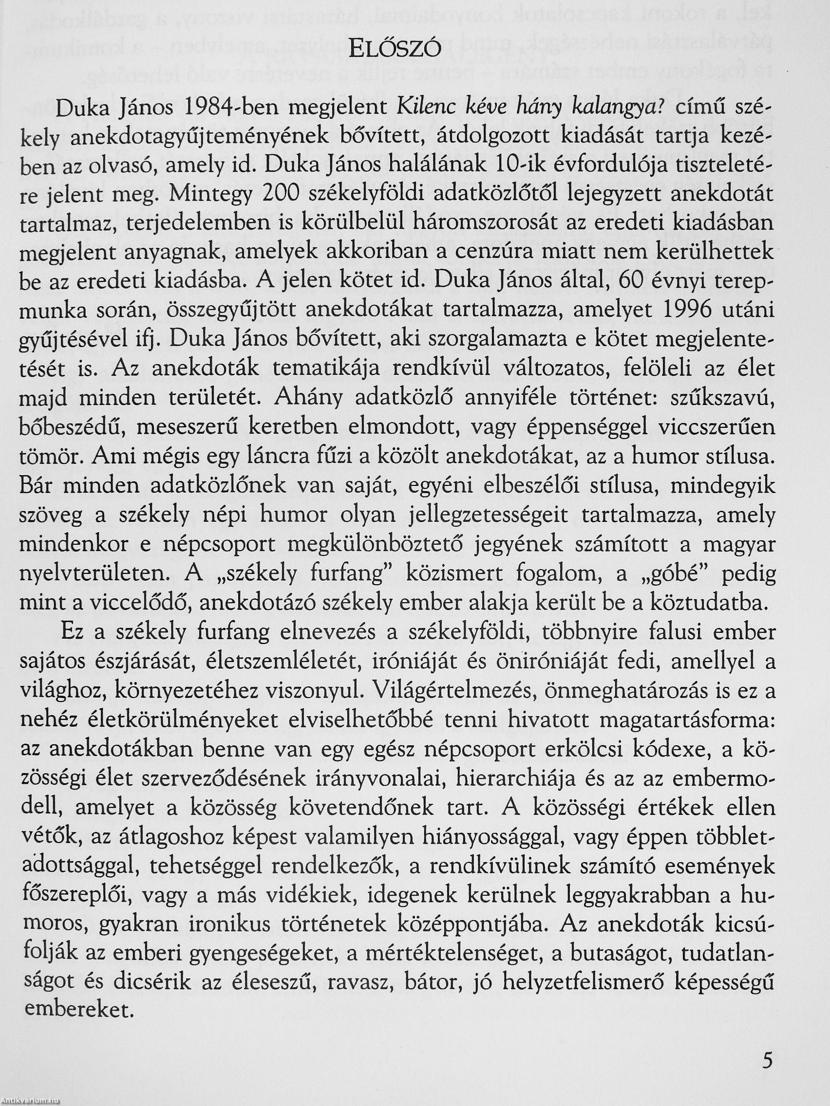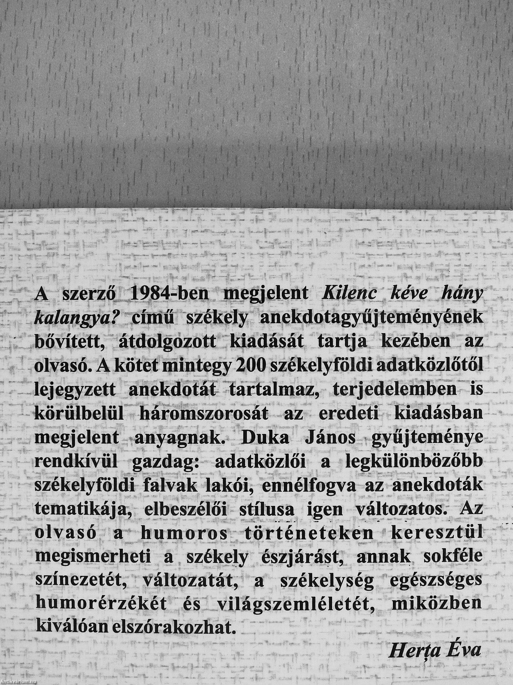 A szerző l?34-beii megjelent KUmC kéve hány kalangya? cíitiií székely anekdotagyűjteinényéiiek bővített, átdolgdzott kiadását tartja kezében az olvasó. A kötet mintegy 200 székelyföldi adatközlőtől lejegyzett anekdotálltartalmaz, teijedelemben is körülbelül háromszorosát az eredeti kiadásban megjelent anyagnak. Duka János gyűjteménye rendkívül gazdag: adatközlői a legkülönbözőbb székelyföldi falvak lakói, ennélfogva az anekdoták tematikája, elbeszélői stílusa igen változatos. Az olvasó a humoros történeteken keresztüi megismerheti a székely észjárást, annak sokféle színezetét, változatát, a székelység egészséges humorérzékét és világszemléletét, miközben kiválóan elszórakozhat.