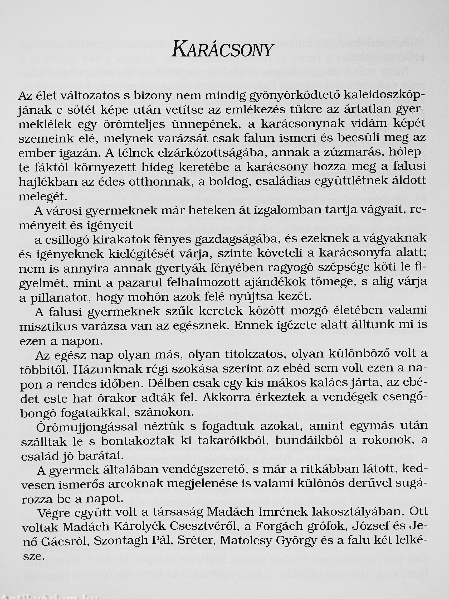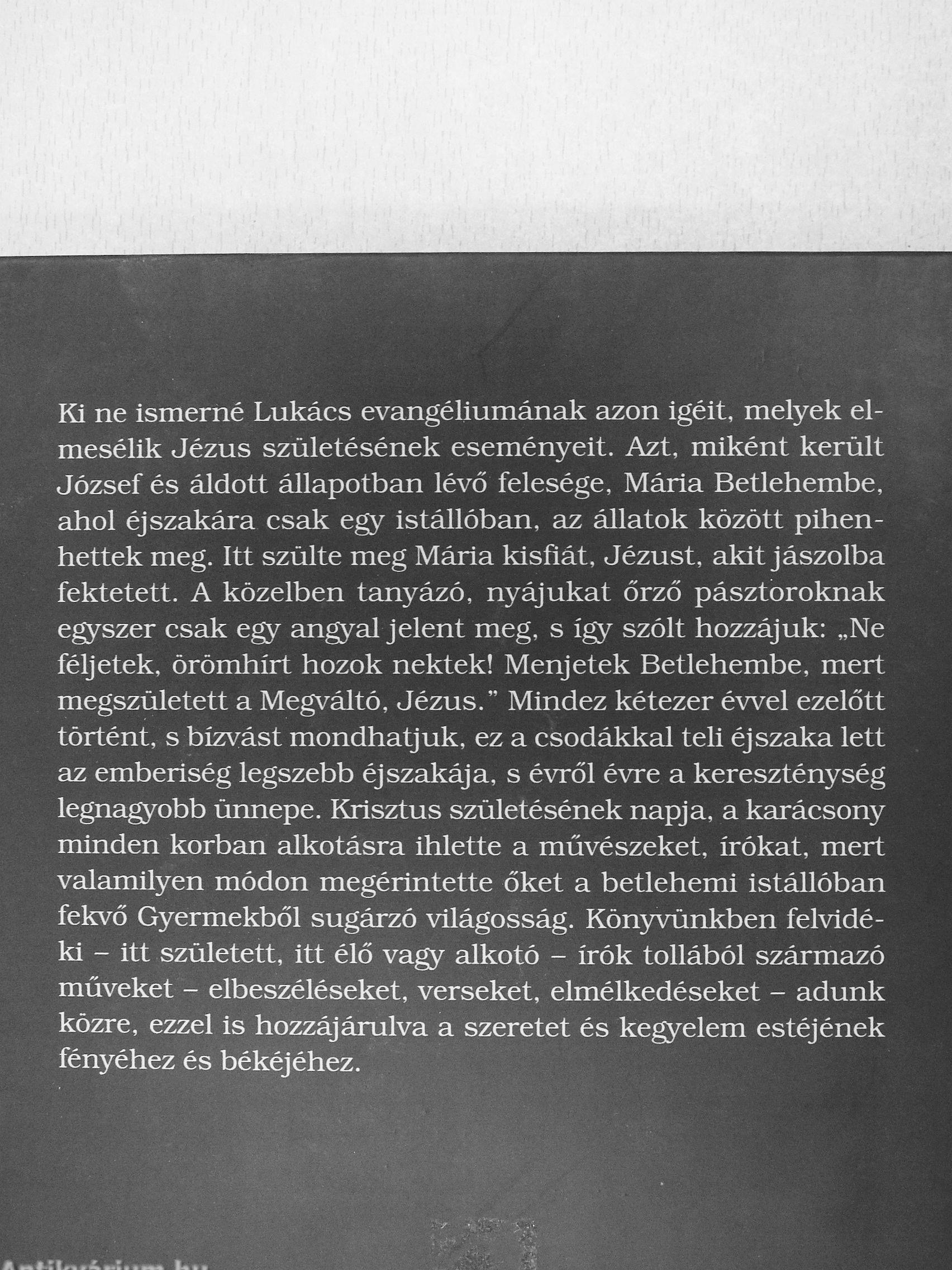 Ki ne ismerné Lukács evangéliumának azon igéit, melyek elmesélik Jézus születésének eseményeit. Azt, miként került József és áJdott állapotban lévő felesége, Mária Betlehembe, ahol éjszakára csak egy istállóban, az állatok között pihenhettek meg. Itt szülte meg Mária kisfiát, Jézust, akit jászolba fektetett. A közelben tanyázó, nyájukat őrző pásztoroknak egyszer csak egy angyal jelent meg, s így szólt hozzájuk: „Ne féljetek, örömhírt hozok nektek! Menjetek Betlehembe, mert megszületett a Megváltó, Jézus." Mindez kétezer évvel ezelőtt történt, s bízvást mondhatjuk, ez a csodákkal teli éjszaka lett az emberiség legszebb éjszakája, s évről évre a kereszténység legnagyobb üimepe. Krisztus születésének napja, a karácsony minden korban alkotásra ihlette a művészeket, írókat, mert valamilyen módon megérintette őket a betlehemi istállóban fekvő Gyermekből sugárzó világosság. Könyvünkben felvidéki - itt született, itt élő vagy alkotó - írók tollából származó műveket - elbeszéléseket, verseket, elmélkedéseket - adunk közre, ezzel is hozzájárulva a szeretet és kegyelem estéjének fényéhez és békéjéhez. Vissza