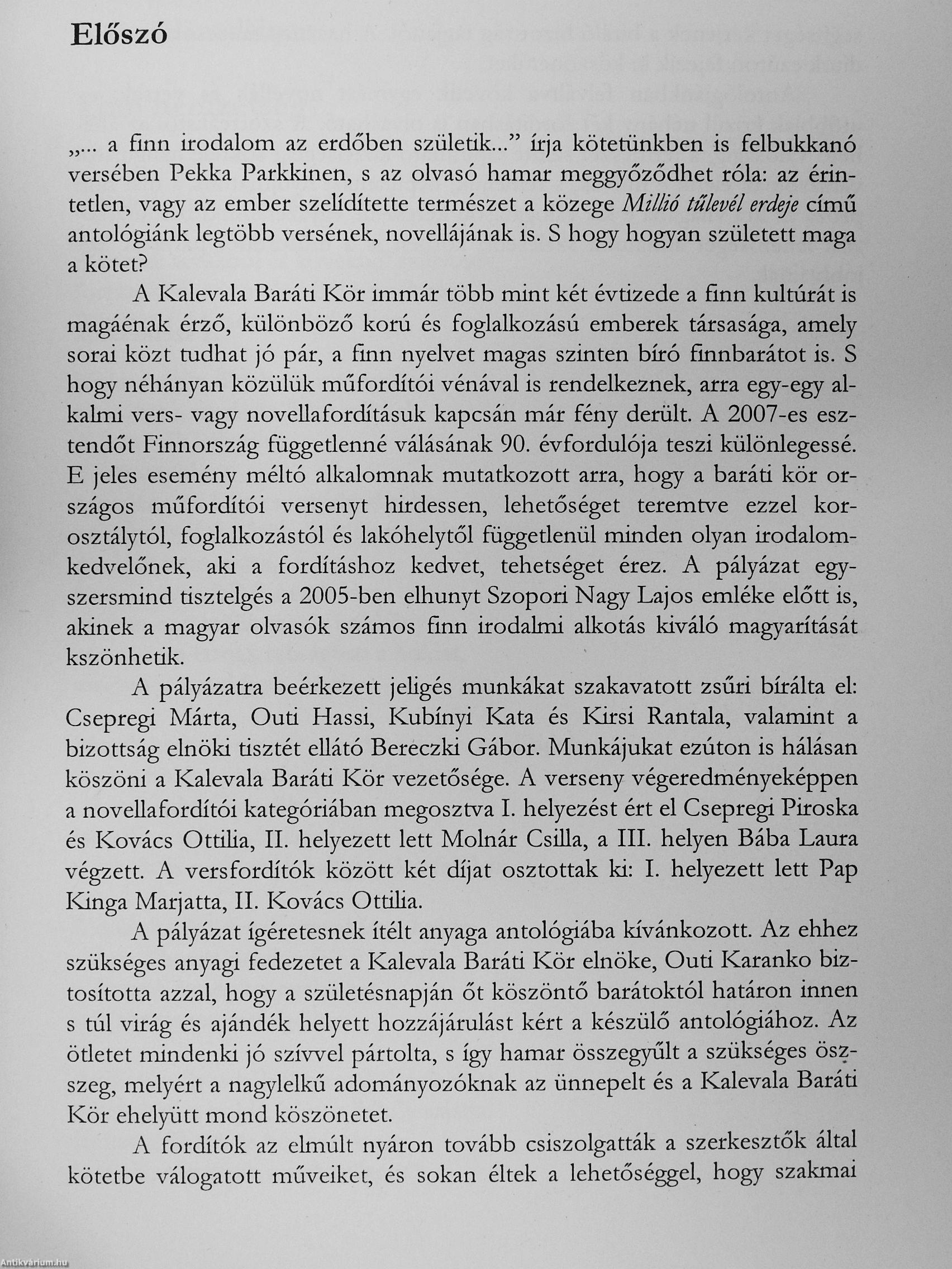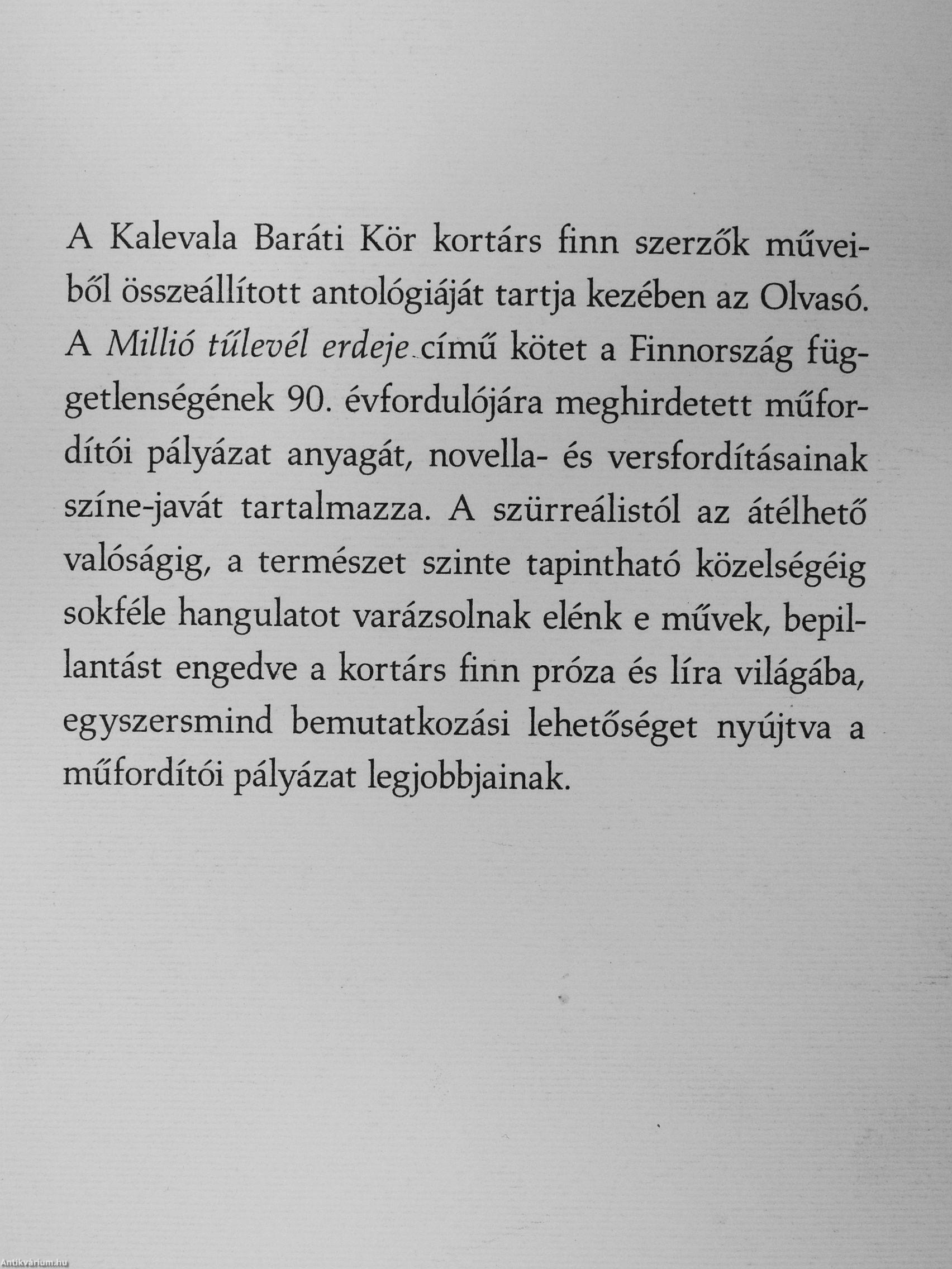 A Kalevala Baráti Kör kortárs finn szerzők műveiből összeállított antológiáját tartja kezében az Olvasó. A Millió tülevél erdeje, című kötet a Finnország függetlenségének 90. évfordulójára meghirdetett műfordítói pályázat anyagát, novella- és versfordításainak színe-javát tartalmazza. A szürreálistól az átélhető valóságig, a természet szinte tapintható közelségéig sokféle hangulatot varázsolnak elénk e művek, bepillantást engedve a kortárs finn próza és líra világába, egyszersmind bemutatkozási lehetőséget nyiijtva a műfordítói pályázat legjobbjainak.