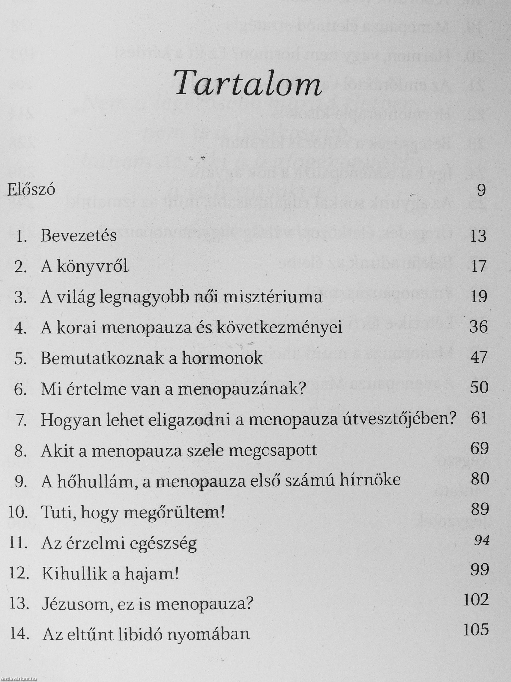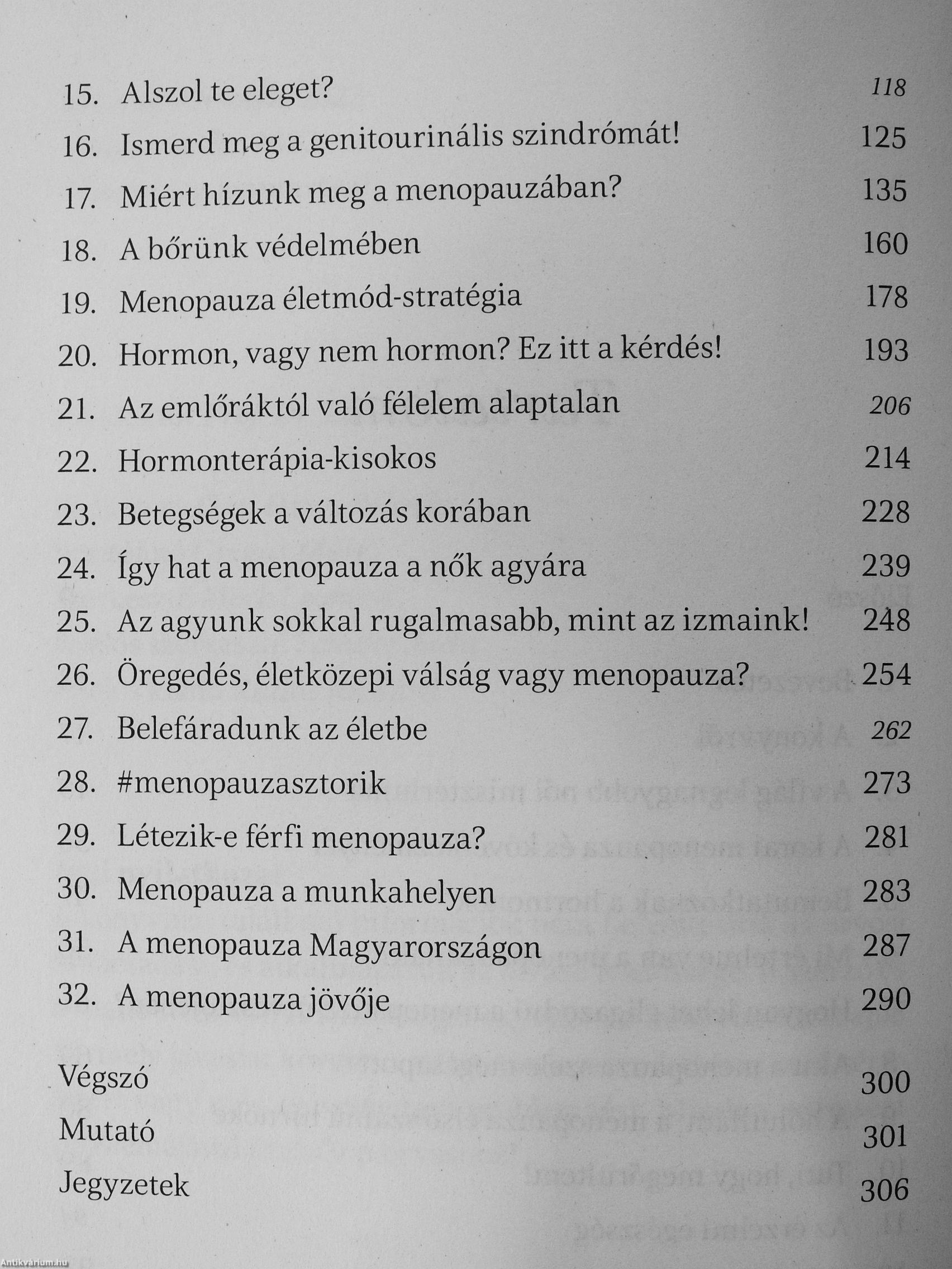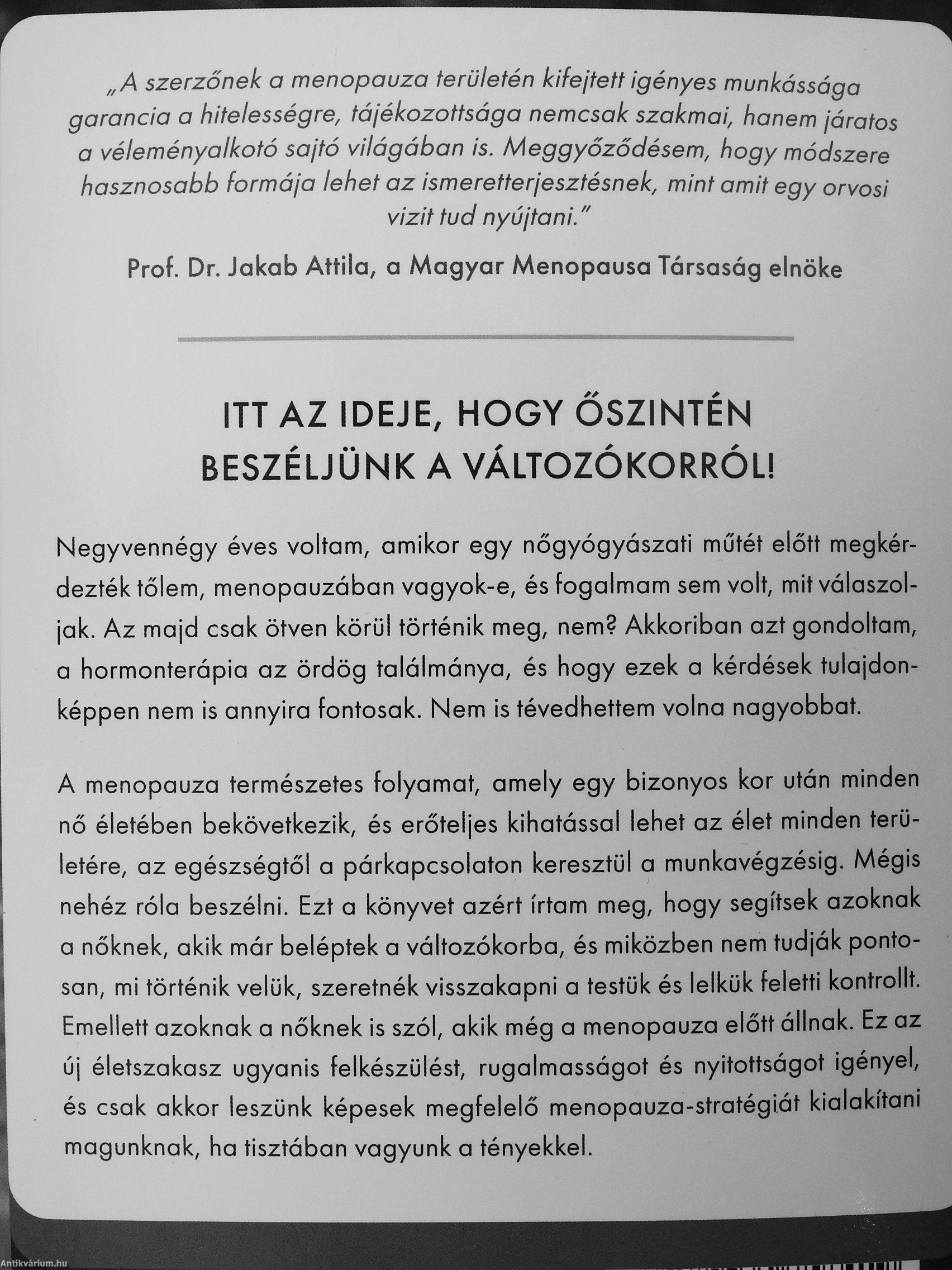 A menopauza természetes folyamat, amely egy bizonyos kor után minden nő életében bekövetkezik, és erőteljes kihatással lehet az élet minden területére, az egészségtől a párkapcsolaton keresztül a munkavégzésig. Mégis nehéz róla beszélni. Ezt a könyvet azért írtam meg, hogy segítsek azoknak a nőknek, akik már beléptek a változókorba, és miközben nem tudják pontosan, mi történik velük, szeretnék visszakapni a testük és lelkük feletti kontrollt. Emellett azoknak a nőknek is szól, akik még a menopauza előtt állnak. Ez az új életszakasz ugyanis felkészülést, rugalmasságot és nyitottságot igényel, és csak akkor leszünk képesek megfelelő menopauza-stratégiát kialakítani magunknak, ha tisztában vagyunk a tényekkel.