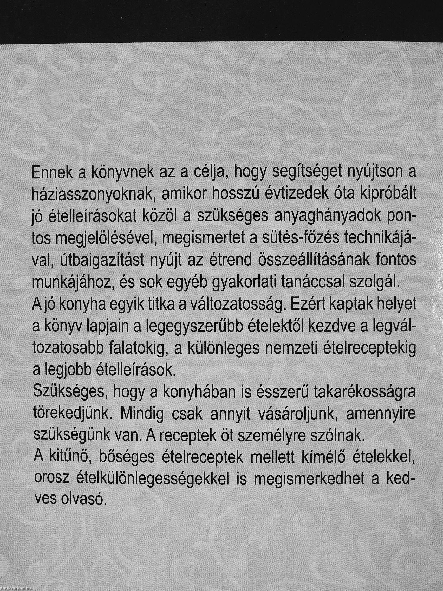 Ennek a könyvnek az a célja, hogy segítséget nyújtson a háziasszonyoknak, amikor hosszú évtizedek óta kipróbált jó ételleírásokat közöl a szükséges anyaghányadok pontos megjelölésével, megismertet a sütés-főzés technikájával, útbaigazítást nyújt az étrend összeállításának fontos munkájához, és sok egyéb gyakorlati tanáccsal szolgál. Ajó konyha egyik titka a változatosság. Ezért kaptak helyet a könyv lapjain a legegyszerűbb ételektől kezdve a legváltozatosabb falatokig, a különleges nemzeti ételreceptekig a legjobb ételleírások.