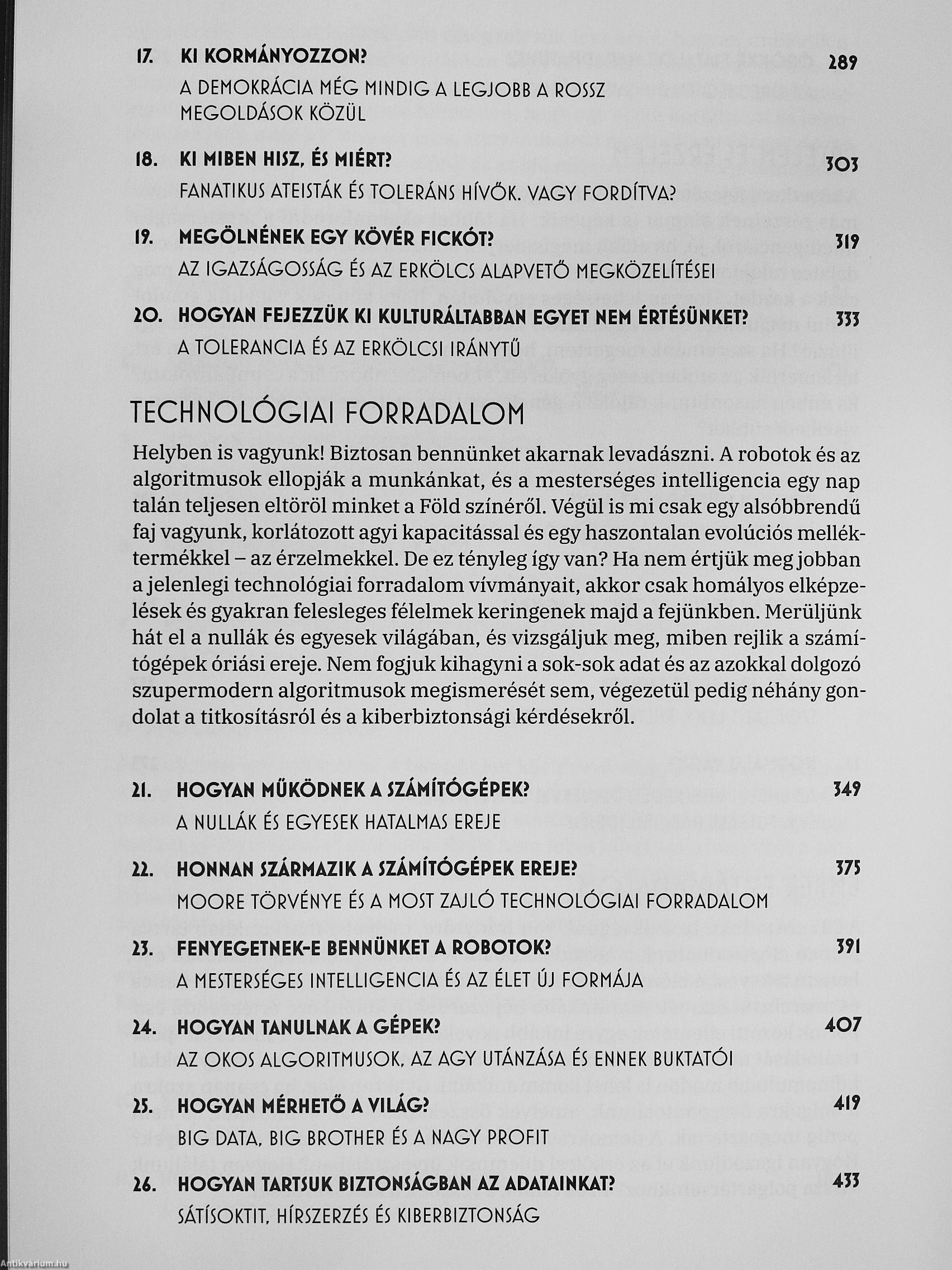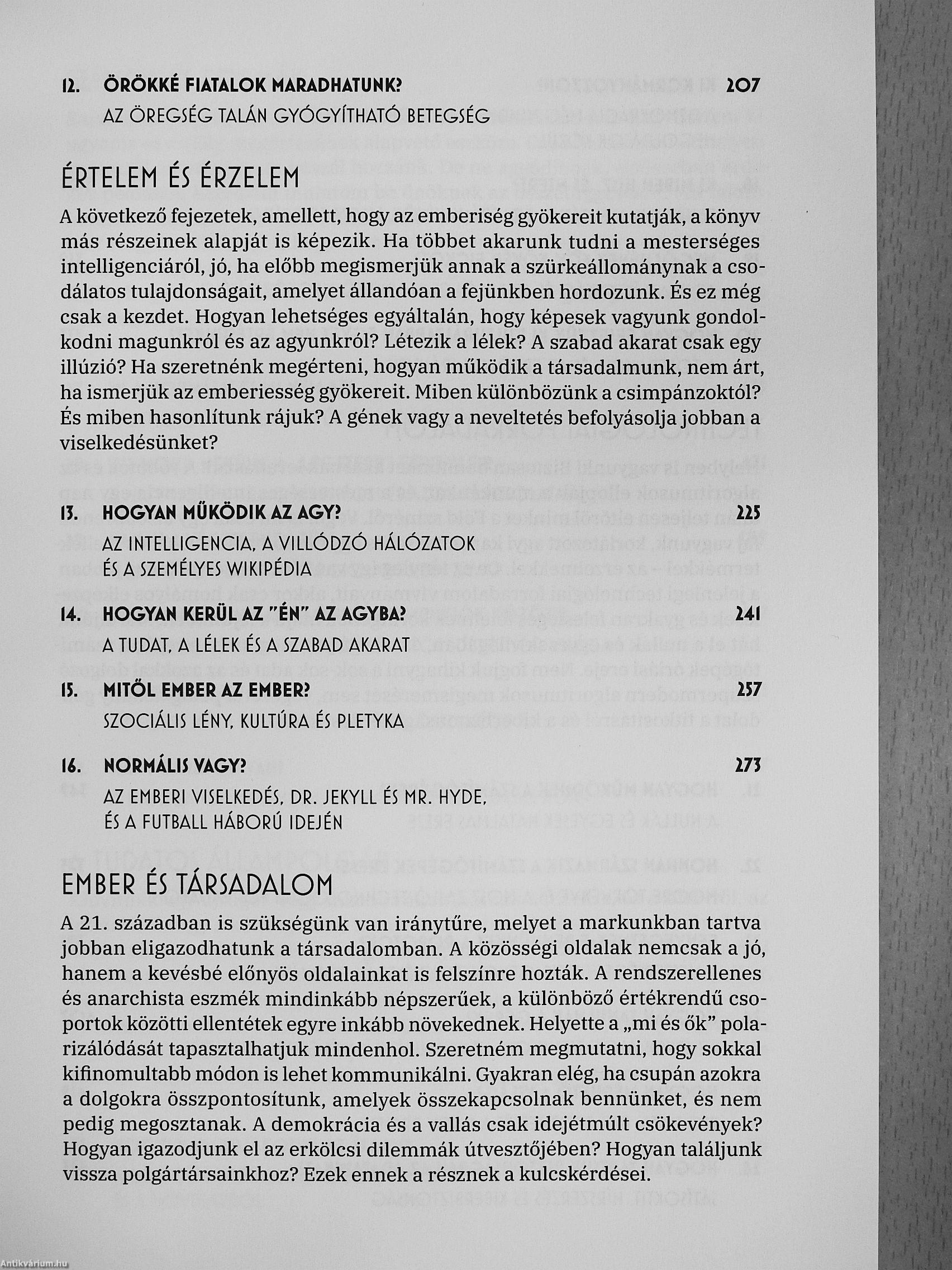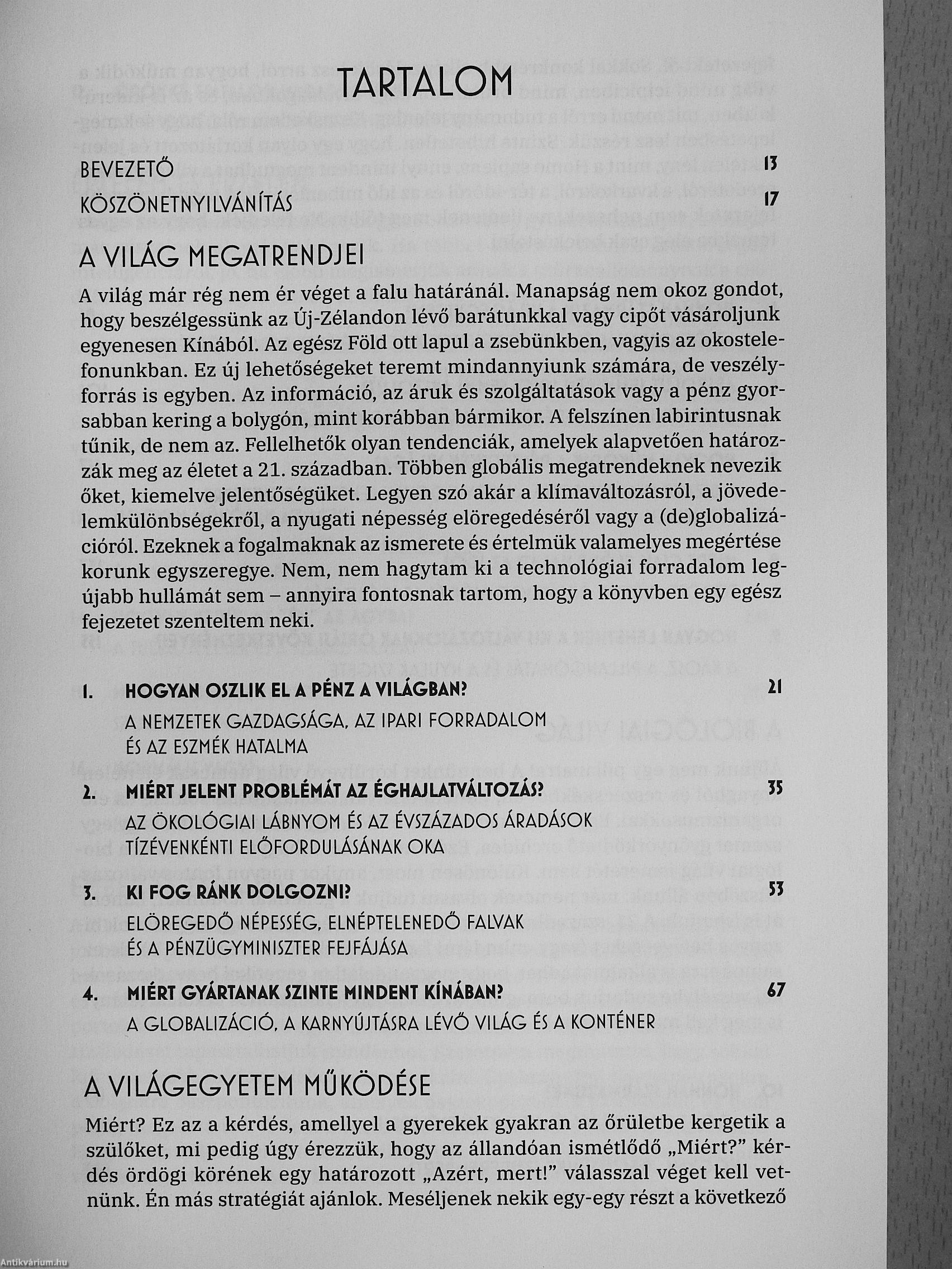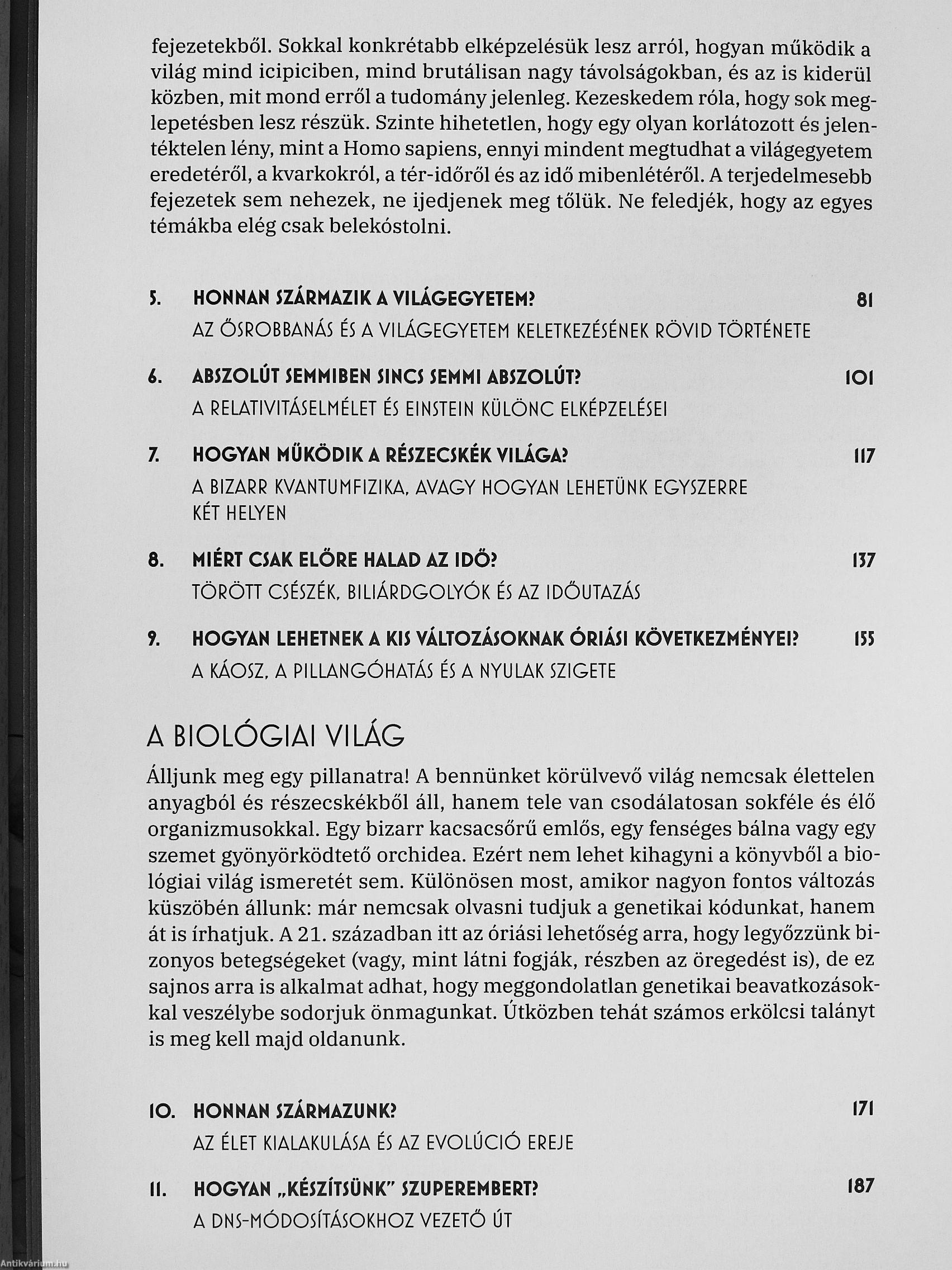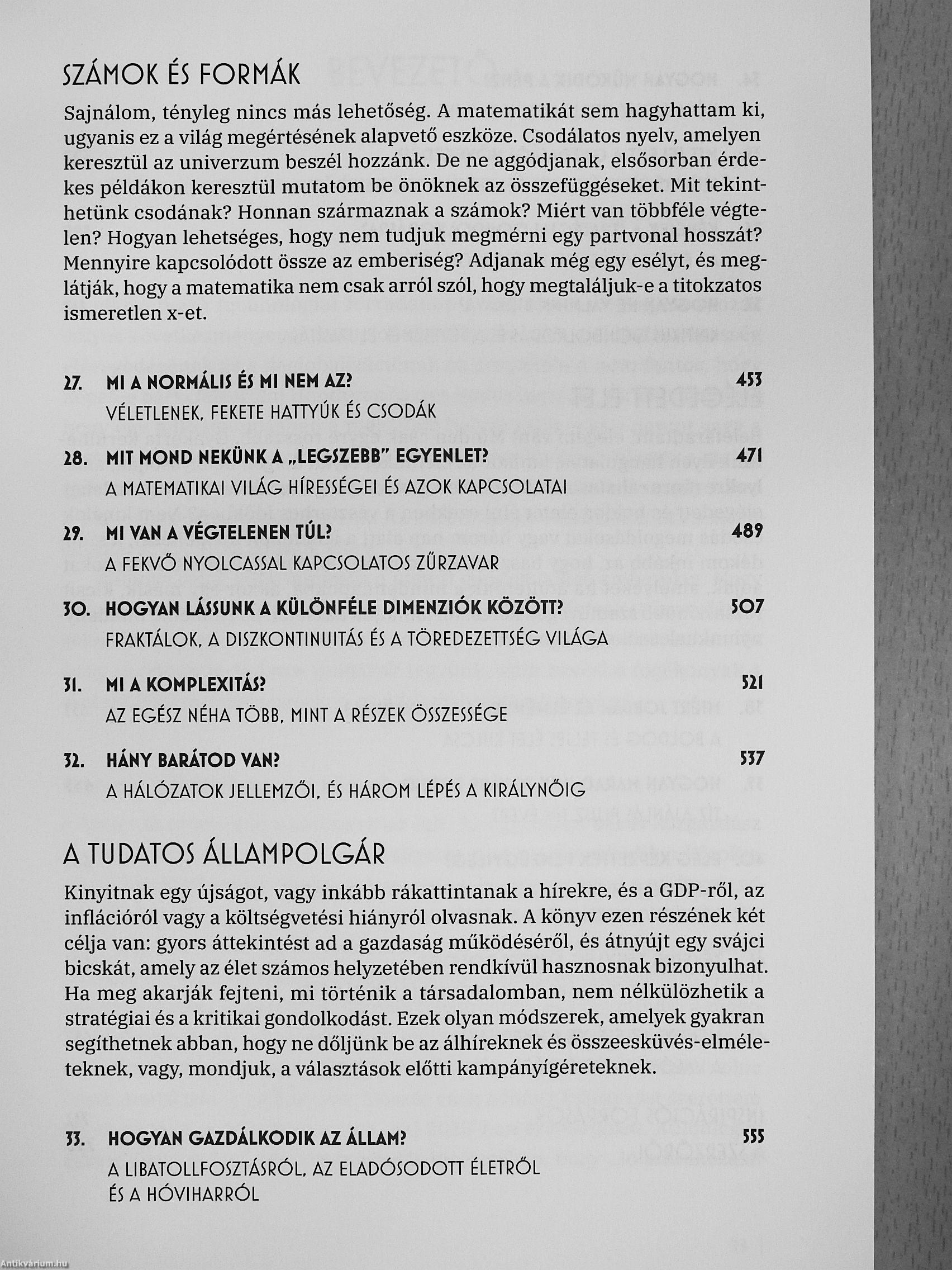 A könyv 42 fejezete kilenc egységre tagolódik: A világ megatrend-jei, A világegyetem működése, A biológiai világ, Értelem és érzelem, Ember és társadalom, A technológiai forradalom. Számok és formák, A... Tovább