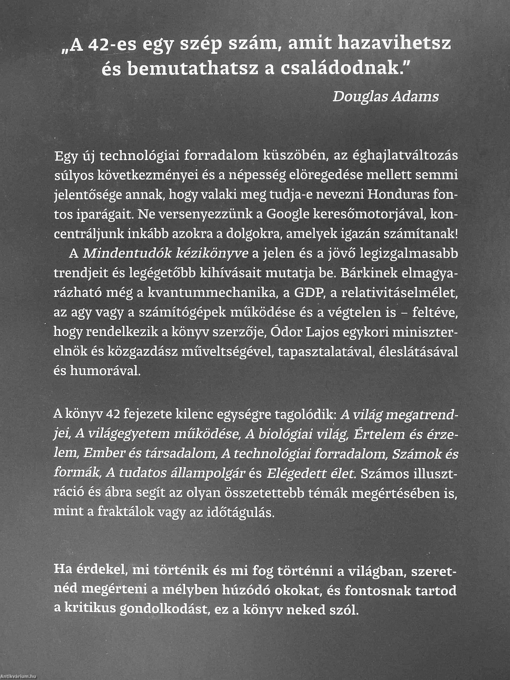 A Mindentudók kézikönyve a jelen és a jövŐ legizgalmasabb trendjeit és legégetőbb kihívásait mutatja be. Bárkinek elmagyarázható még a kvantummechanika, a GDP, a relativitáselmélet, az agy vagy a számítógépek működése és a végtelen is - feltéve, hogy rendelkezik a könyv szerzője, Ódor Lajos egykori miniszterelnök és közgazdász műveltségével, tapasztalatával, éleslátásával és humorával.