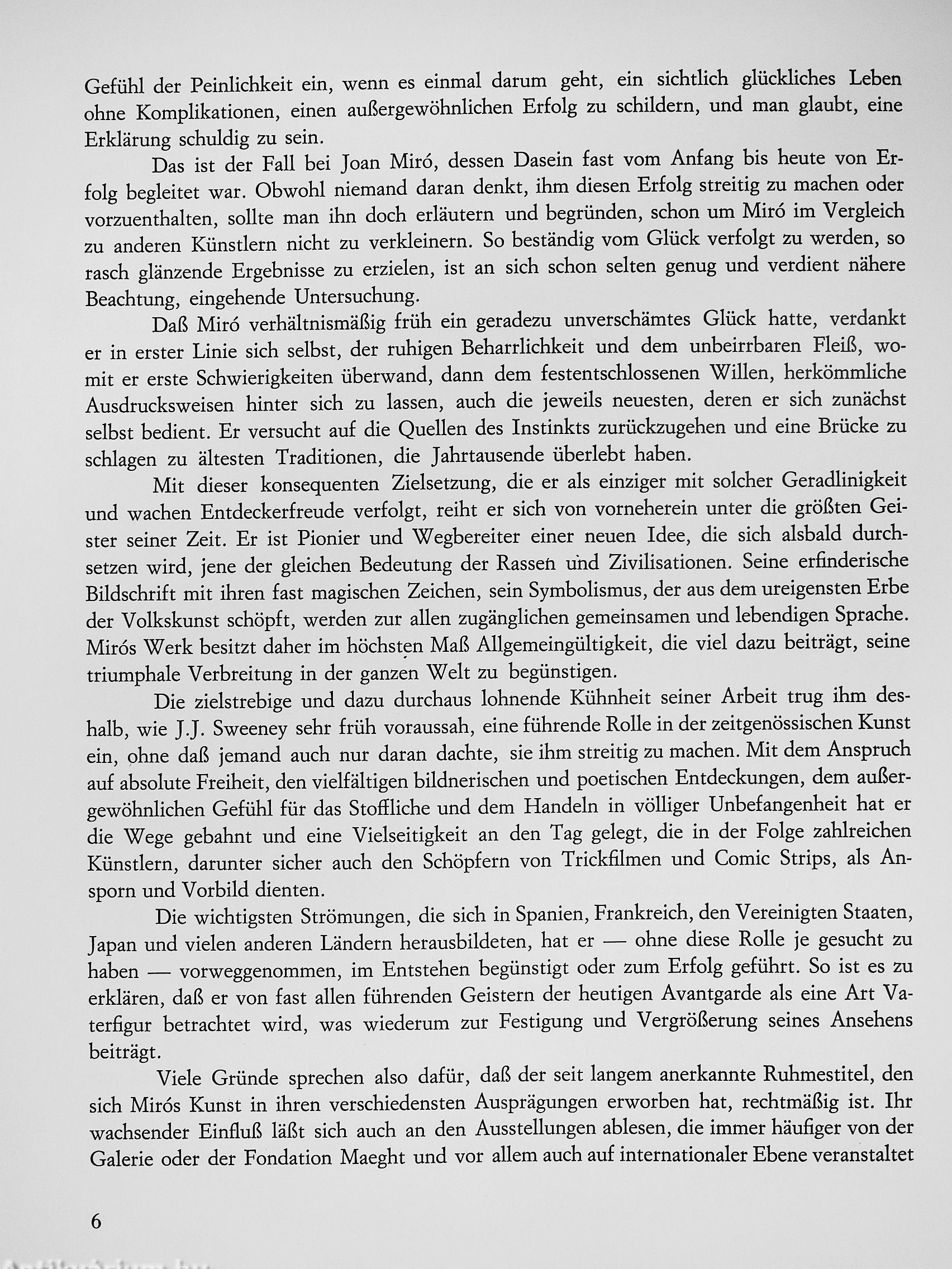 Jedenfalls aber war diese Art der Ejdstenz im Widerspruch und die daraus entspringende Weise des Schaffens nur möglich für einen außergewöhnlichen Charakter. Dem Künstler war es gegeben, das enge Verhältnis zum ursprünglichen, kindhaften Leben zu erhalten, dazu das Gefühl für das Dramatische des Lebens überhaupt, und vor allem das Wissen, in die erdgebundenen Kräfte einer Landschaft eingebettet zu sein, die noch heute weit mehr als alle anderen die Wechselfälle der Geschichte widerspiegelt: Katalanien hat sie unter dem äußerlich so zärtlichen Lächeln alle bewahrt. Miró ist das stete und geduldige Suchen gegeben, und er wußte die geheimen und magischen Zeichen der Kindheit wiederzufinden. Er hat unablässig daran gearbeitet und experimentiert, auch unter Ausnützen der Möglichkeiten, die ihm die Stiftung Fondation Maeght gab, und in grandioser Weise konnte er während der letzten Jahrzehnte seme Wirkung weltweit auf allen Gebieten nicht nur auf rechterhalten, sondern auch noch erweitern. Maßgebend dabei ist seine Fähigkeit, gegen Etablier tes aufzubegehren ebenso wie vergessene Tradition wieder zu Leben zu erwecken, alles im Grunde nach Prinzipien, die der Dadaismus unserer Zeit hinterlassen hat