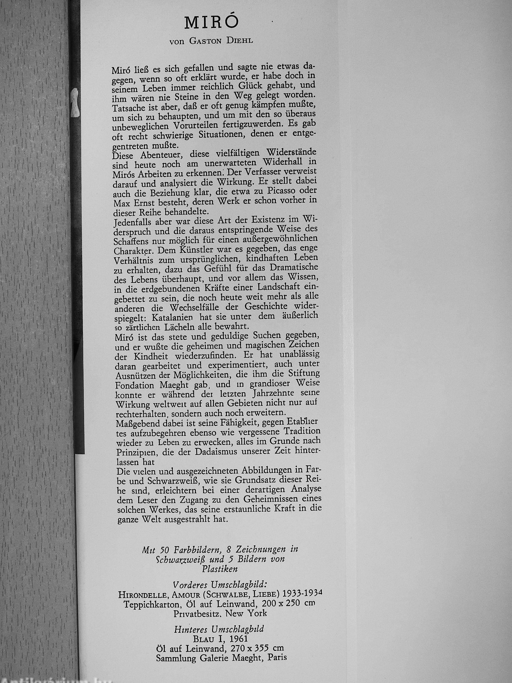 Diese Abenteuer, diese vielfältigen Widerstände sind heute noch am unerwarteten Widerhall in Miros Arbeiten zu erkennen; Der Verfasser verweist darauf und analysiert die Wirkung. Er stellt dabei auch die Beziehung klar, die etwa zu Picasso oder Max Ernst besteht, deren Werk er schon vorher in dieser Reihe behandelte.