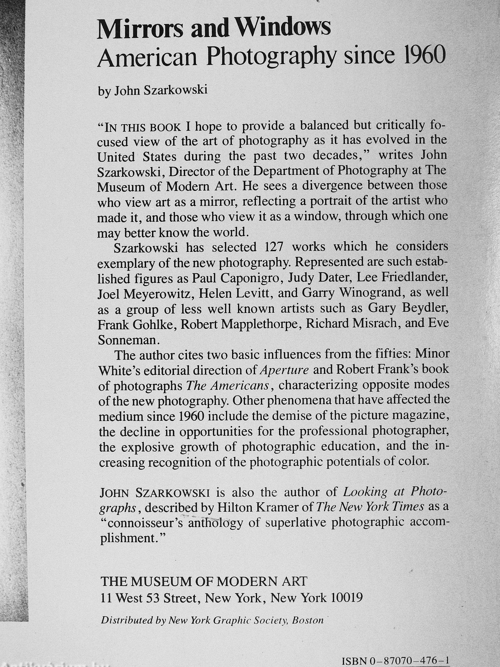 Szarkowski has selected 127 works which he considers exemplary of the new photography. Represented are such established figures as Paul Caponigro, Judy Dater, Lee Friedlander, Joel Meyerowitz, Helen Levitt, and Garry Winogrand, as well as a group of less well known artists such as Gary Beydler, Frank Gohlke, Robert Mapplethorpe, Richard Misrach, and Eve Sonneman.