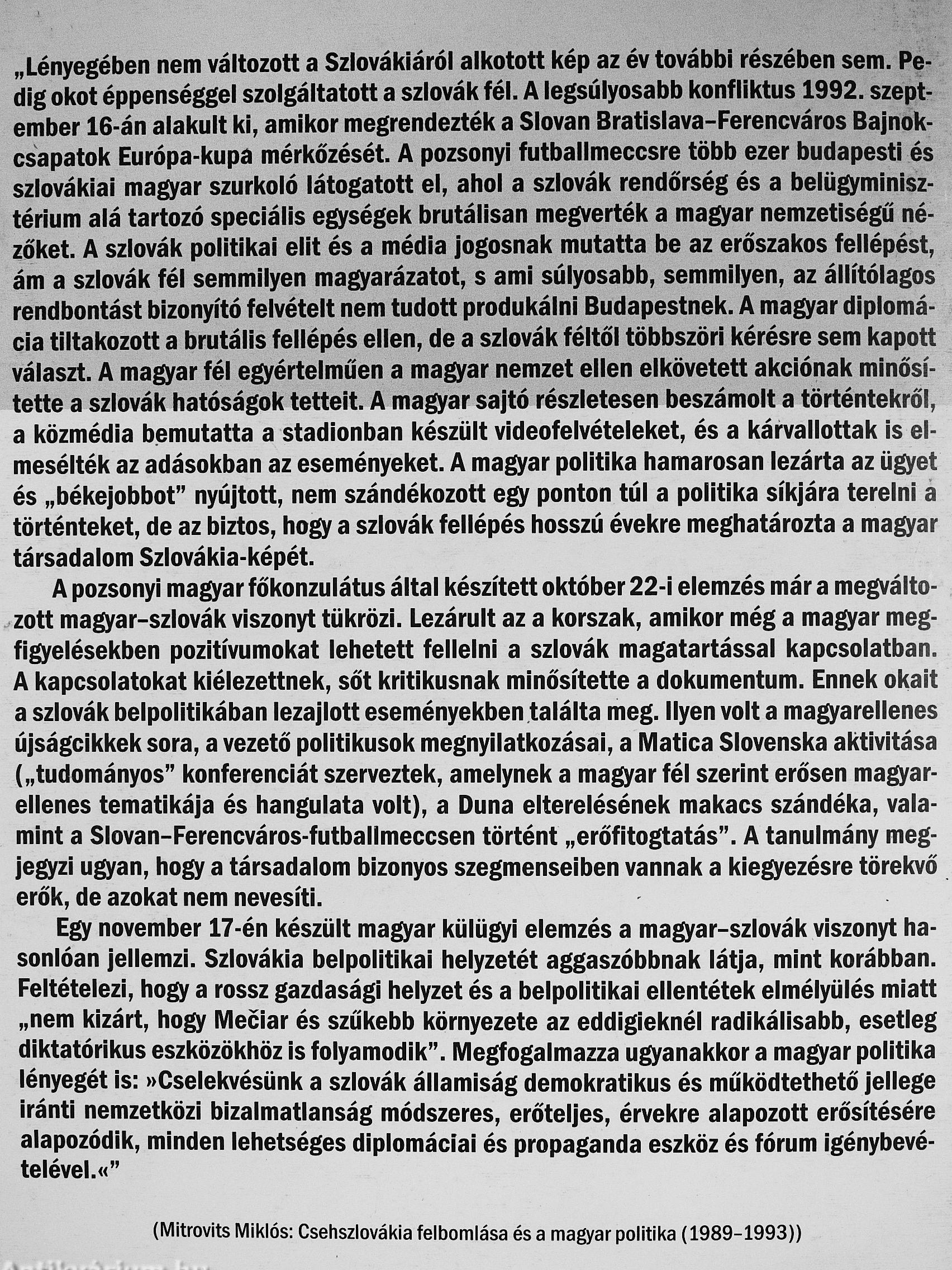 „Lényegében nem változott a Szlovákiáról alkotott kép az év további részében sem. Pedig okot éppenséggel szolgáltatott a szlovák fél. A legsúlyosabb konfliktus 1992. szeptember 16-án alakult ki, amikor megrendezték a Slovan Sratislava-Ferencváros Bajnokcsapatok Európa-kupa mérkőzését. A pozsonyi futballmeccsre több ezer budapesti és szlovákiai magyar szurkoló látogatott el, ahol a szlovák rendőrség és a belügyminisztérium alá tartozó speciális egységek brutálisan megverték a magyar nemzetiségű nézőket. A szlovák politikai elit és a média jogosnak mutatta be az erőszakos fellépést, ám a szlovák fél semmilyen magyarázatot, s ami súlyosabb, semmilyen, az állítólagos rendbontást bizonyító felvételt nem tudott produkálni Budapestnek. A magyar diplomácia tiltakozott a brutális fellépés ellen, de a szlovák féltől többszöri kérésre sem kapott választ. A magyar fél egyértelműen a magyar nemzet ellen elkövetett akciónak minősítette a szlovák hatóságok tetteit. A magyar sajtó részletesen...