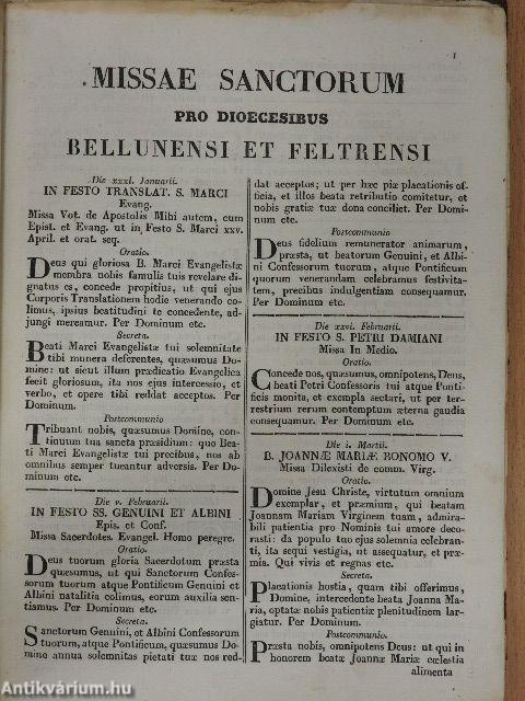| Megjegyzés: | Két mű egy könyvbe kötve. Az első művet 1800-ban, a második művet 1798-ban adták ki. A könyvbe utólagosan belekötötték a Szentmisék a Bellunói és Feltrei Egyházmegyékért, Május 24.-én tartott szentmise Boldogságos Szűz Mária ünnepén és December 8. napján Szűz Mária Szeplőtelen Fogantatásának ünnepén tartott szentmisét. |